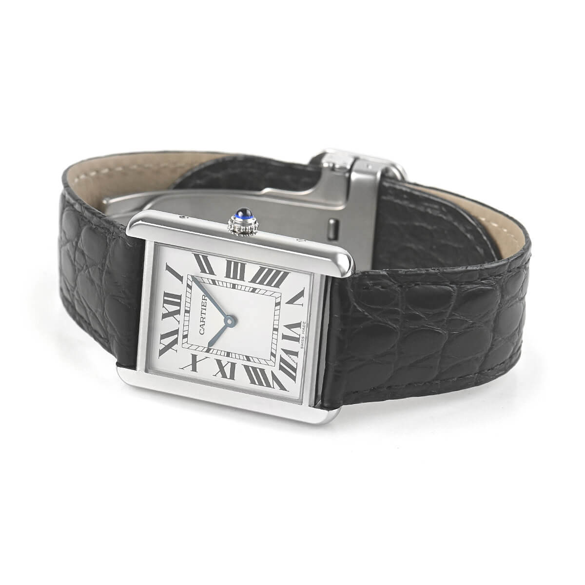 シンプルな美しさの中にブルースチールの針やローマンインデックスなど、カルティエらしさに溢れています。