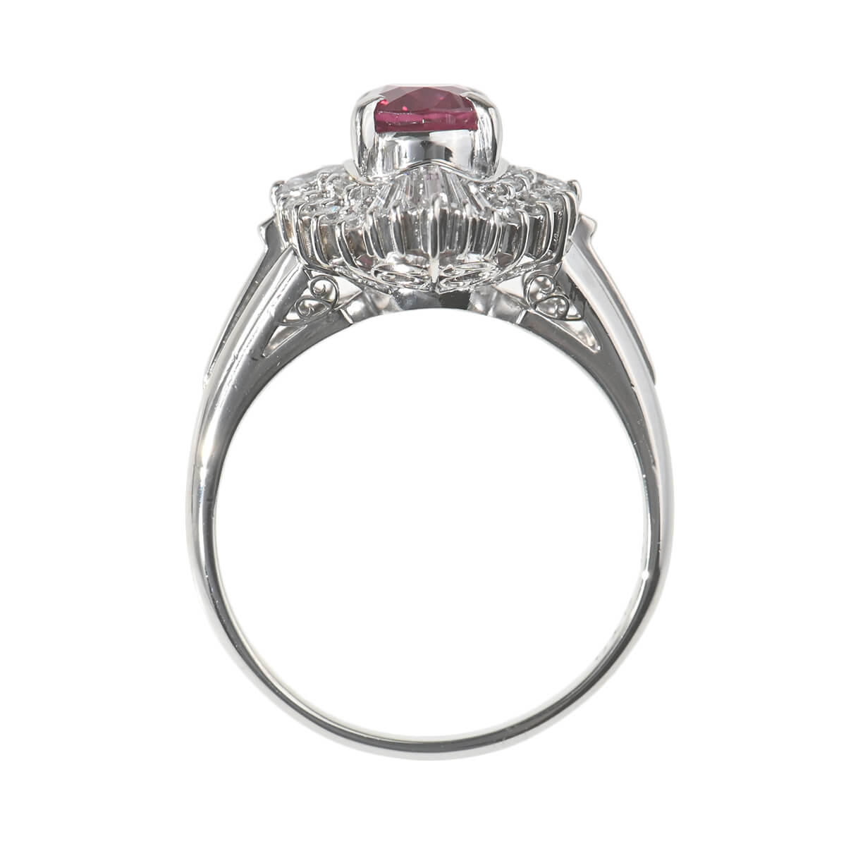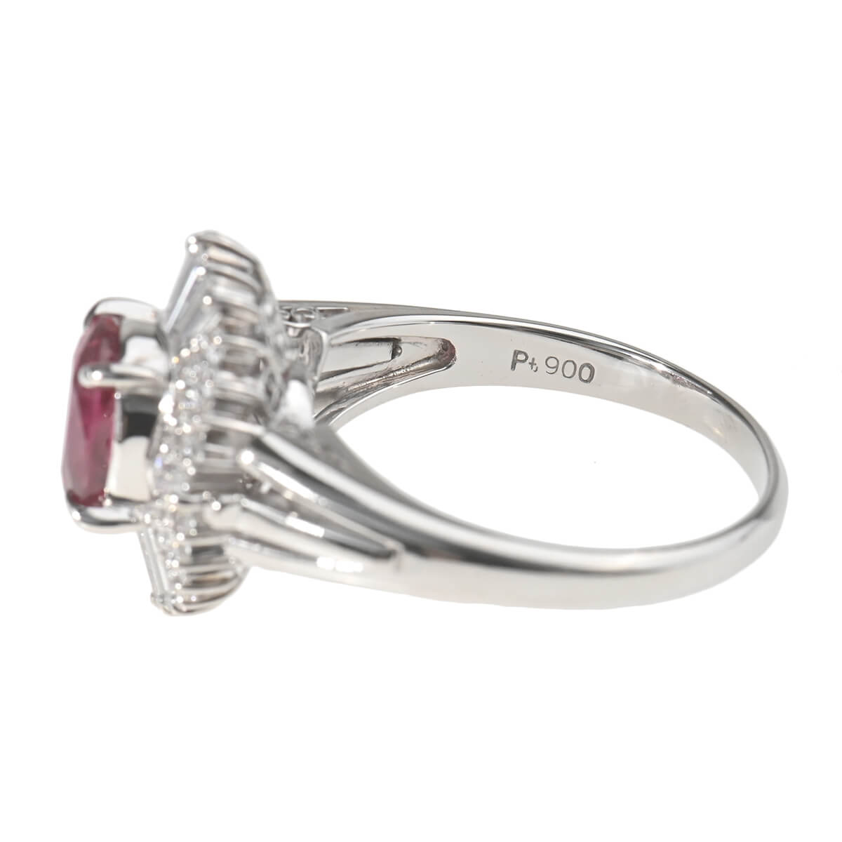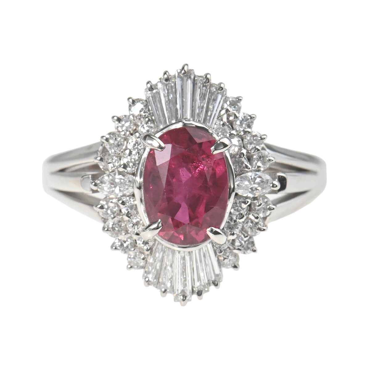 サンスクリット語で“宝石の王”を意味する「RATNARAJ(ラトナラジュ)」に由来し、“赤”を意味するラテン語の「RUBEUS(ルベウス)」から名付けられた宝石「ルビー」。歴史的にも最も重要なカラーストーンのひとつでもあるこの宝石の赤色は、不滅の炎と信じられ、情熱や深い愛情と結びつくと考えられてきました。周りを囲むテーパーやオーバル、シェイプの異なるダイヤモンドが、深紅の輝きを放つ1.95ctものルビーの美しさを一層惹きたてるプラチナ製リング。見るひとを魅了するルビーにまばゆい輝きを放つ上質なダイヤモンドをあしらい、指先を印象的に、優美に彩ります。情熱的に輝くルビーが美しいリングはデイリーのお出かけにはもちろん、ドレスアップや和装でのコーディネートも素敵です。