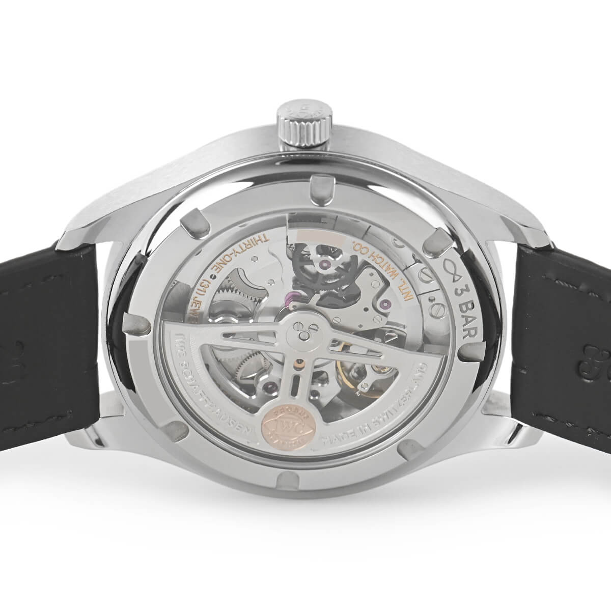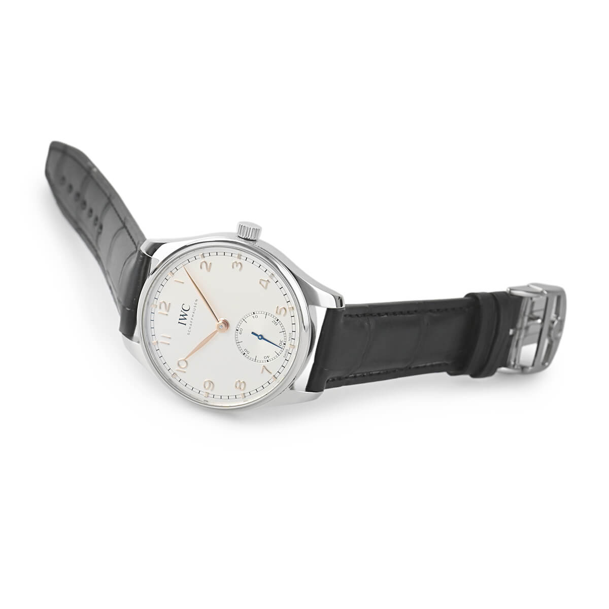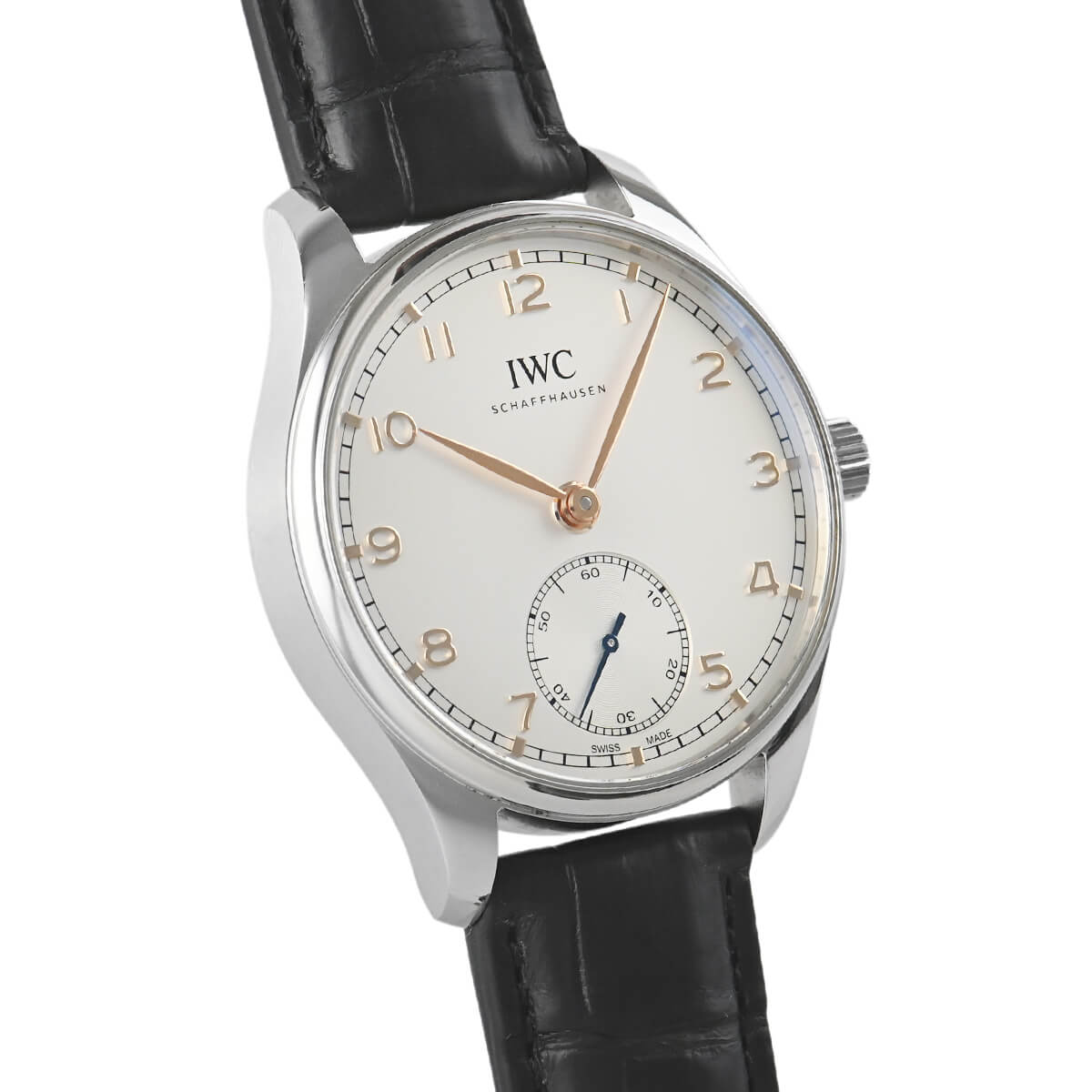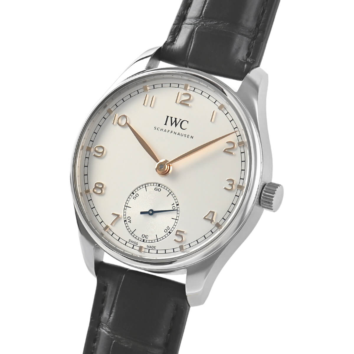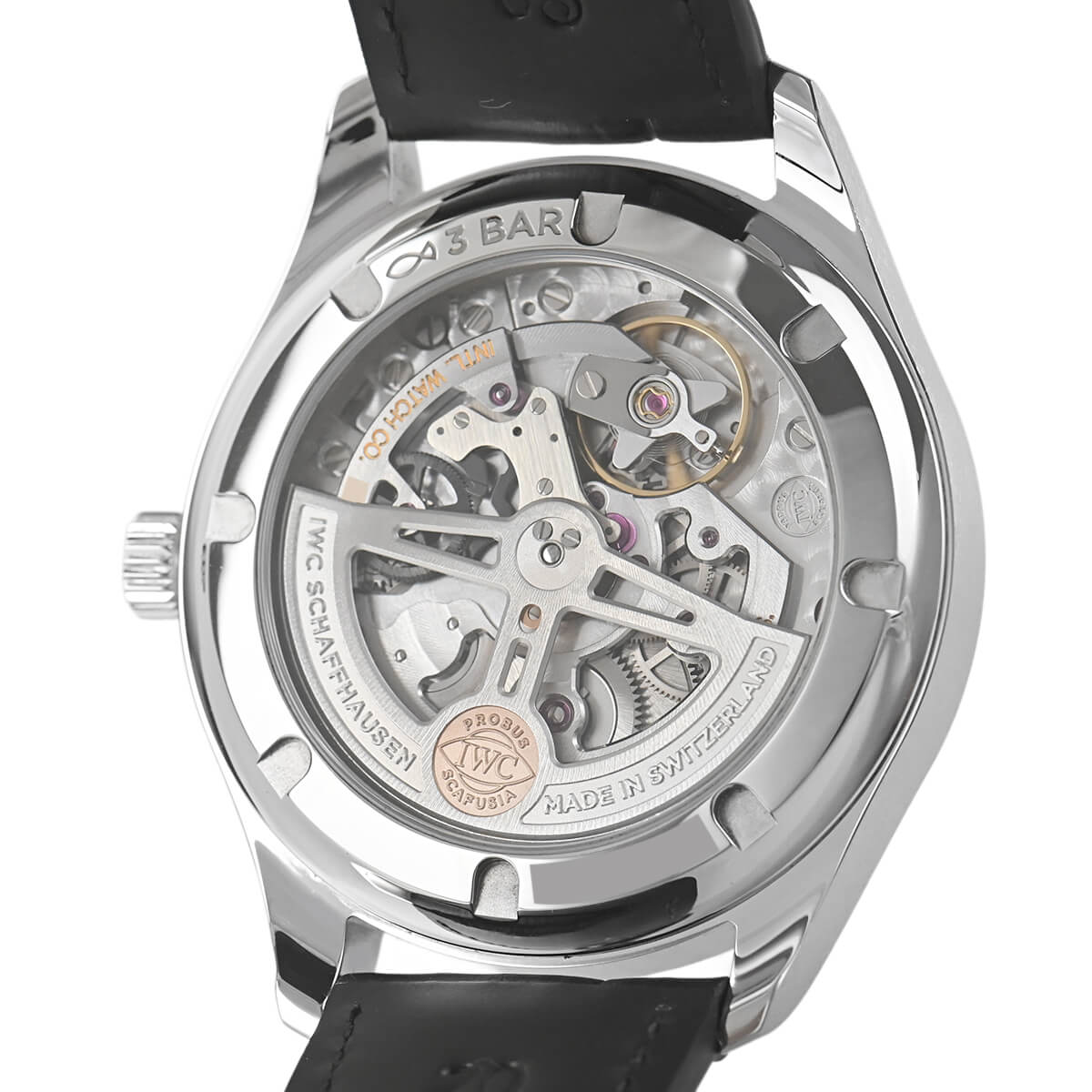 文字盤外周のレイルウェイ分目盛りと6時位置に配されたスモールセコンドは1930年代末に誕生したポルトギーゼコレクションの歴史の中で継承されてきたデザイン様式です。こちらの【ポルトギーゼ オートマティック40】は、耐摩耗性に優れたセラミックパーツをペラトン自動巻き機構に採用した60時間パワーリザーブ、自社製自動巻きキャリバー82200を搭載。