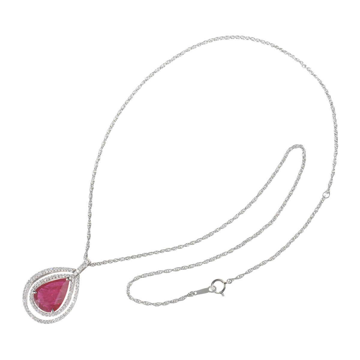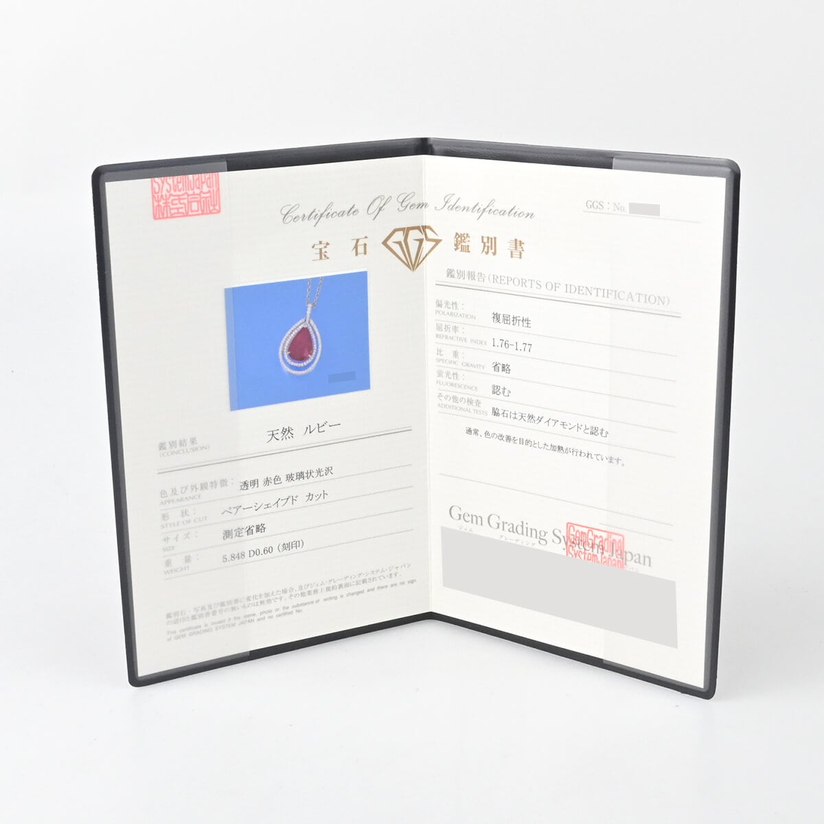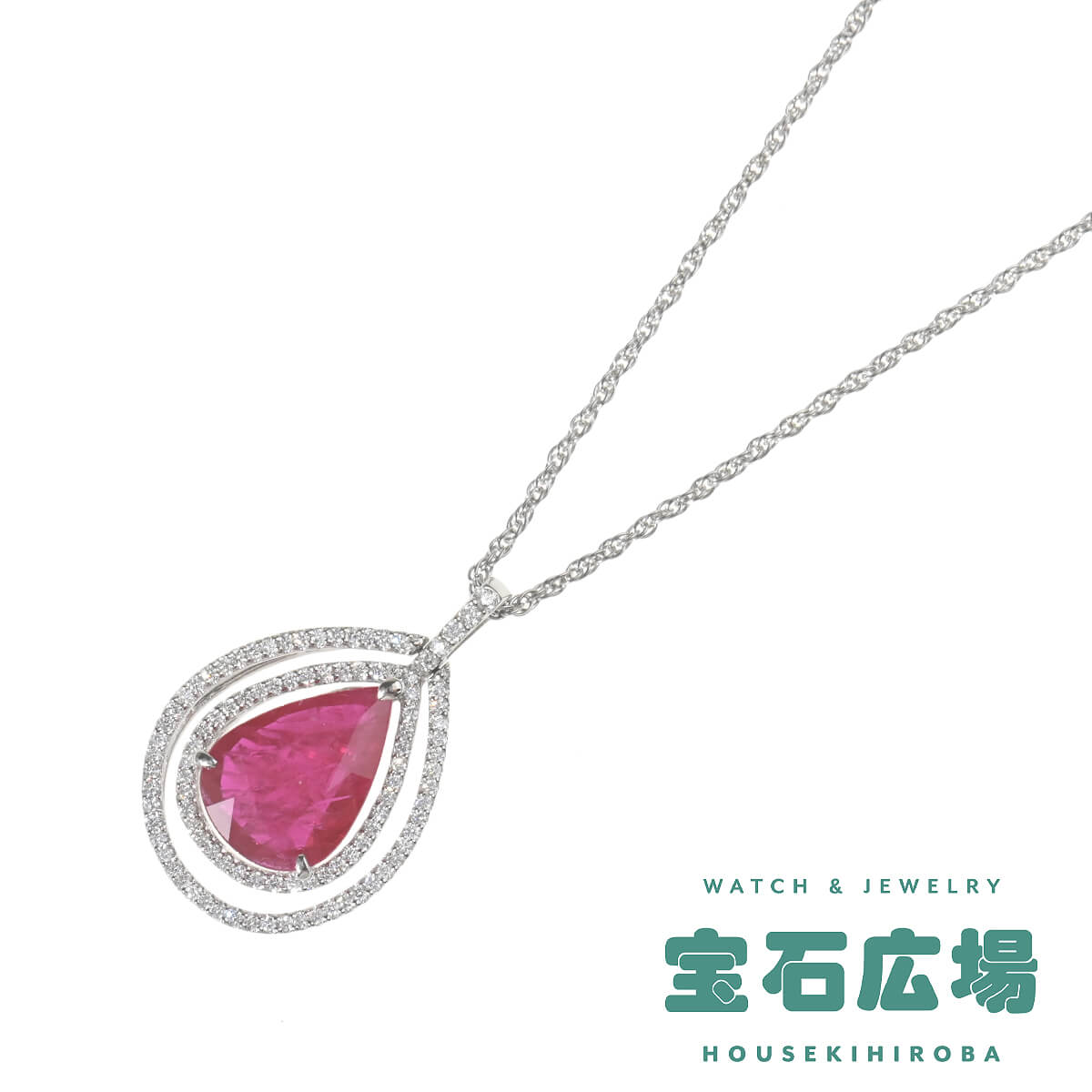 サンスクリット語で“宝石の王”を意味する「RATNARAJ(ラトナラジュ)」に由来し、“赤”を意味するラテン語の「RUBEUS(ルベウス)」から名付けられた宝石「ルビー」。歴史的にも最も重要なカラーストーンのひとつでもあるこの宝石の赤色は、不滅の炎と信じられ、情熱や深い愛情と結びつくと考えられてきました。0.60ctのダイヤモンドが描くラインに囲まれた、5.848ctもの深紅のペアシェイプルビーが魅惑的な美しさを放つ、ボリュームたっぷりのプラチナ製ペンダントネックレスです。大粒のルビーに引けを取らない存在感をもつ、重厚感あるデザインチェーンとあいまってスタイリングを大胆な美しさで印象づけます。