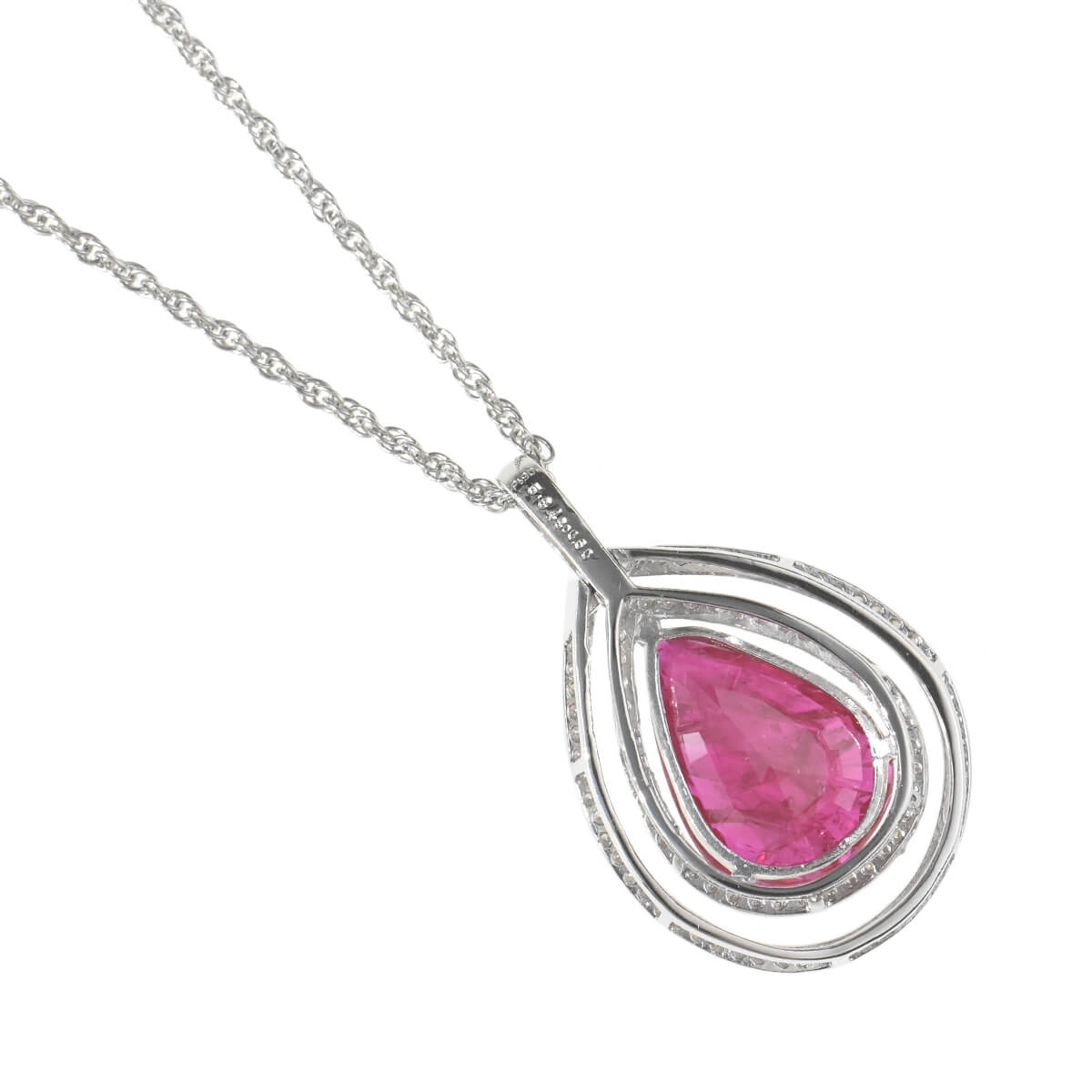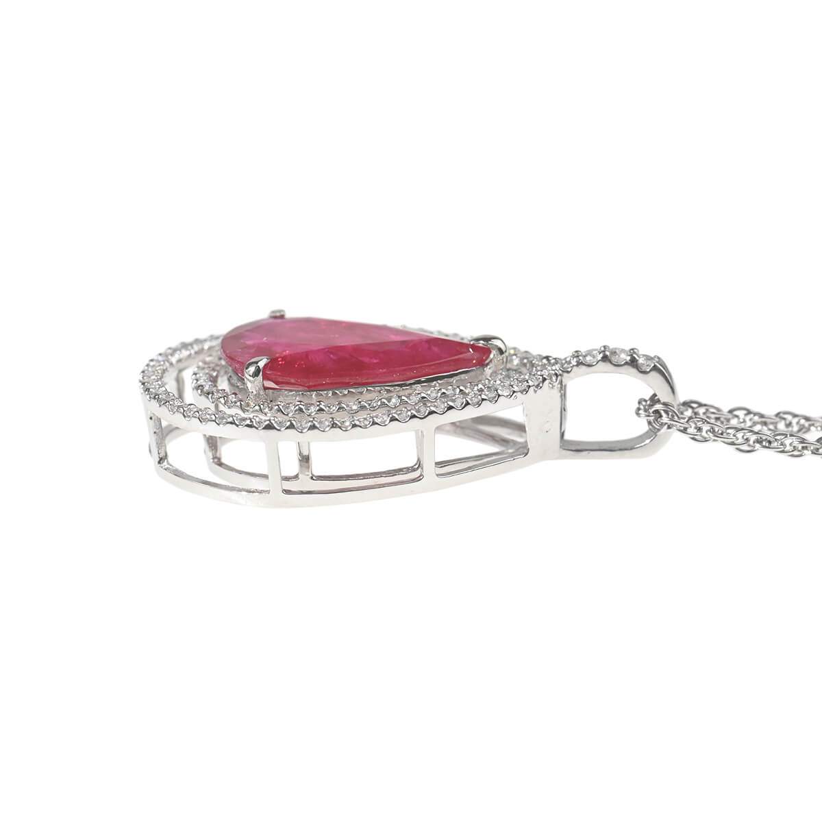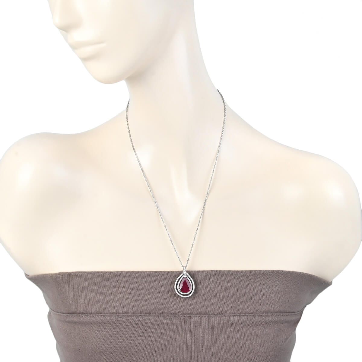 サンスクリット語で“宝石の王”を意味する「RATNARAJ(ラトナラジュ)」に由来し、“赤”を意味するラテン語の「RUBEUS(ルベウス)」から名付けられた宝石「ルビー」。歴史的にも最も重要なカラーストーンのひとつでもあるこの宝石の赤色は、不滅の炎と信じられ、情熱や深い愛情と結びつくと考えられてきました。0.60ctのダイヤモンドが描くラインに囲まれた、5.848ctもの深紅のペアシェイプルビーが魅惑的な美しさを放つ、ボリュームたっぷりのプラチナ製ペンダントネックレスです。大粒のルビーに引けを取らない存在感をもつ、重厚感あるデザインチェーンとあいまってスタイリングを大胆な美しさで印象づけます。