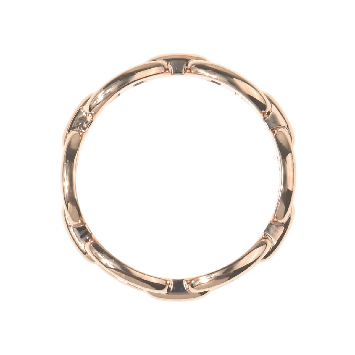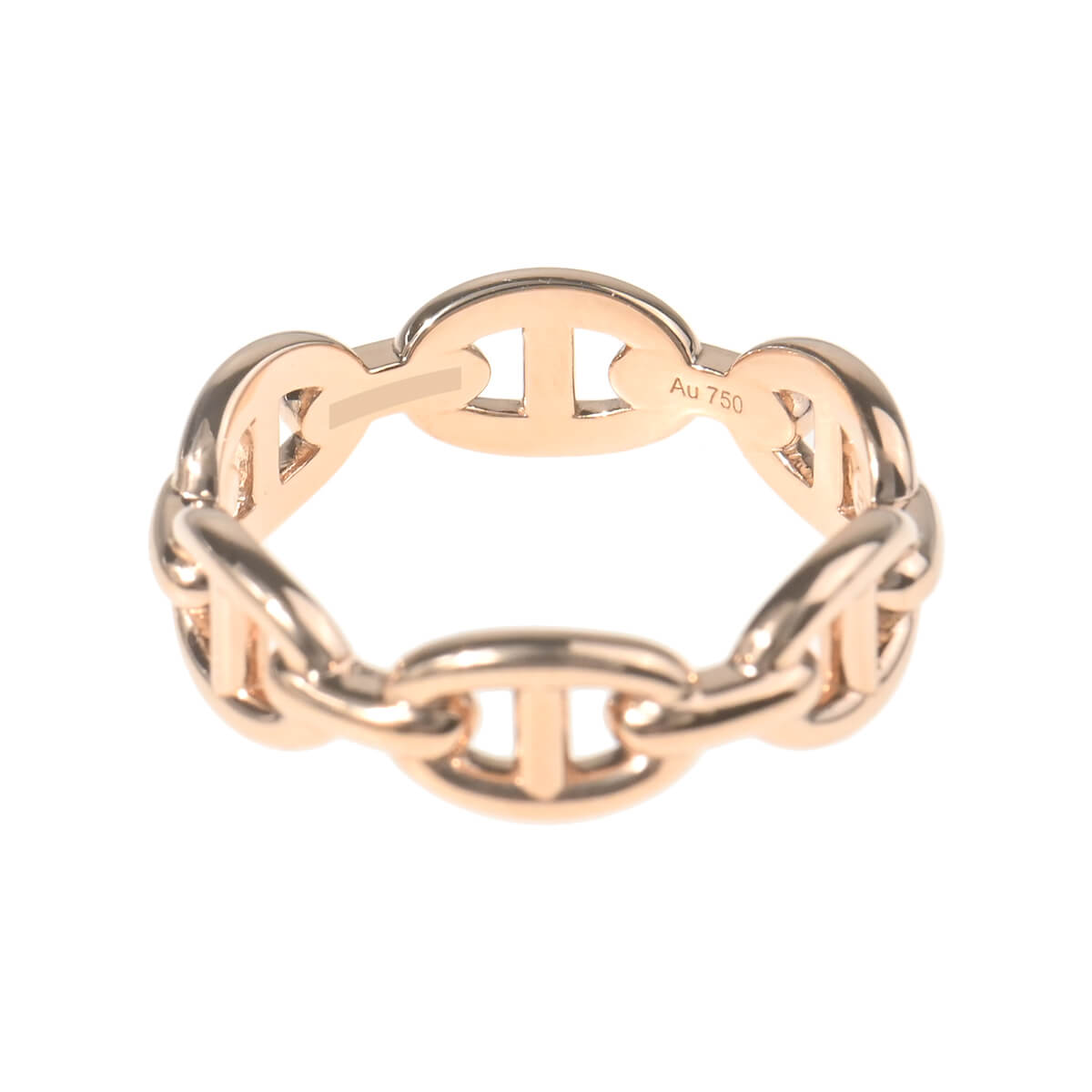 1938年にエルメス家の一員であり当時のエルメスの社長であったロベール・デュマ=エルメスが、ふと船の錨のチェーンに目を留め、そのシルエットに惹かれ、そのチェーンを元にデザインしたブレスレットを作ったことにはじまった「シェーヌ・ダンクル」コレクション。インスピレーションの源であった“錨の鎖(Chaine d’ancre)”をそのままモデル名に冠したこのコレクションは、鎖で強く結ばれた絆を象徴しているそう。最初のブレスレット誕生後も艶出しにしたり、丸い粒状にしたり、ひねったりと、コマの形や大きさを変え、ネックレスやリング、ピアス、ブレスレットとつぎつぎに新しい姿を見せ、メゾンを代表するコレクションのひとつとなった「シェーヌ・ダンクル」。その中でも定番人気モデル「シェーヌ・ダンクル・アンシェネ」の、ピンクゴールド製リングです。1周連なる「シェーヌ・ダンクル」のオブジェが指先を飾りスタイリングをお洒落に引き立てる、一流メゾンのトレンドジュエリーです。