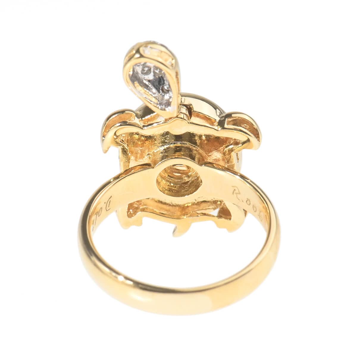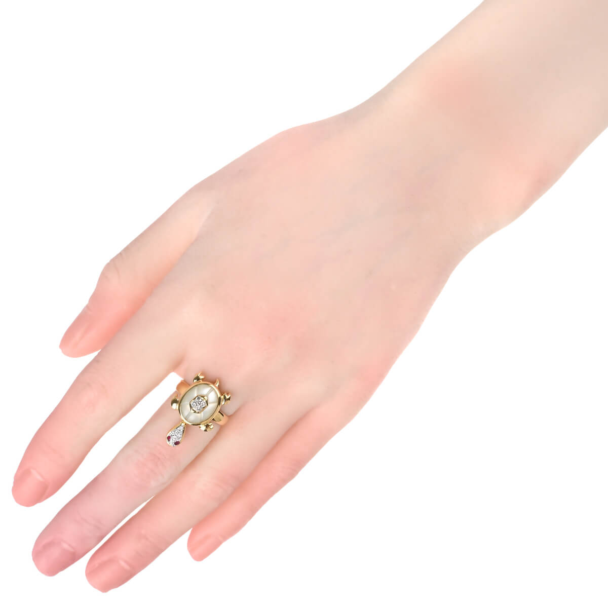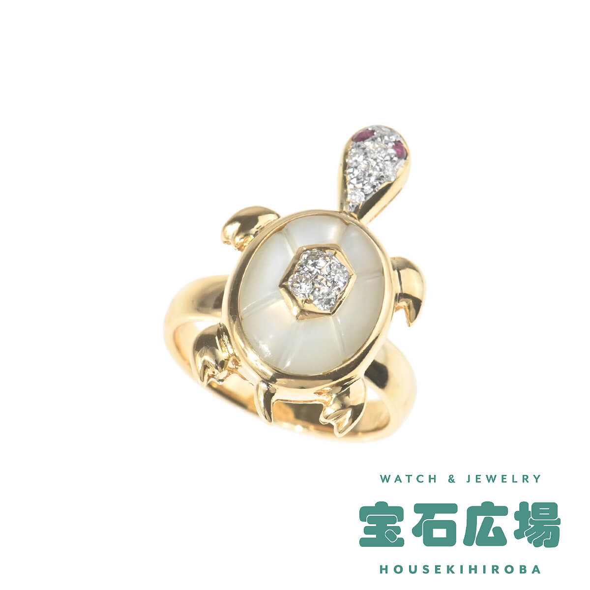 イタリア、フィレンツェ最古の橋であり、建造以来橋上に金細工師の商店が並んでいた、アルノ川にかかる石造アーチの橋“ポンテヴェキオ橋”の名を冠した『PonteVecchio(ポンテヴェキオ)』は、1981年の創業以来“Romantic Luxury(ロマンティック ラグジュアリー)”をキーワードに、ジュエリーが紡ぎだすロマンティックな物語や熟練の職人技術によって表現されるラグジュアリーな価値を、遊び心あふれるファインジュエリーに昇華し続けています。愛らしいフォルムのカメをゴールドアームにあしらった、イエローゴールド製リング。甲羅をホワイトシェルとダイヤモンドで表現し、つぶらな瞳にはルビーがセッティングされたカメは美しい愛らしさにあふれています。カメの頭が左右に揺れる、ギミックの効いた大人の遊び心あふれるファインジュエリーはコレクションにも。ポンテヴェキオらしいポップでキュートな個性をもった、美しく上質なファインジュエリーです。