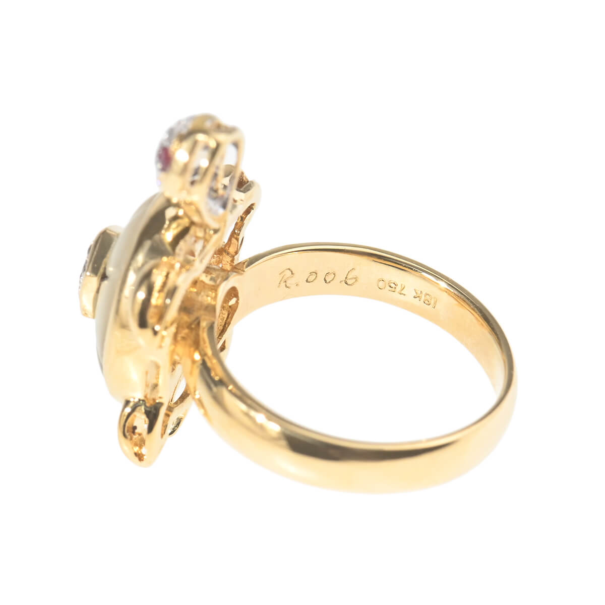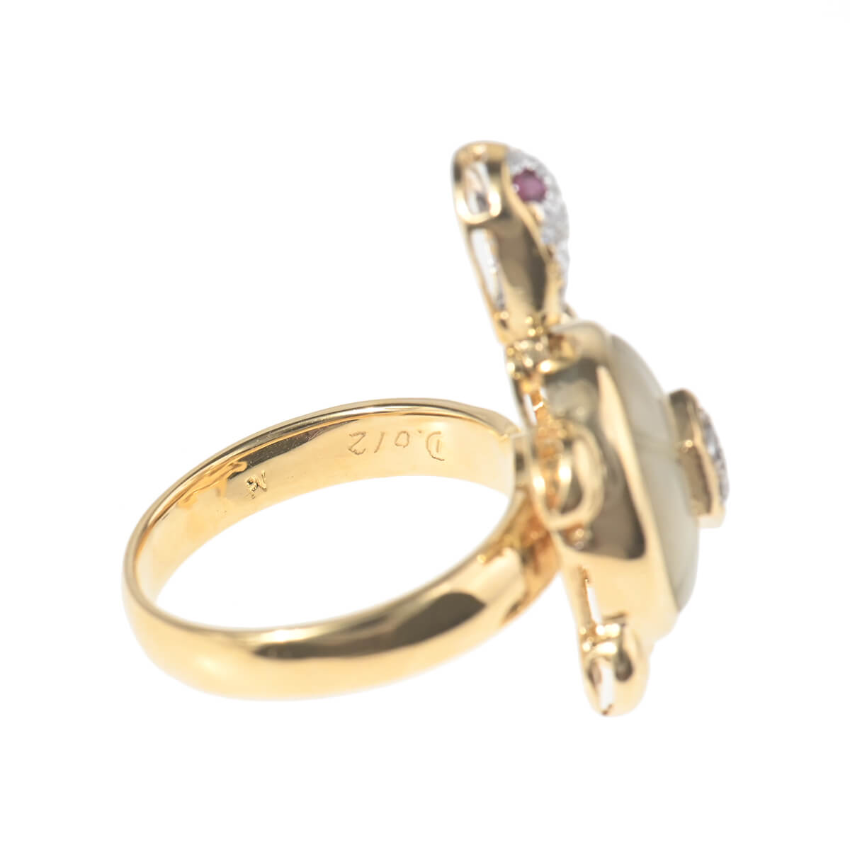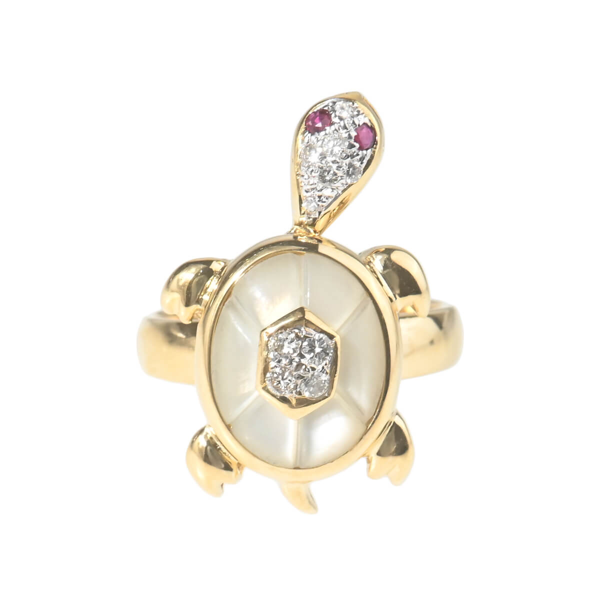 イタリア、フィレンツェ最古の橋であり、建造以来橋上に金細工師の商店が並んでいた、アルノ川にかかる石造アーチの橋“ポンテヴェキオ橋”の名を冠した『PonteVecchio(ポンテヴェキオ)』は、1981年の創業以来“Romantic Luxury(ロマンティック ラグジュアリー)”をキーワードに、ジュエリーが紡ぎだすロマンティックな物語や熟練の職人技術によって表現されるラグジュアリーな価値を、遊び心あふれるファインジュエリーに昇華し続けています。愛らしいフォルムのカメをゴールドアームにあしらった、イエローゴールド製リング。甲羅をホワイトシェルとダイヤモンドで表現し、つぶらな瞳にはルビーがセッティングされたカメは美しい愛らしさにあふれています。カメの頭が左右に揺れる、ギミックの効いた大人の遊び心あふれるファインジュエリーはコレクションにも。ポンテヴェキオらしいポップでキュートな個性をもった、美しく上質なファインジュエリーです。