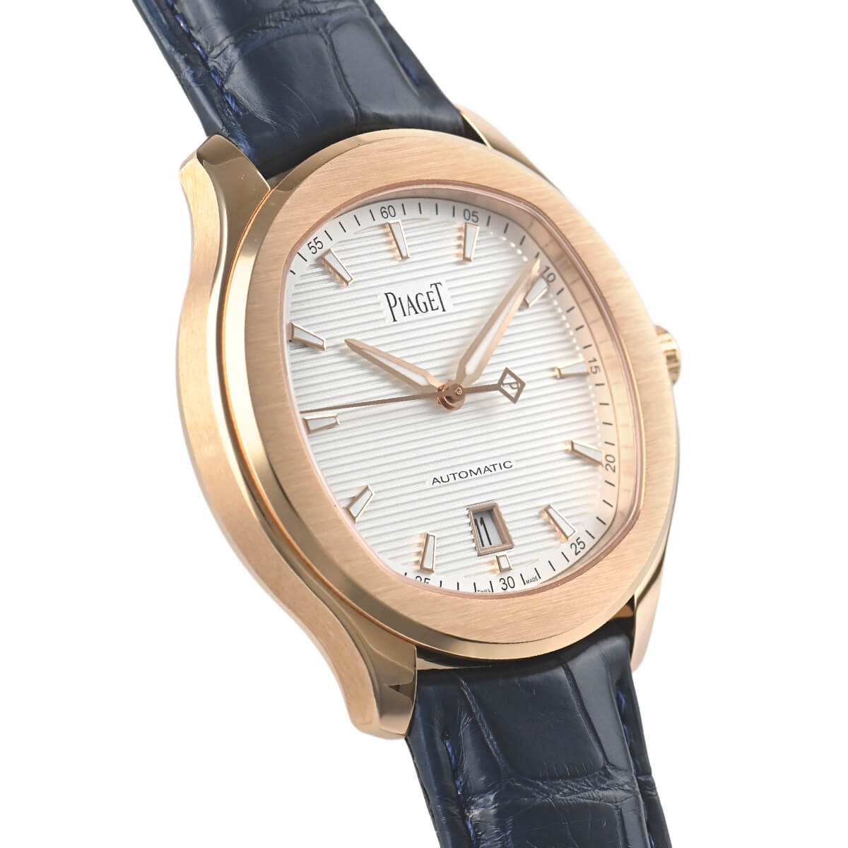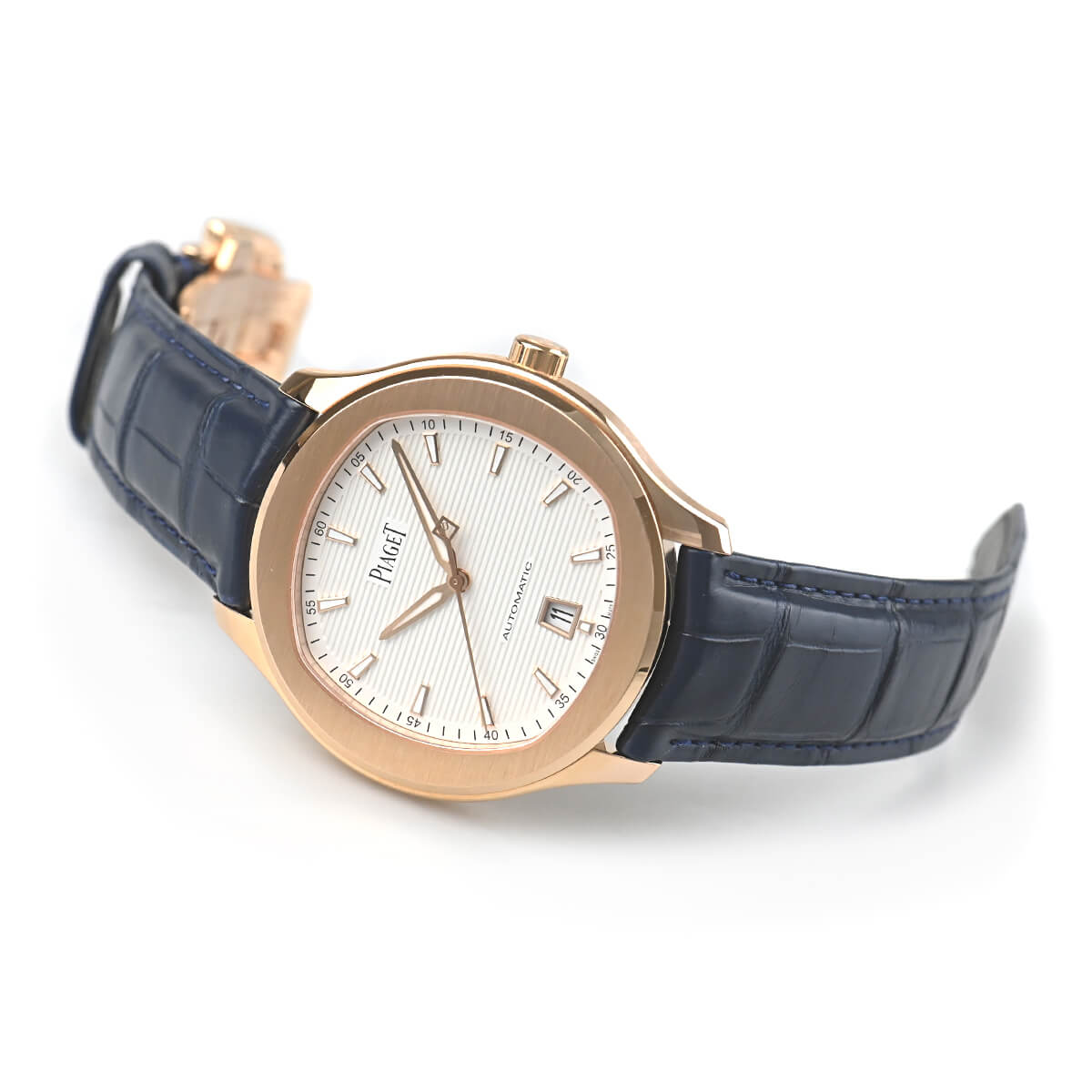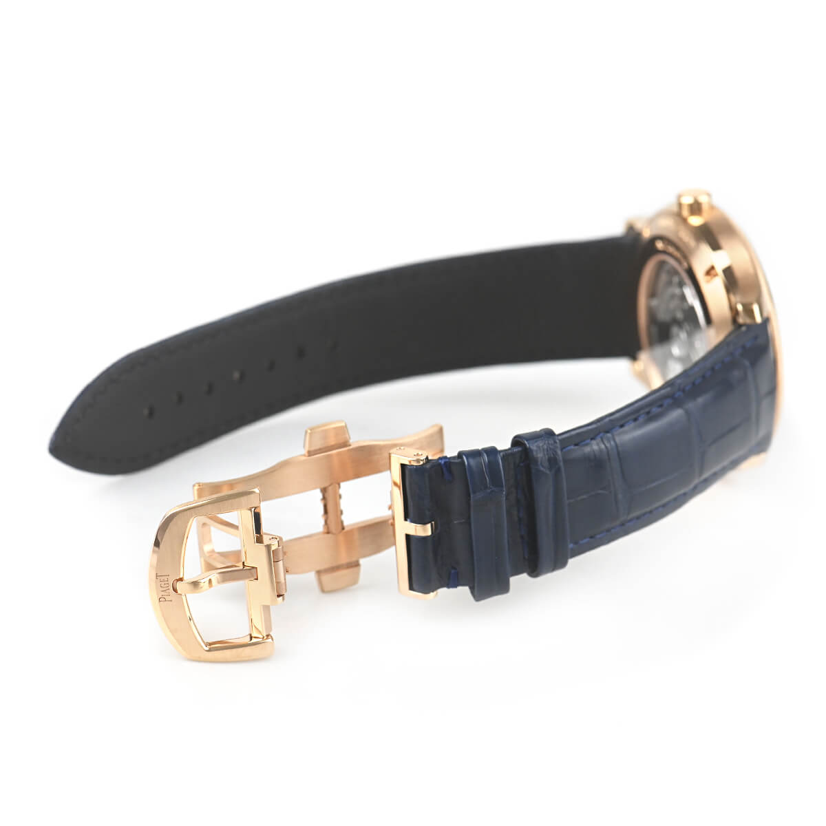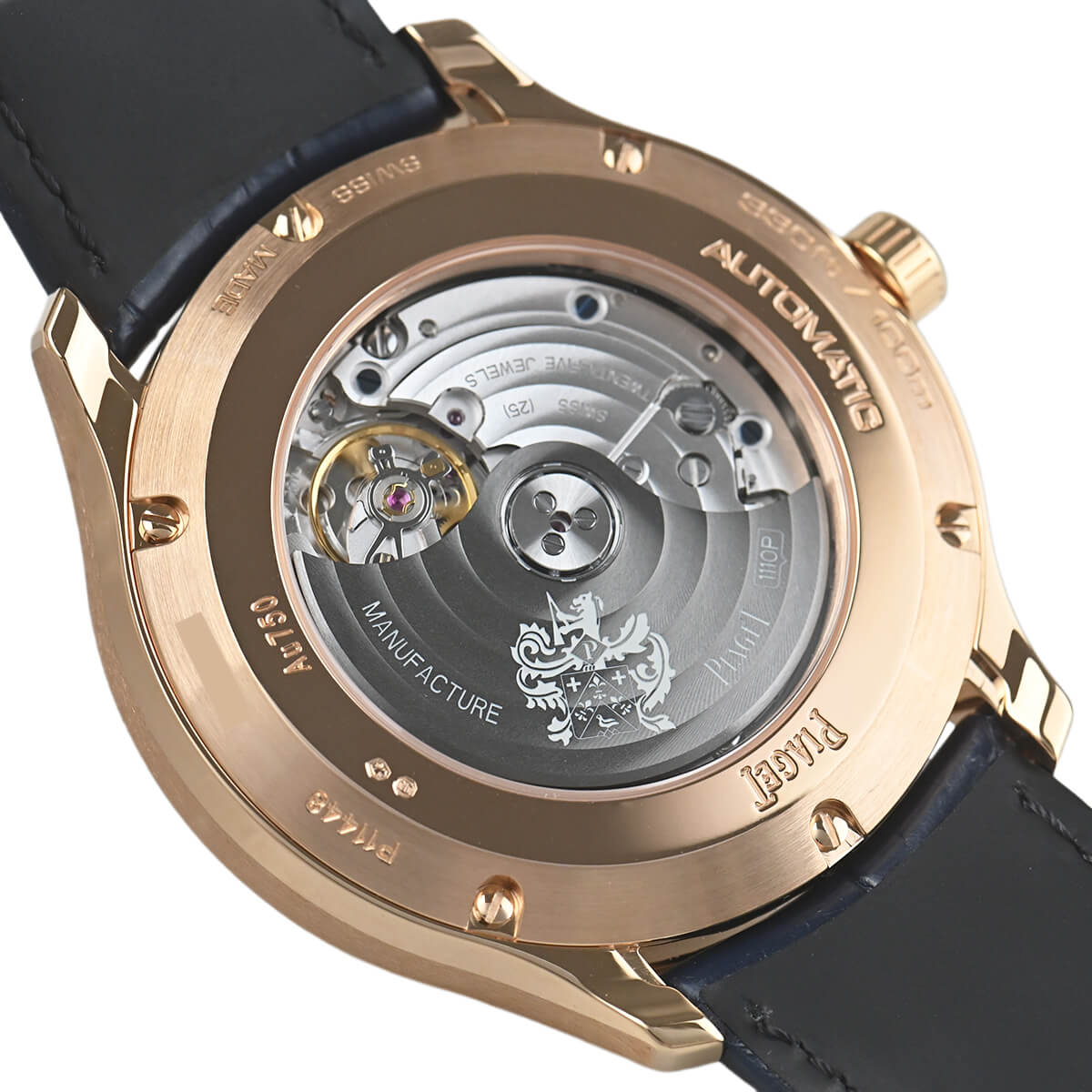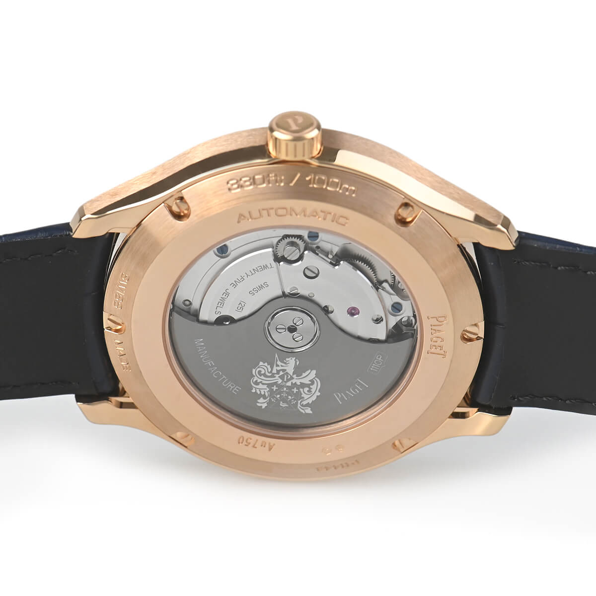 ピアジェの紋章が刻印されたチャコールグレーのローターも見ものです。