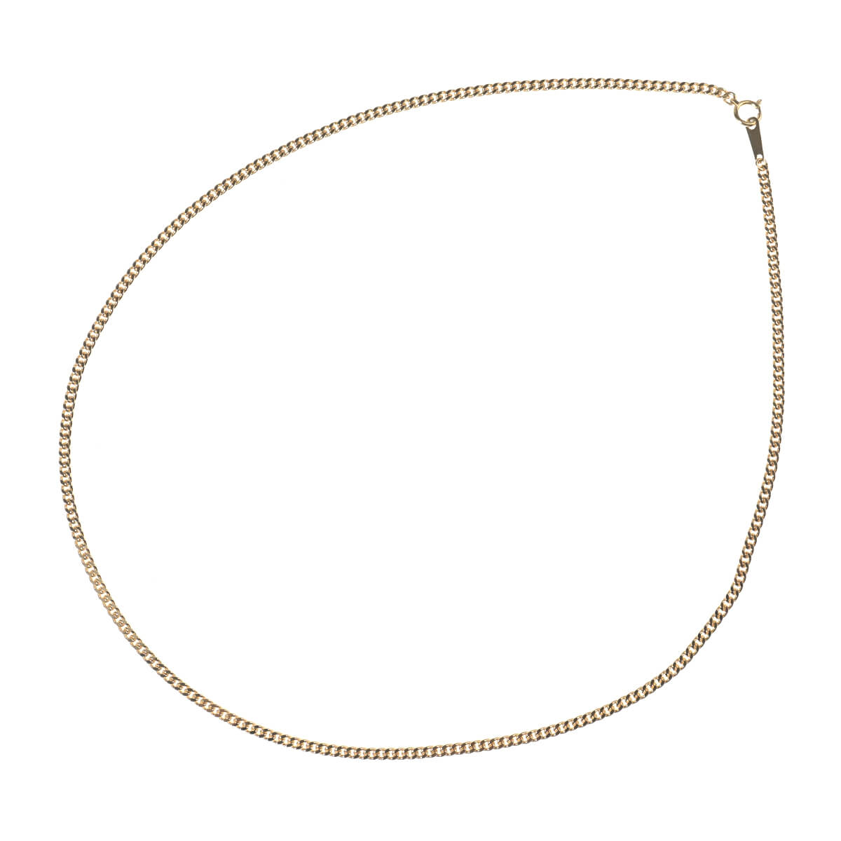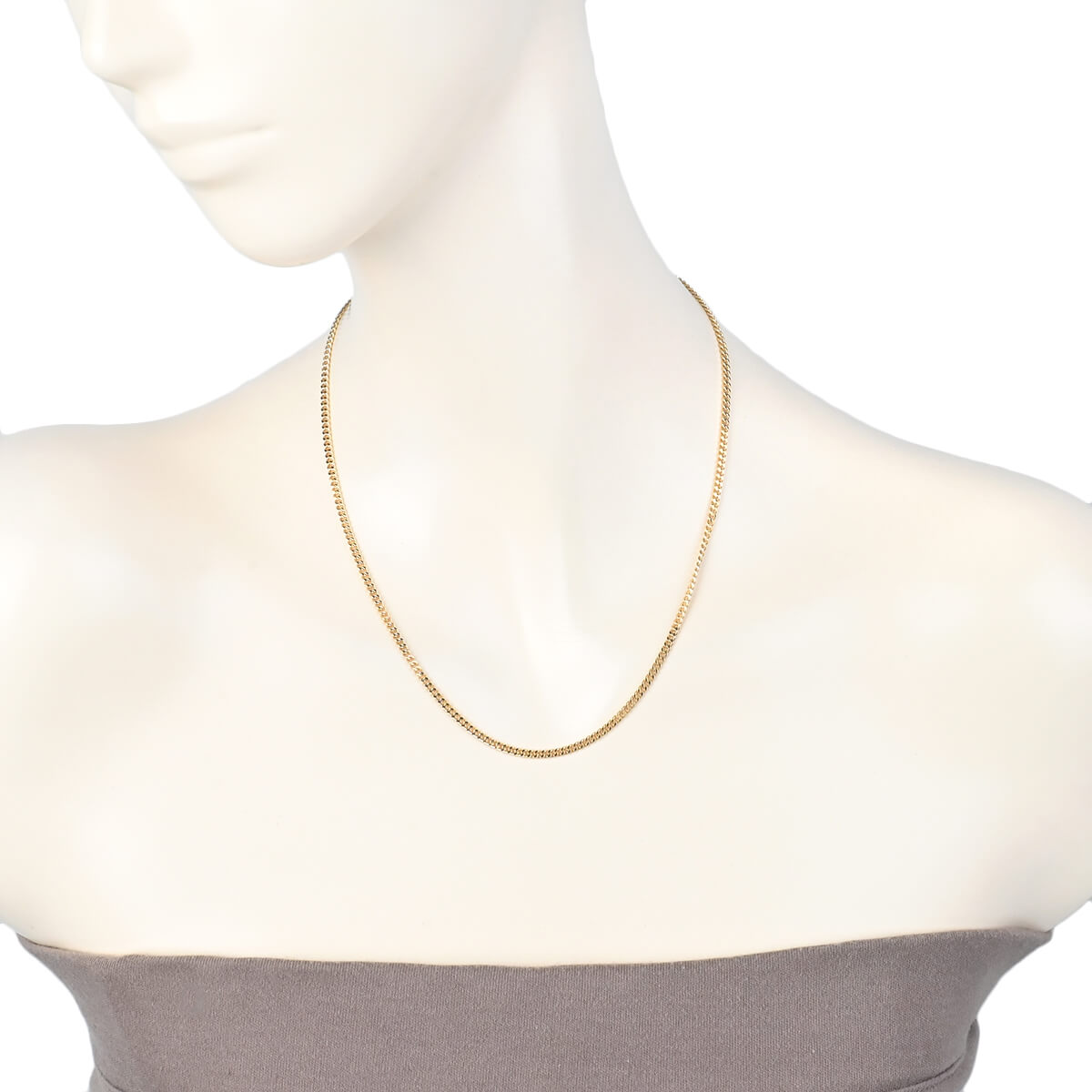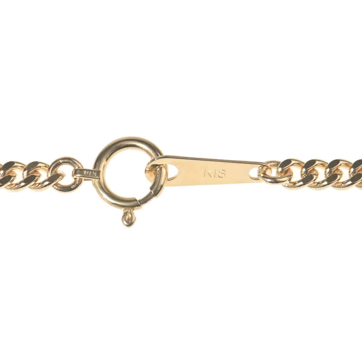 約45センチ、幅約2.6ミリ、約11グラムの、細めのイエローゴールド製2面シングルキヘイチェーンネックレス。キヘイチェーンとは、あずき型のチェーンを90度ひねり、さらに押しつぶしたつくりのデザインチェーンのこと。押しつぶした面が綺麗に並んで同じ面を向き、連続していることによるなめらかな輝きが魅力のデザインチェーンです。上下2平面にカットが施された2面シングルのキヘイチェーンは、カジュアルでスタンダードなデザイン。1本でつけるのはもちろん、ヘッドをとおしたり、レイヤードしたり、シンプルに使えるデザインが魅力。資産価値にも注目されるキヘイは他のチェーンとは違い、単なる装飾品としてだけでなく身につける資産としても人気です。