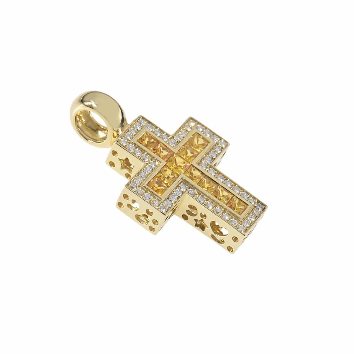 イタリア、フィレンツェ最古の橋であり、建造以来橋上に金細工師の商店が並んでいた、アルノ川にかかる石造アーチの橋“ポンテヴェキオ橋”。その名を冠したドメスティックジュエリーブランド『PonteVecchio(ポンテヴェキオ)』は、1981年の創業以来“Romantic Luxury(ロマンティック ラグジュアリー)”をキーワードに、ジュエリーが紡ぎだすロマンティックな物語、こだわりのマテリアルと熟練の職人技術によって表現されるラグジュアリーな価値を、遊び心あふれるファインジュエリーに昇華し続けています。スクエアシェイプのイエローサファイアが描くクロスを、ダイヤモンドのアウトラインで囲んだイエローゴールド製ペンダントトップ。目を惹く華やかなカラーコントラストとたっぷりのボリュームが存在感抜群なクロスは、ジェンダーレスに。お手持ちのチェーンに通すのはもちろん、レザーやコットンのコードとのコーディネートでカジュアルダウンしても素敵です。
