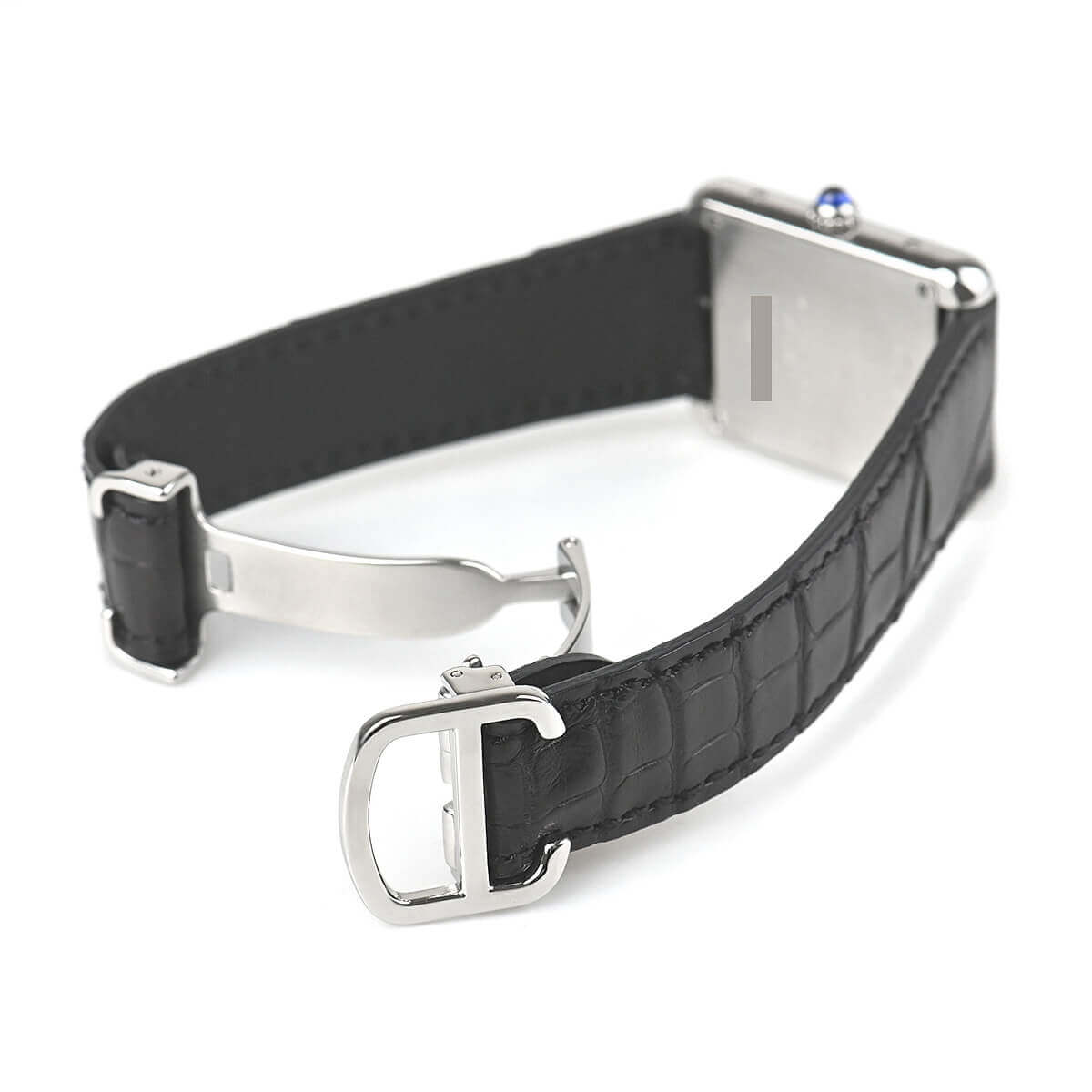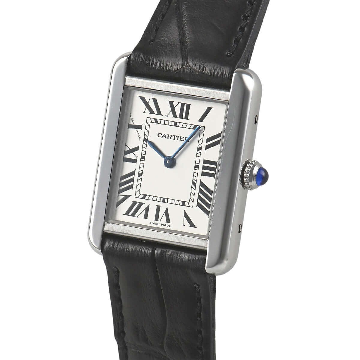 カルティエの名作「タンク」のオリジナルモデルの形を色濃く残す「タンク ソロ」。シンプルな美しさのあるモデルですが、ブルースチールの針やローマンインデックスなどカルティエらしさにも溢れたデザインになっています。