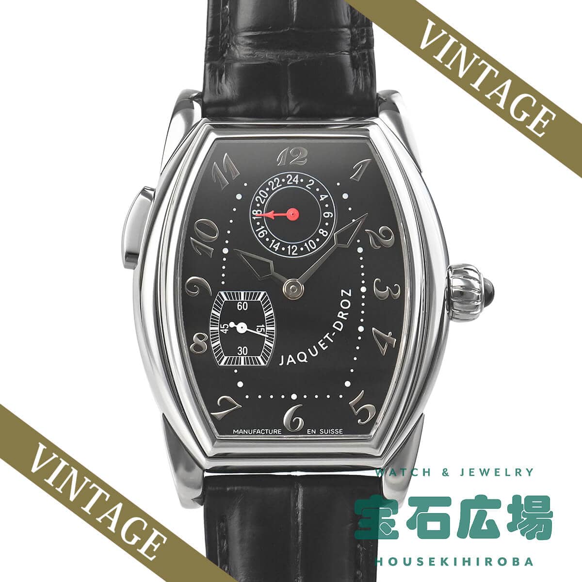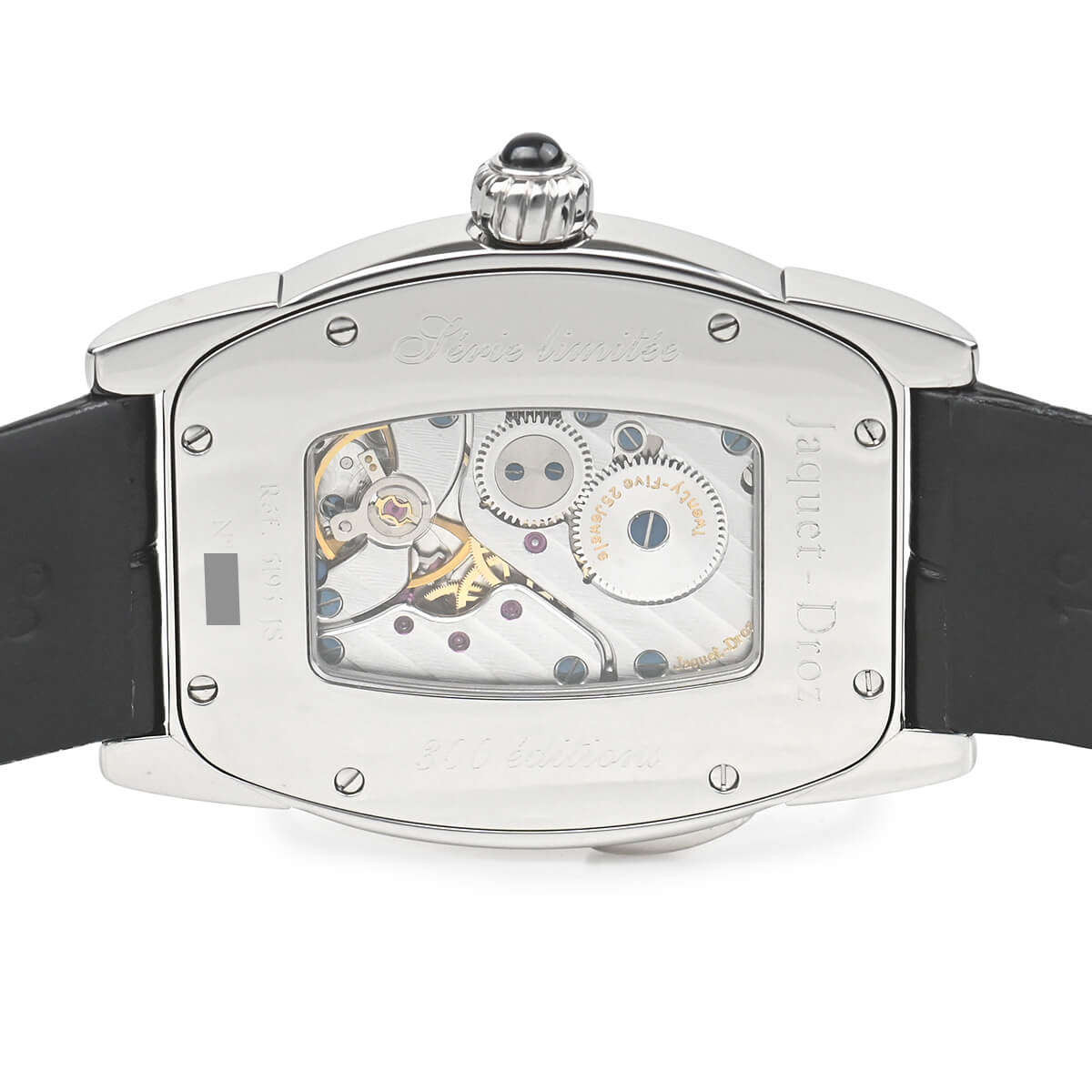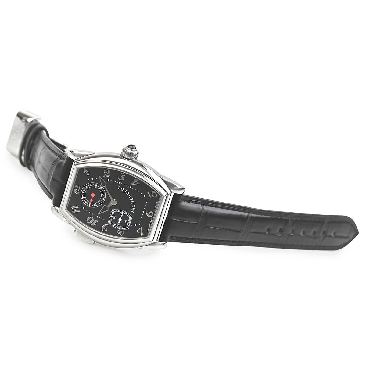 ジャケ・ドローが2000年ごろに製造していたモデルです。特徴的なトノー型のケースにはトノー型の手巻きムーブメント7369が納られています。Cal.7369は、la joux-perret736にGMT機能を追加したムーブメント。ケースはシースルーバックになっており、その特徴的な姿を眺めることが可能です。