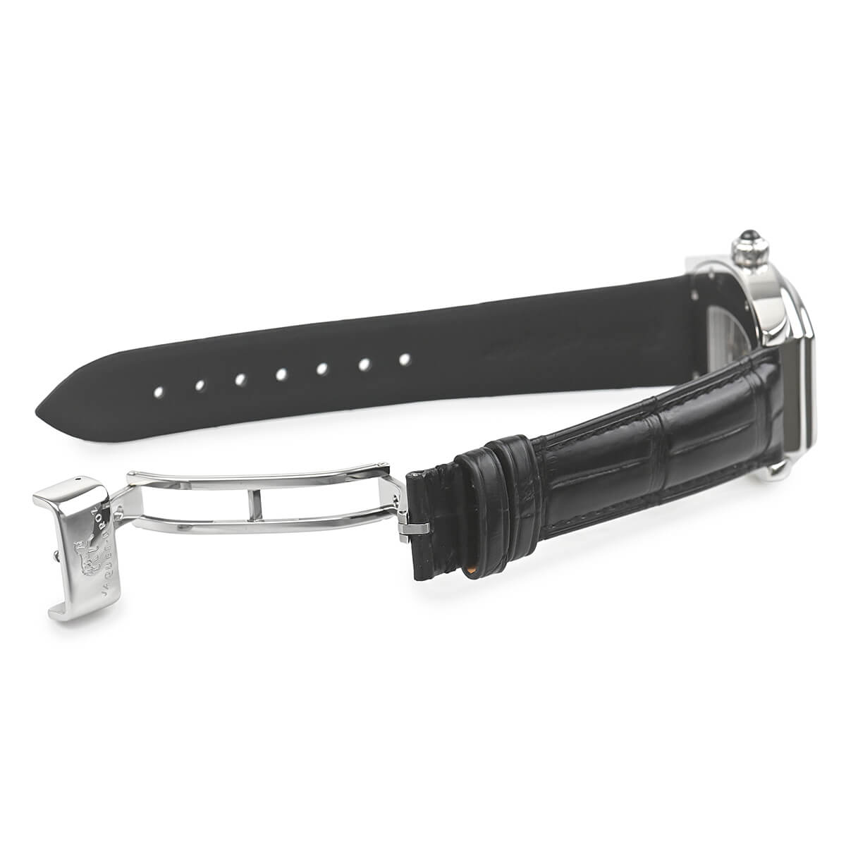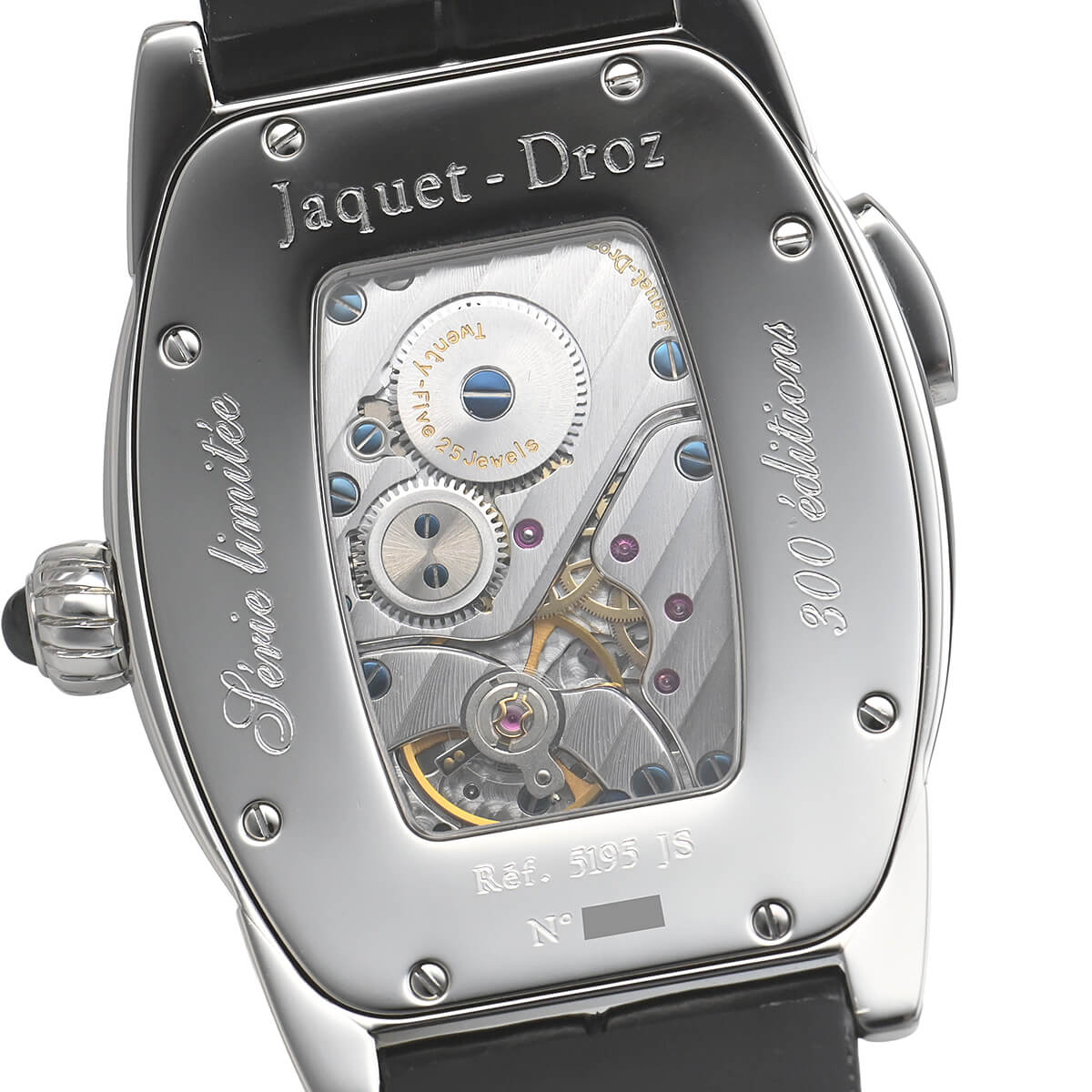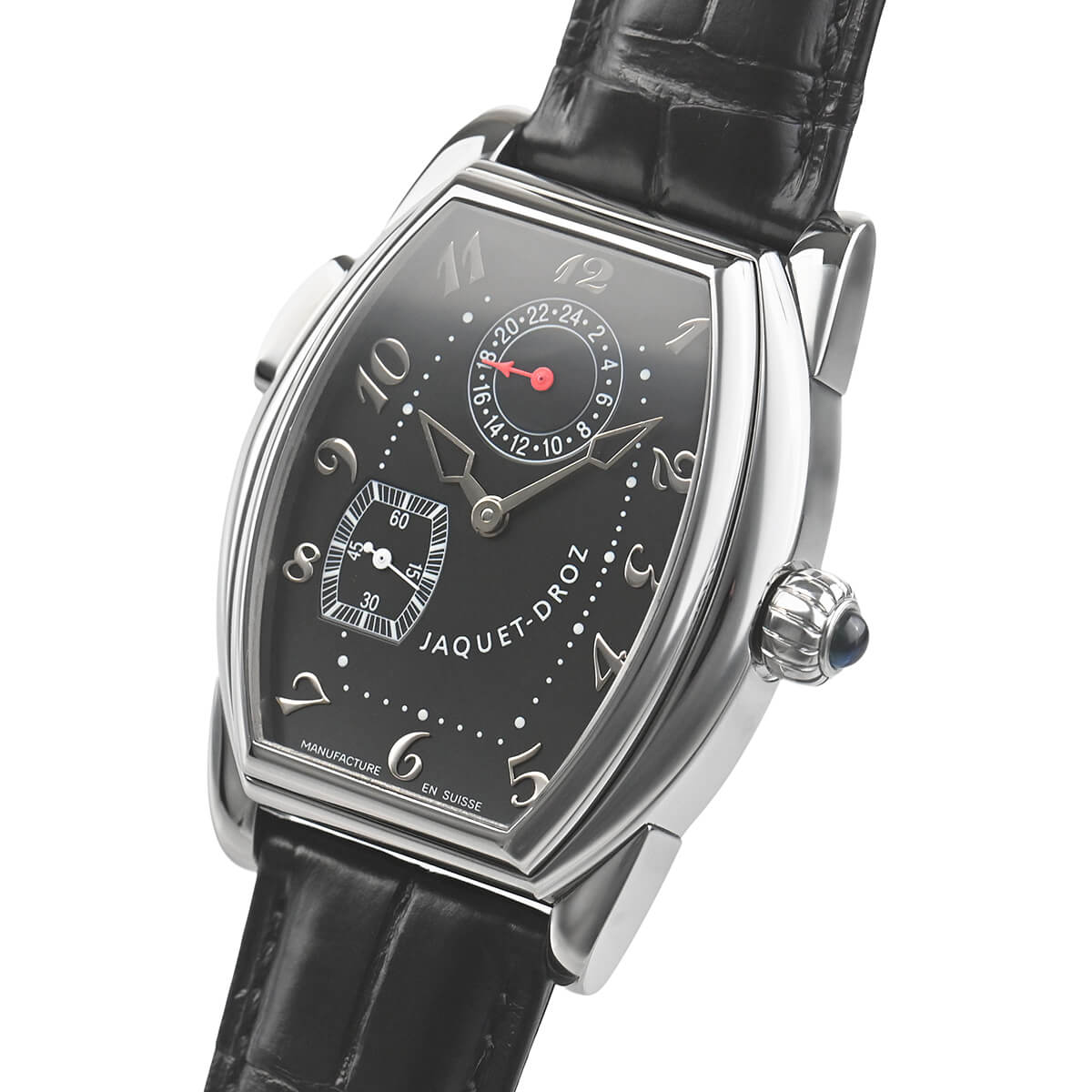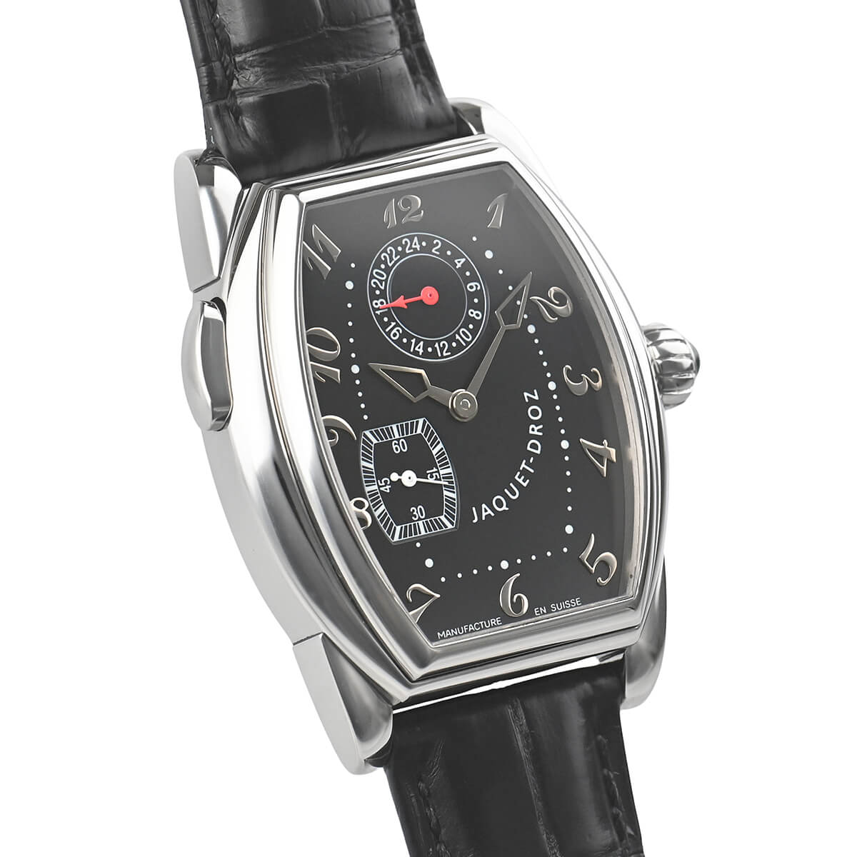 ジャケ・ドローが2000年ごろに製造していたモデルです。特徴的なトノー型のケースにはトノー型の手巻きムーブメント7369が納られています。Cal.7369は、la joux-perret736にGMT機能を追加したムーブメント。ケースはシースルーバックになっており、その特徴的な姿を眺めることが可能です。