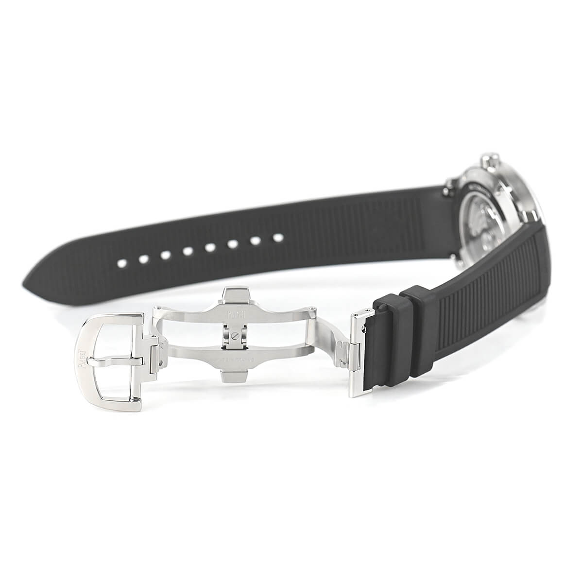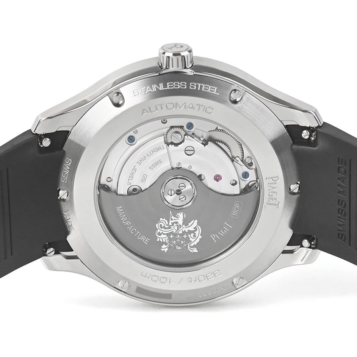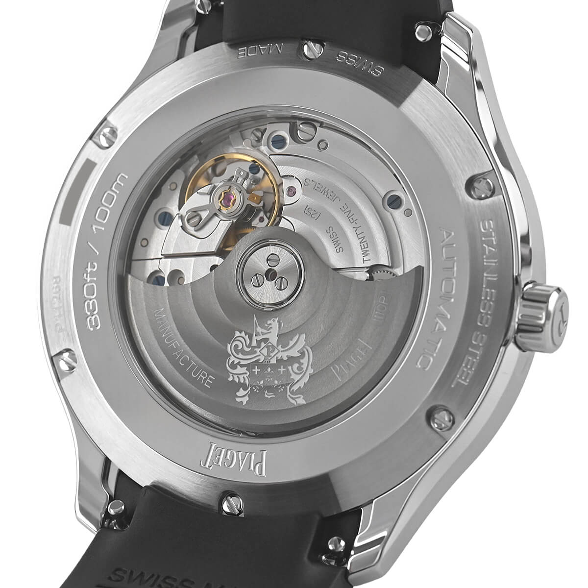 ピアジェの紋章が刻印されたチャコールグレーのローターも見ものです。