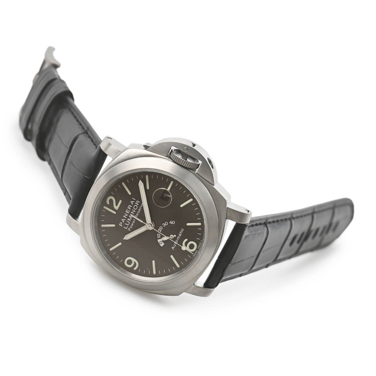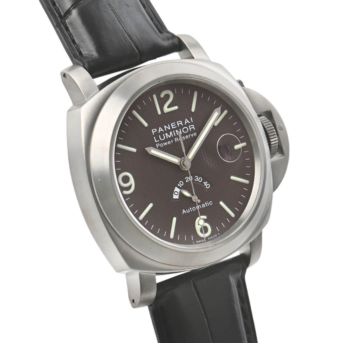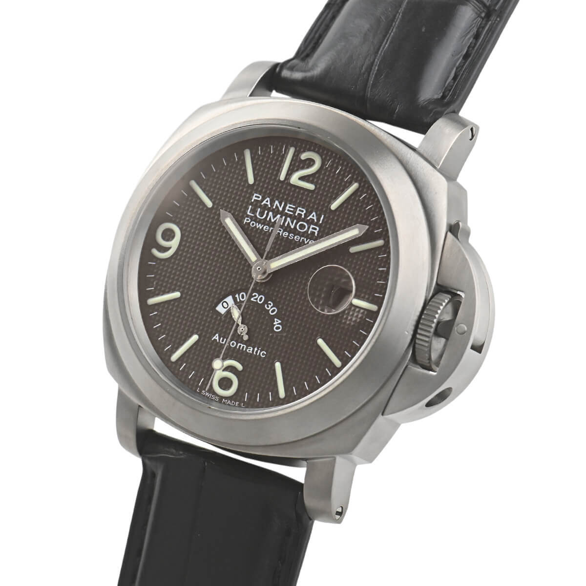 C番“2000年製”【PAM00057】ルミノールパワーリザーブが入荷しました。文字盤の6時位置にパワーリザーブ表示を配し、凹凸がある文字盤がとても特徴的です。