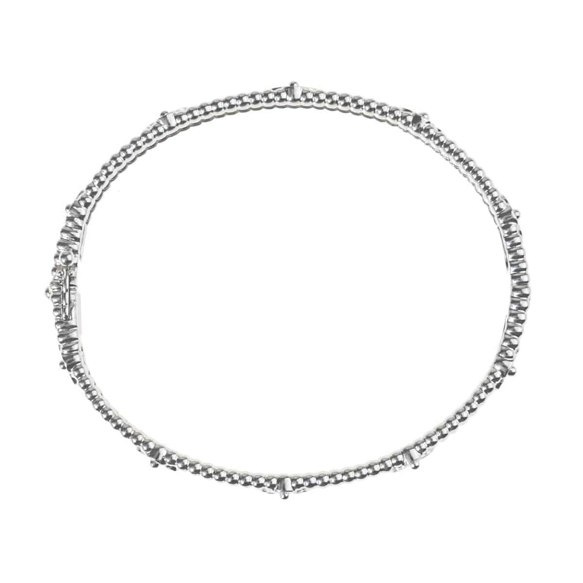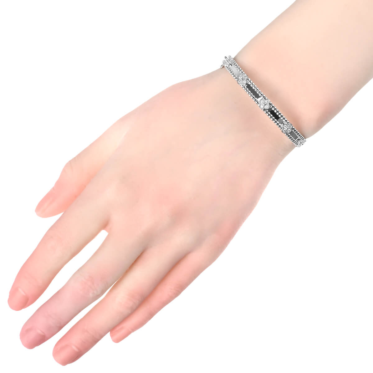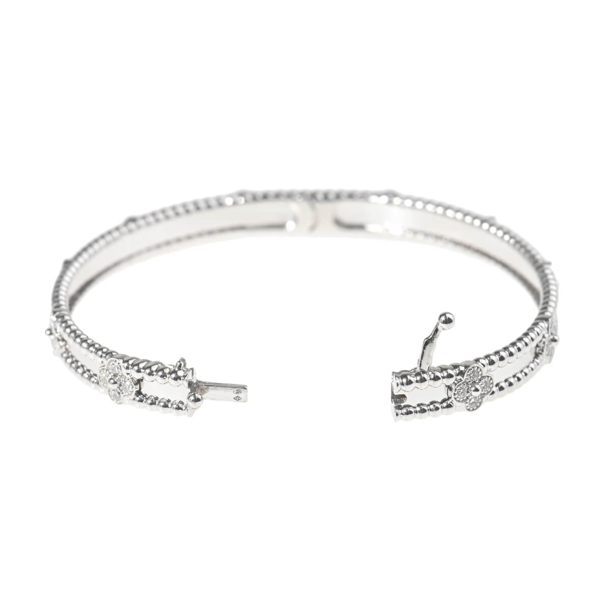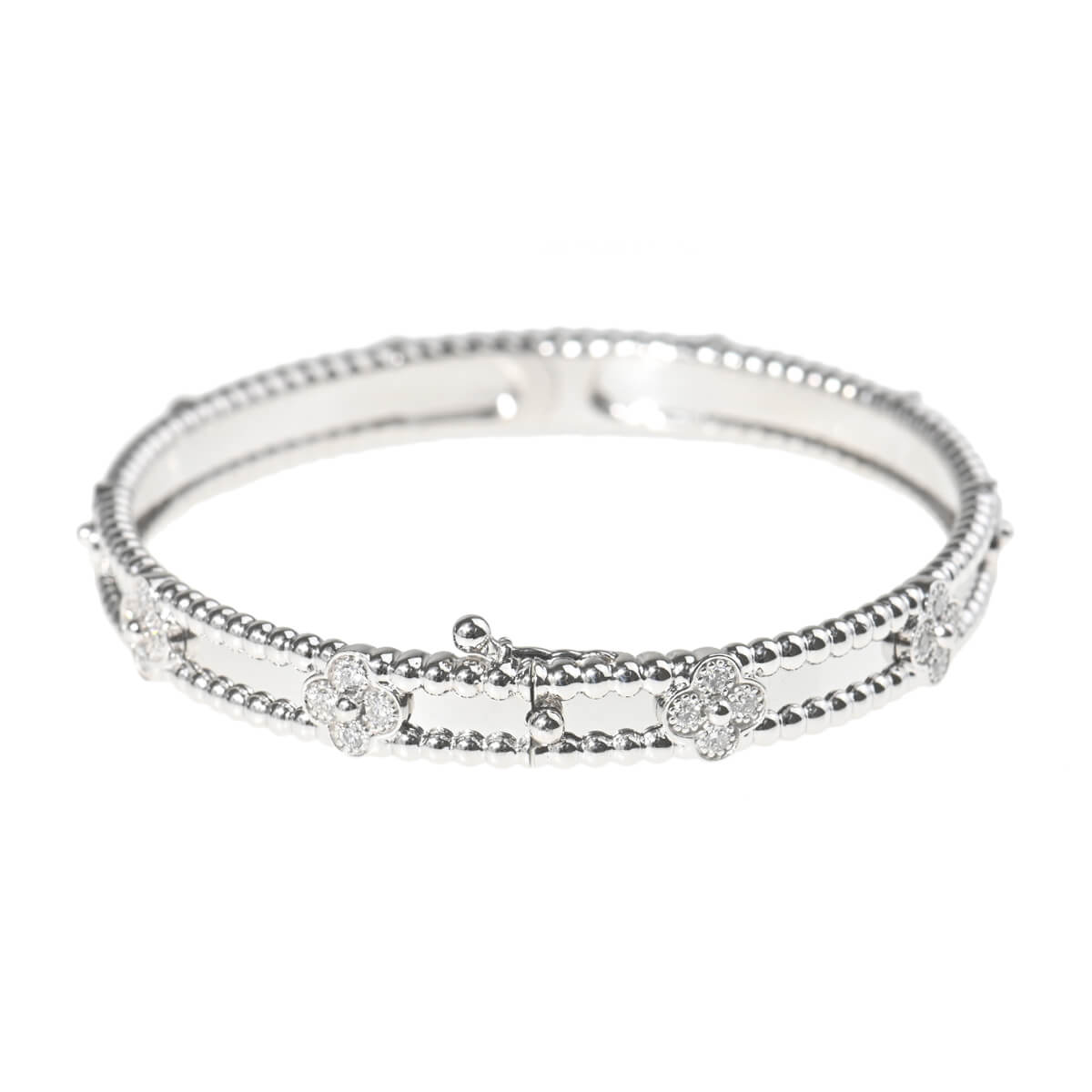 言わずと知れたパリの老舗ハイジュエリーメゾン『VanCleef&Arpels(ヴァンクリーフ&アーペル)』を象徴する数々のコレクションでも重要な装飾として受け継がれてきた、ゴールドビーズを主役にした「ペルレ」コレクション。ゴールドの素材選定はもちろんのこと、なめらかな丸みを帯びたフォルムに整える研磨の工程など、複雑にして正確性を求められるデザインに卓越した職人技術の真骨頂を感じさせる、繊細でありながら華やかなコレクションです。フランス語で真珠を意味するコレクションの名の通り、美しいフォルムの艶やかな丸いビーズの連なりで縁取られた、「ペルレ スウィートクローバー」のホワイトゴールド製ブレスレット。ダイヤモンドの煌めきを纏ったメゾンの幸運のシンボルである貴重なクローバーモチーフがステーションされたブレスレットが、手元を可憐に、エレガントに印象づけます。