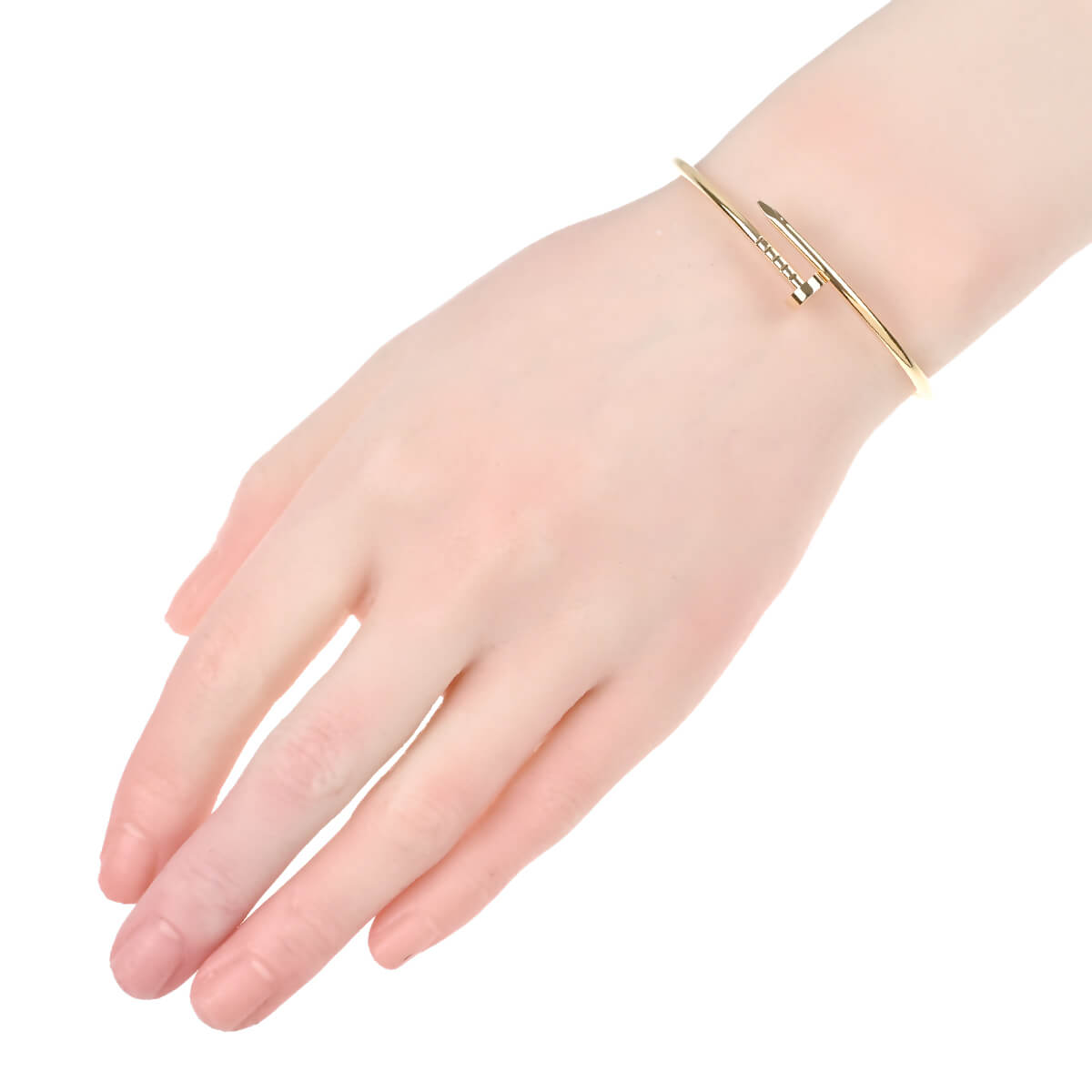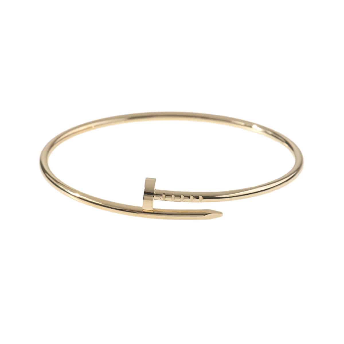 1970年代にニューヨークでデザインされた「ジュスト アン クル」。つまり“ただ1本の釘”を唯一無二な『Cartier(カルティエ)』ならではの感性で、計算しつくされた曲線デザインが際立つモダンなジュエリーに仕立てられたコレクション。釘がイメージさせる反骨精神、衝動やエネルギーがプレシャスマテリアルとシックなデザインで表現された、イエローゴールドのスモールデザインブレスレットです。カルティエの際立つ創作の力でジュエリーに姿を変えた、釘をモチーフにしたジュエリーは、先駆的で大胆かつモダンなデザインに仕上がっています。計算しつくされた曲線デザインが印象的な、カルティエらしい洗練された雰囲気をもつお洒落な大人カジュアルにぴったりのブレスレット。1本でつけたり、かさねたり、自分らしいルックを楽しんでください。