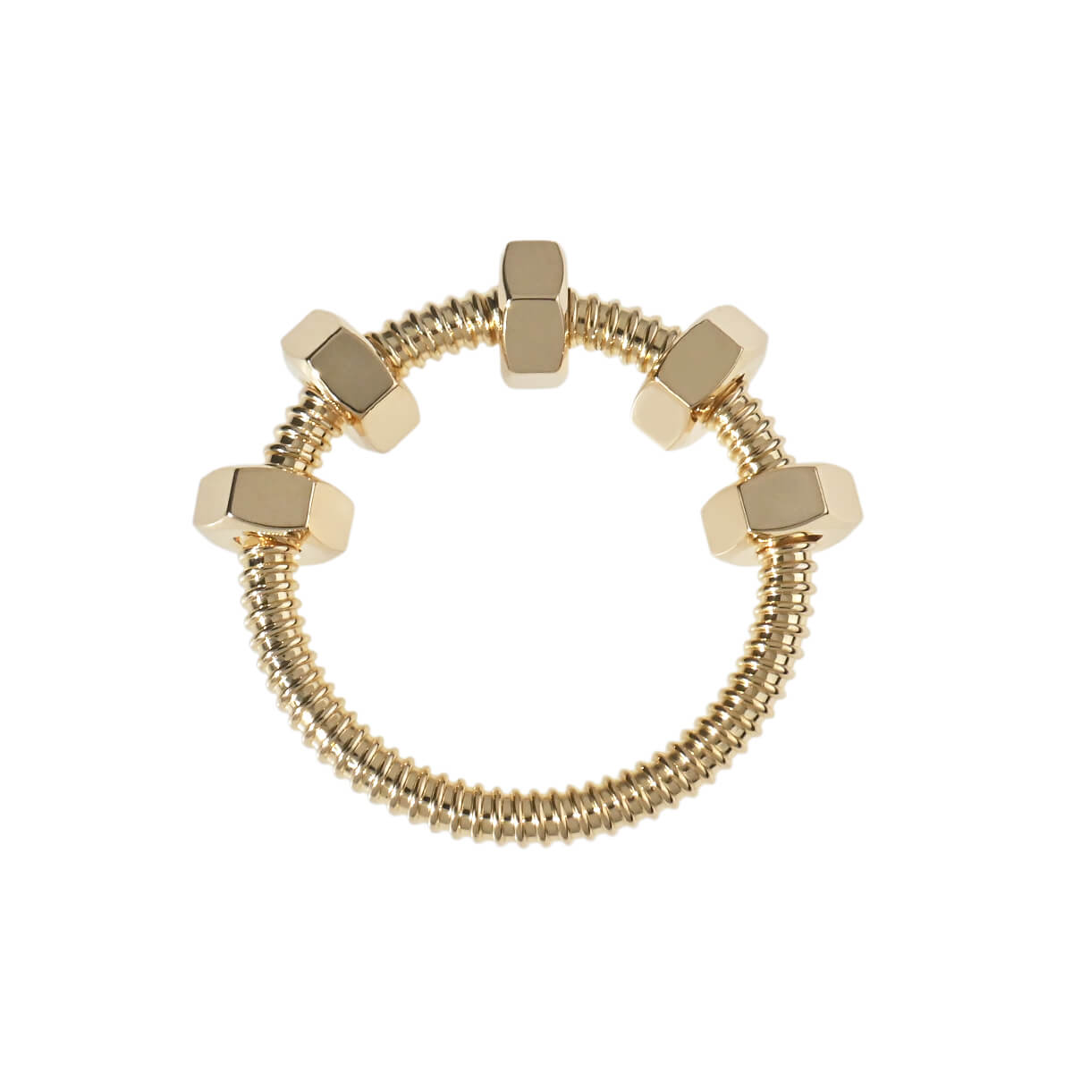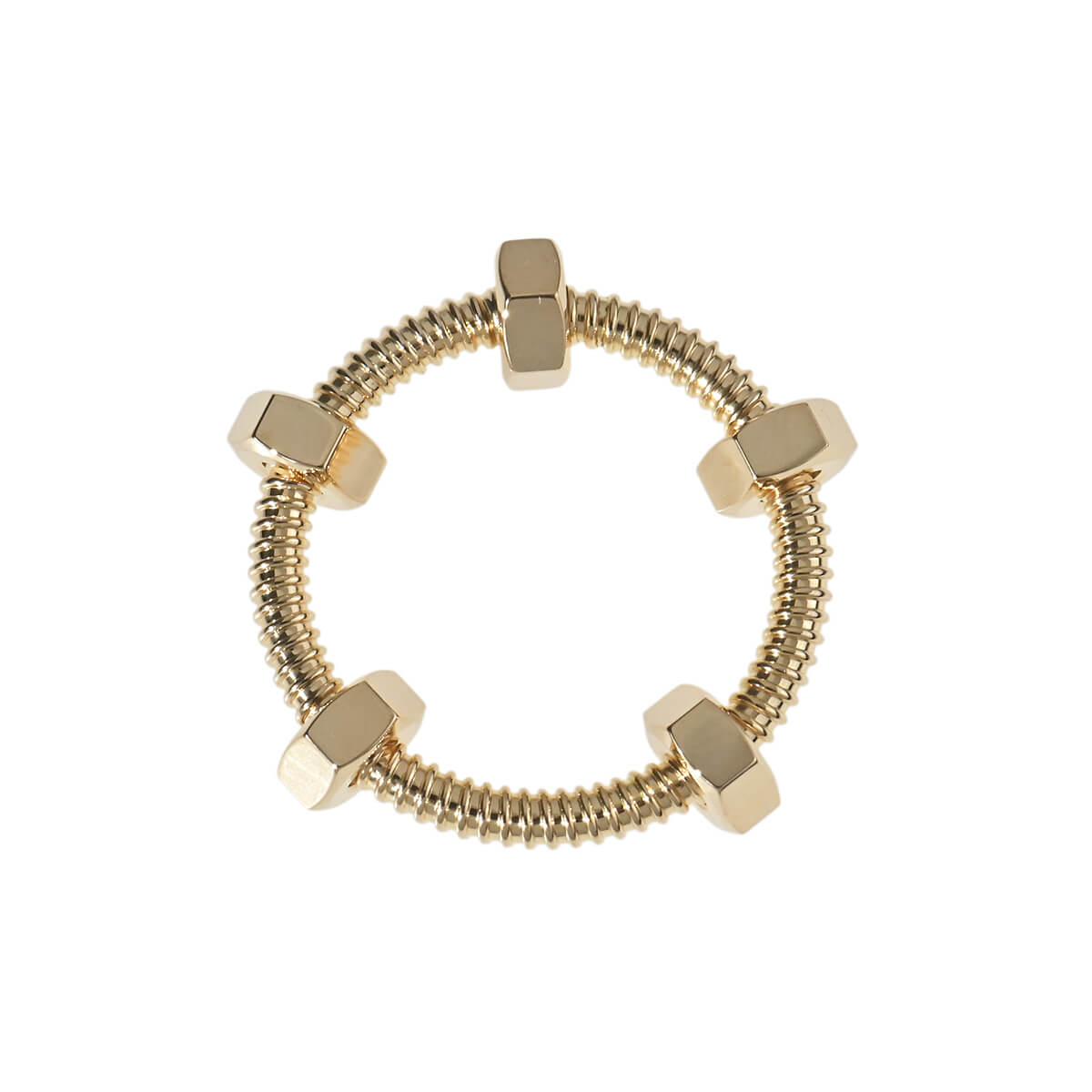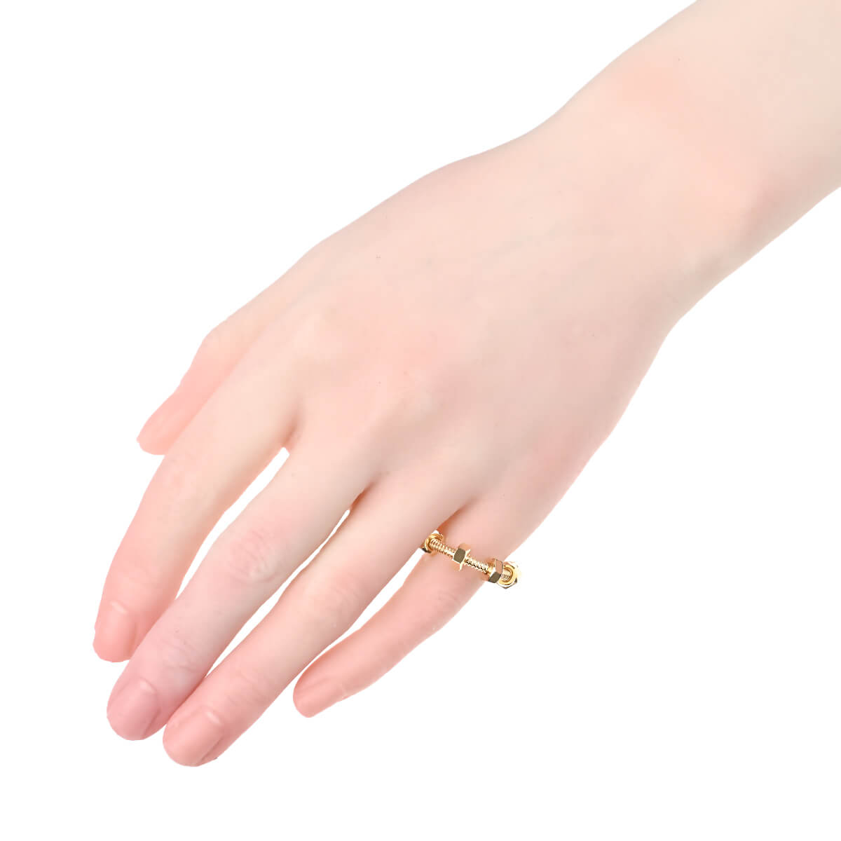 日用品であり、工業的なイメージの“ナット”をあえて、カルティエの際立つ創作の力でスタイリッシュで大胆な芸術品に昇華させた「Ecrou de Cartier(エクル ドゥ カルティエ)」コレクション。アイコニックな「LOVE」ブレス、そして釘をモチーフにした「Juste un Clou(ジュスト アン クル)」からインスピレーションソースを得たこのコレクションの、力強くもスタイリッシュなイエローゴールド製リングです。何の変哲もないアイテムである“ナット”をあえてプレシャスなジュエリーのモチーフに採用し、独創的な雰囲気と力強い存在感を演出しています。くるくる回すと可動する5つのナットをあしらった、力強さのなかに、カルティエらしい洗練も感じられる、ギミックを効かせた遊び心にあふれたリングです。