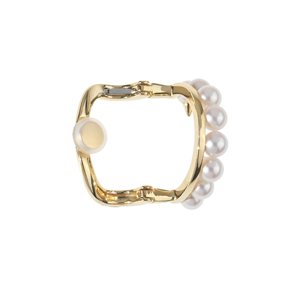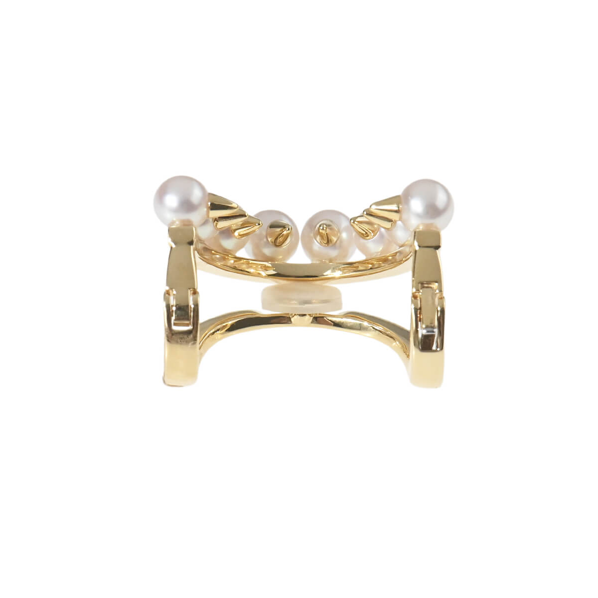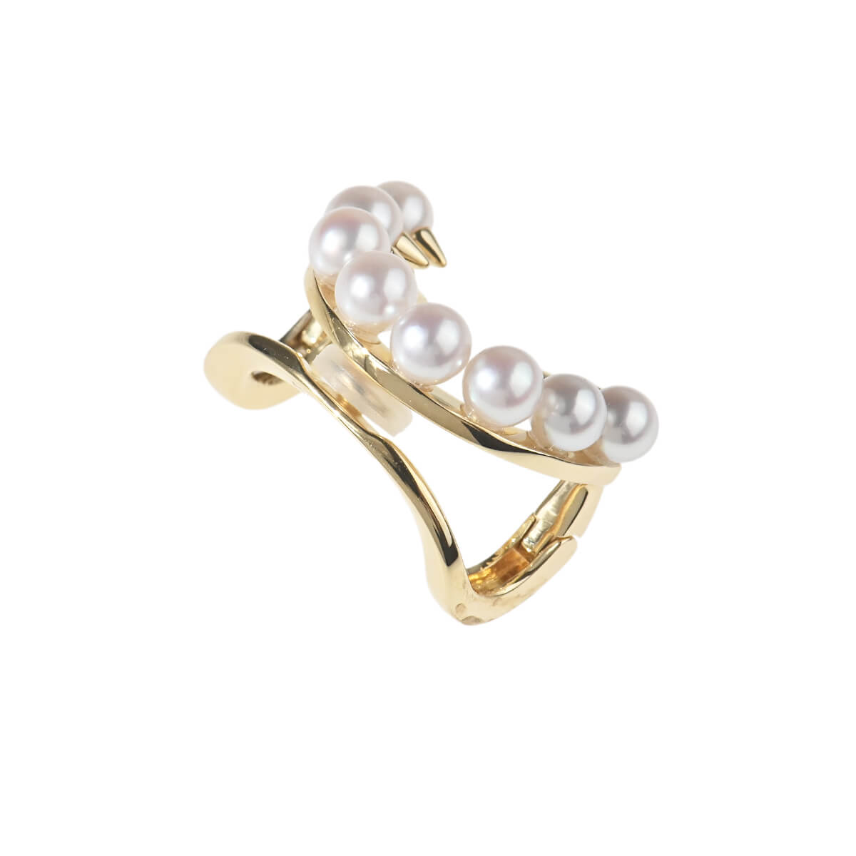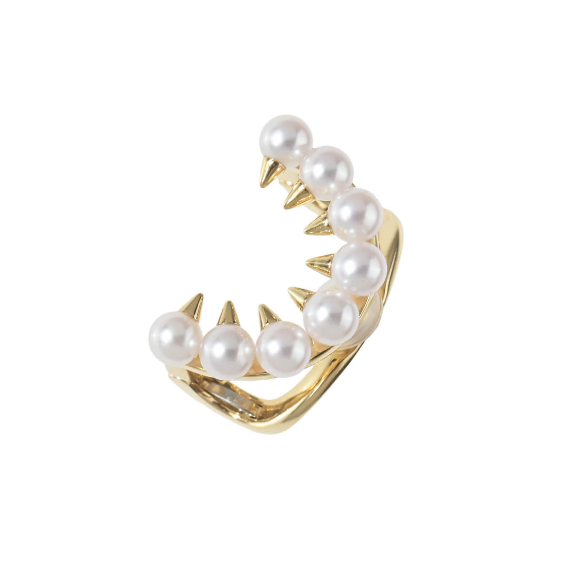 艶やかなマテリアルのラインとパールの丸みが描くオーガニックで柔らかな曲線に、美しく繊細なファングズ(牙)のシルエットでエッジィさを効かせた「デインジャープラス」のイエローゴールド製イヤーカフ。パールのもつフェミニンな魅力と、危険がはらむ美しさを感じさせる尖ったファングズ(牙)の、全く異なるイメージを融合させ具現化しています。耳元であこや真珠とゴールドのトゲが美しく艶めく、お洒落を一新する新感覚の洗練されたパールジュエリーです。