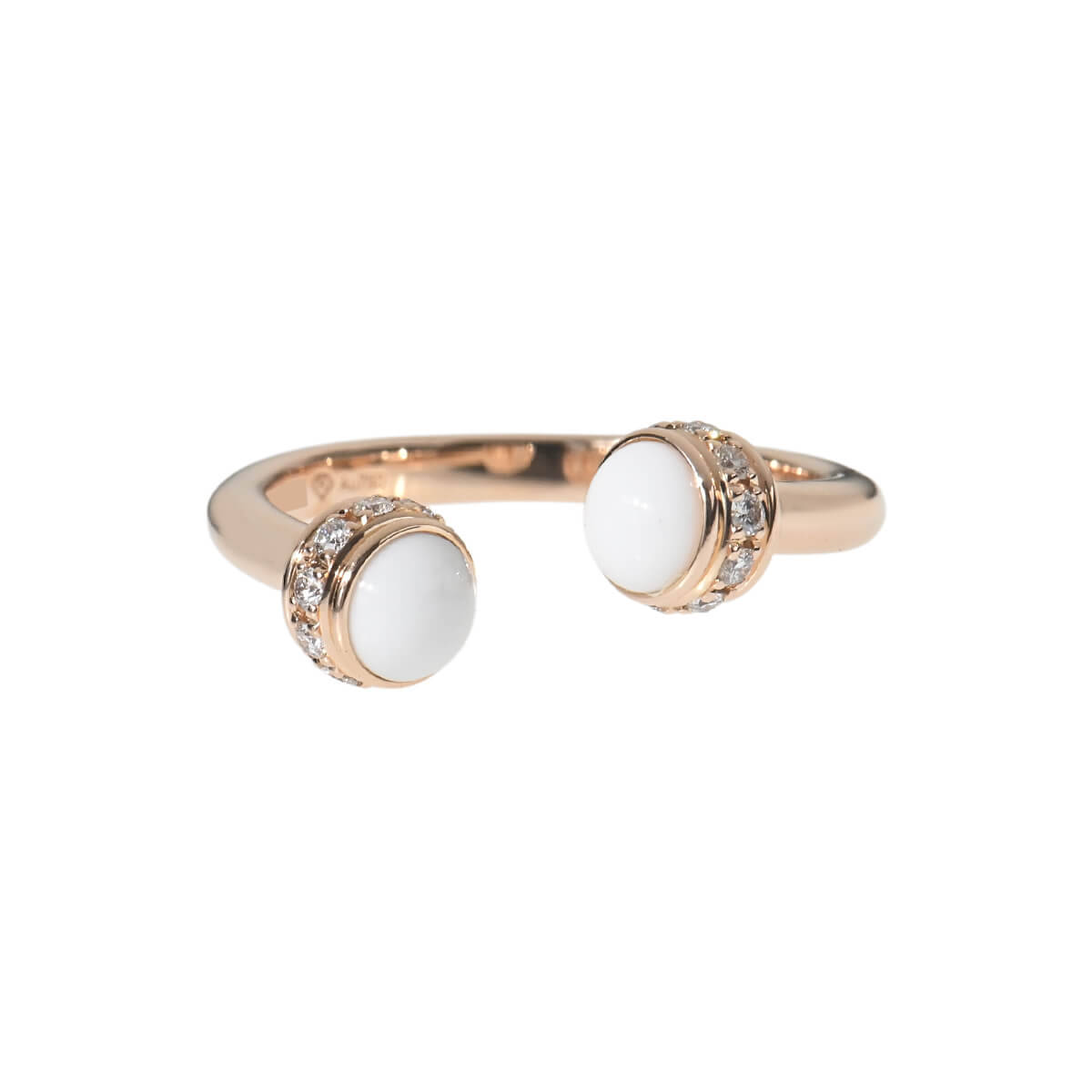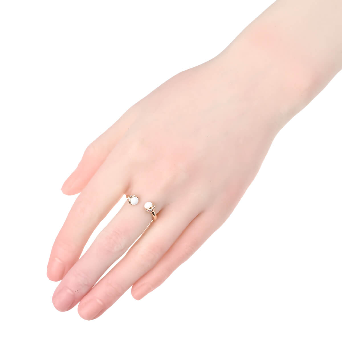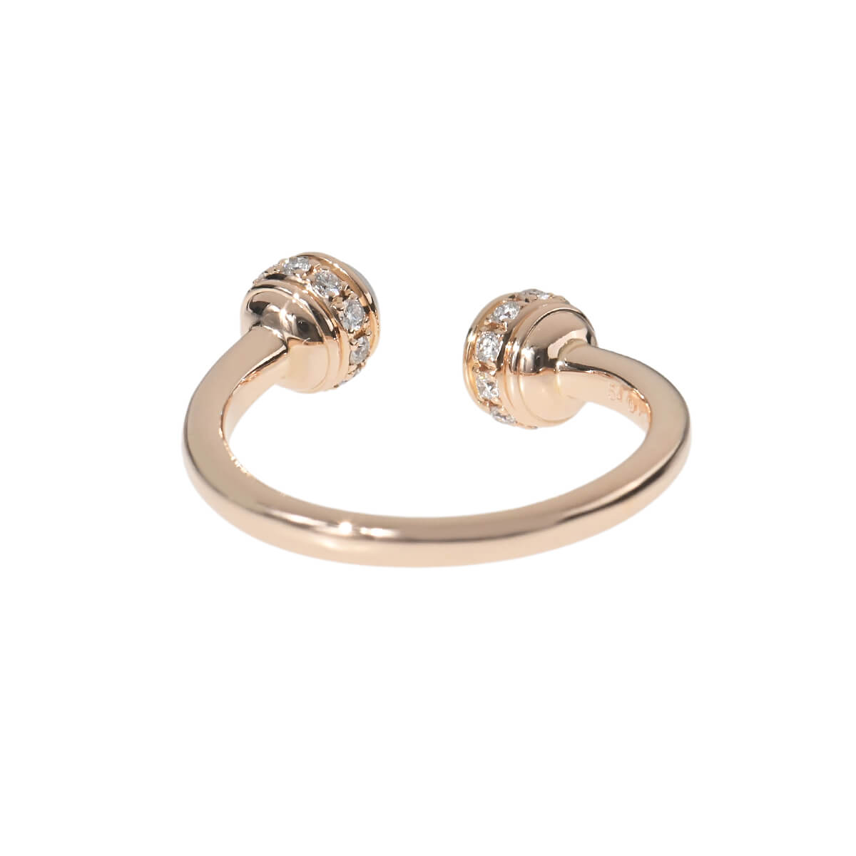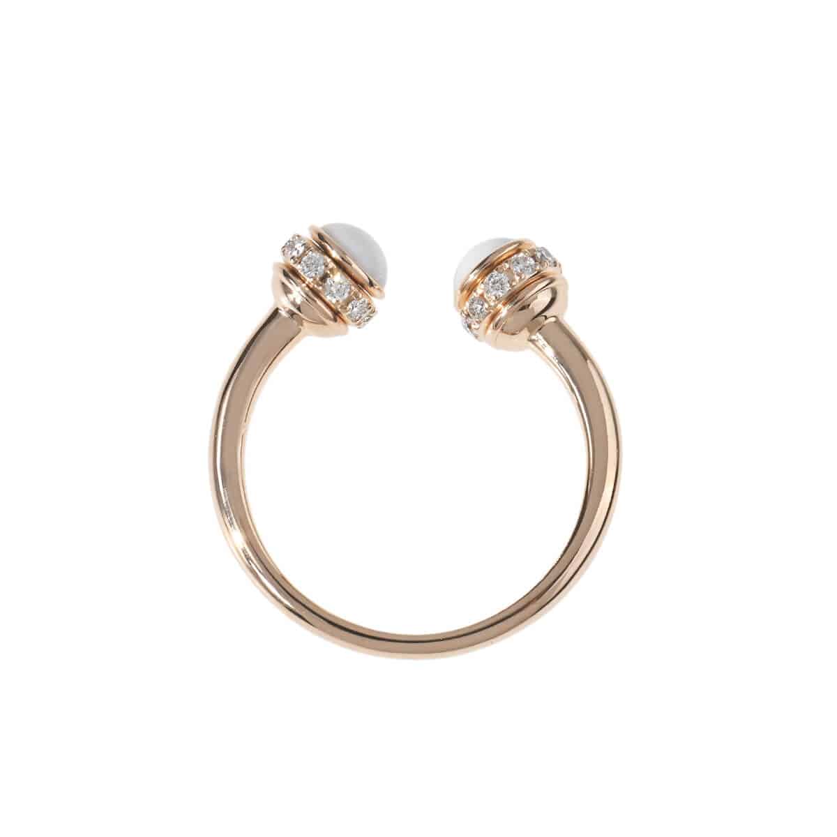 フランス語で“所有”を意味する「POSSESSION(ポセション)」は、愛する人を所有し、そして所有されるという情熱的な思いが込められた『PIAGET(ピアジェ)』の代表的コレクション。2つの輪が重なり合った個性的なデザインが特徴のこのコレクションは、自由に廻るけれども決して離れることなく永遠に結ばれているという、新しい愛の形を表現しています。カラフルで遊び心溢れるポセションバングルにインスピレーションを得て誕生した、くるくると回転するダイヤモンドのきらめきとアクセントのカラーストーンが印象的なピンクゴールド製リング。オープンリングの両端にパヴェダイヤモンドがセッティングされたふたつのリングが自由に回転し、その先端には可憐でモダンな魅力あふれるホワイトカルセドニーがあしらわれています。身につける人の指をエレガントに包み込み、表情豊かで個性あふれるスタイリングを演出する、アイコニックなファインジュエリーです