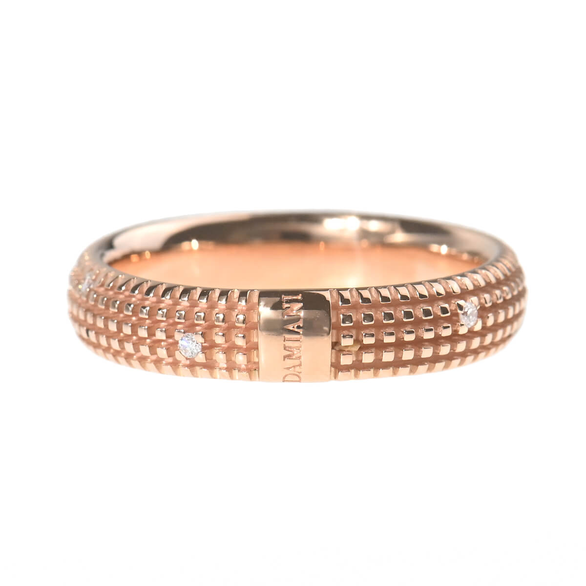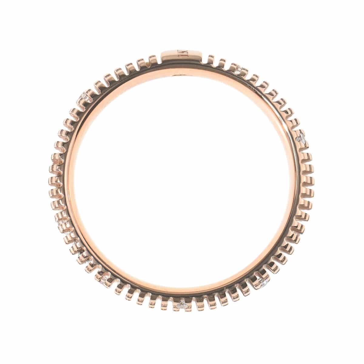 モダンな魅力あふれる『DAMIANI(ダミアーニ)』「Metropolitan(メトロポリタン)」は、シンプルで洗練された創造性を備えたコレクション。そびえ立つ高層ビルや規則的に並んだ窓ガラス、碁盤目状の街並みなど、都会の風景を切り取ったかのような現代の感覚を最大限に表現しています。朝(ピンク)、昼(イエロー)、夕方(ブラウン)、そして夜(ブラック)と、街が刻々とその姿を変えるように、4色のゴールドが多彩な表情をみせる、メトロポリタンコレクションのピンクゴールド製リングです。ミニマムなラインのクールなルックに浮かび上がる、ダイヤモンドが印象的に煌めきます。職人の手作業によりつくりあげられた、特殊な金細工の精巧さを際立たせている独特の質感が洗練された魅力を放つ、ユニセックスにつかえるハイブランドのコレクションジュエリーです。