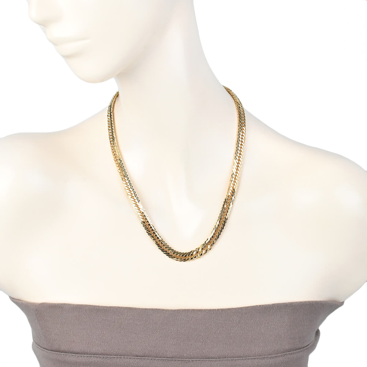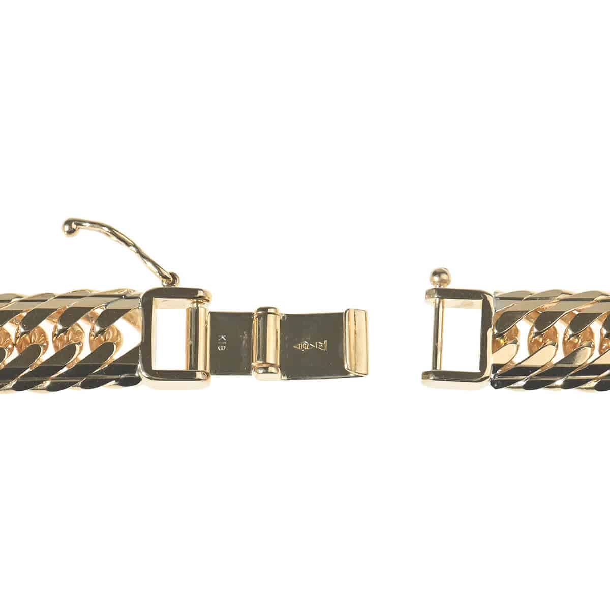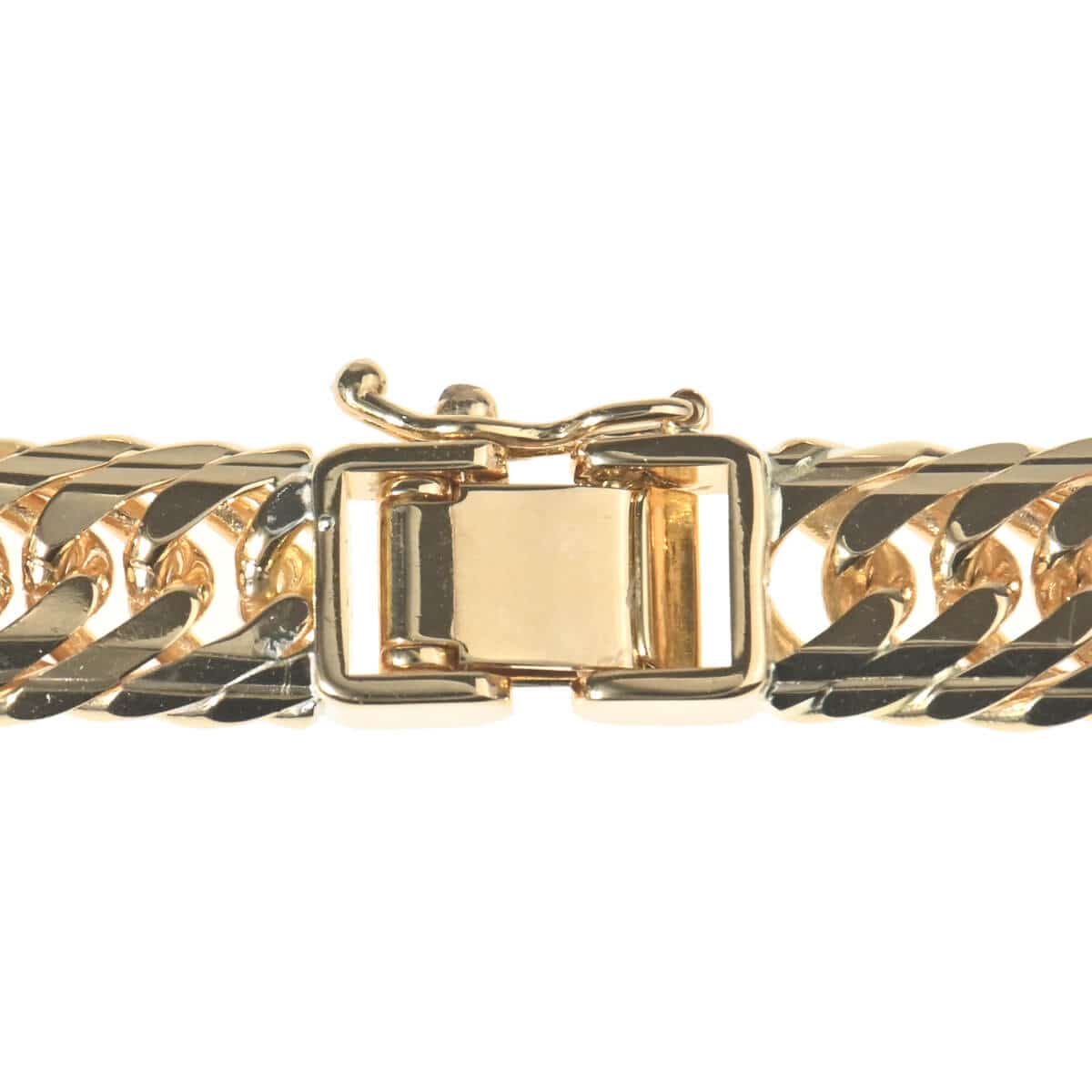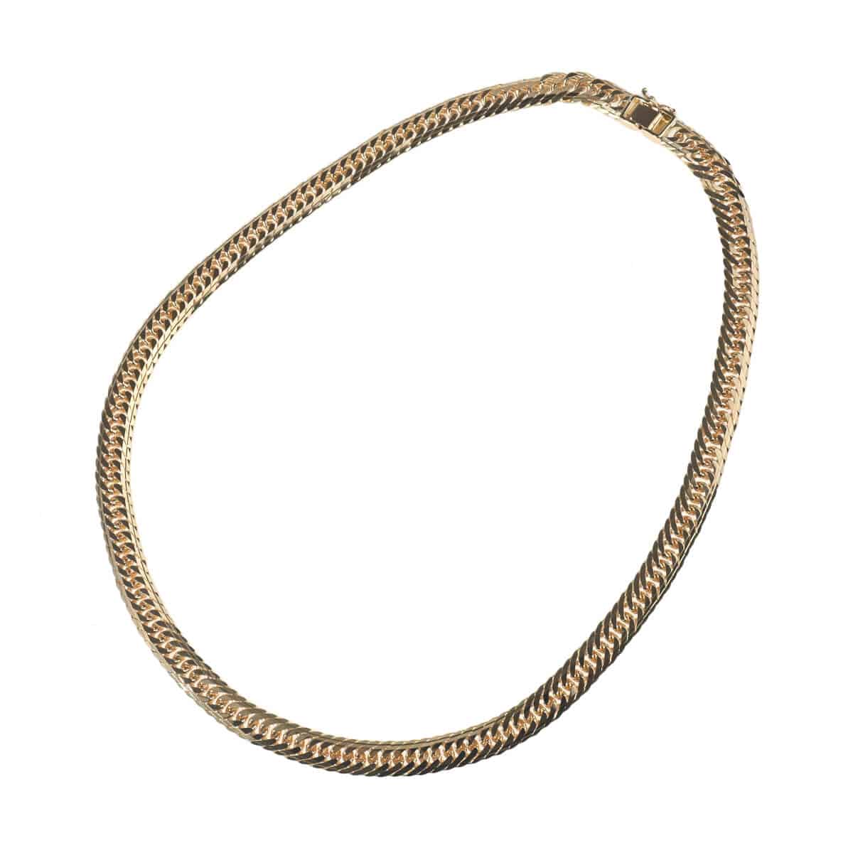 約48センチ、幅約8.3ミリ、約77グラムの、華やかな存在感をもつイエローゴールド製14面トリプルキヘイチェーンネックレス。キヘイチェーンとは、あずき型のチェーンを90度ひねり、さらに押しつぶしたつくりのデザインチェーンのこと。押しつぶした面が綺麗に並んで同じ面を向き、連続していることによるなめらかな輝きが魅力のデザインチェーンです。カット面が多いほど輝きと華やかさが増し、面数が多いほど加工の手間がかかっており、価値があるとされるキヘイチェーン。14面カットが施されたコマが3コマずつ滑らかに繋がれた、コマの隙間がほとんどないデザインの重厚感ある14面トリプルキヘイチェーンは、胸元でキラキラと光を反射し抜群の存在感を放ちます。資産価値にも注目されるキヘイは他のチェーンとは違い、単なる装飾品としてだけでなく身につける資産としても人気です。