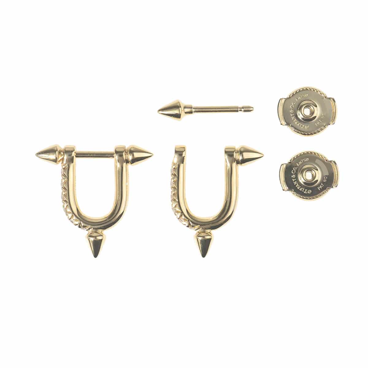 『TIFFANY&Co.(ティファニー)』とファッションデザイナーであり音楽プロデューサーとしても名高い才能あふれるアーティスト、ファレル・ウィリアムスとのコラボレーションコレクション、「タイタン by ファレル・ウィリアムス」。伝統的なティファニーのジュエリーデザインを覆す大胆なコンセプトで、創造力を触発する反骨精神を体現した革新的なコレクションです。ギリシャ神話の海神ポセイドンと彼のトライデント(三叉槍)に着想を得てデザインされた、コンバーチブルな2WAYピアス。ゴールドで作り上げられた鋭い槍形モチーフとフィッシュテールセットされたパヴェダイヤモンドのきらめきを纏った柔らかな曲線を描くリンクが、印象的なルックを魅せてくれます。簡単にゴールドスタッドに切り替えて自分らしく組み合わせたり、存在感あふれるルックを叶える、ジェンダーレスに使えるピアスです。
