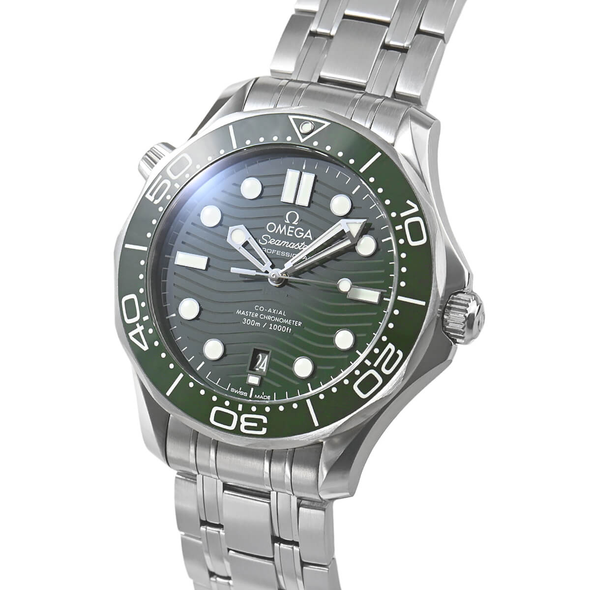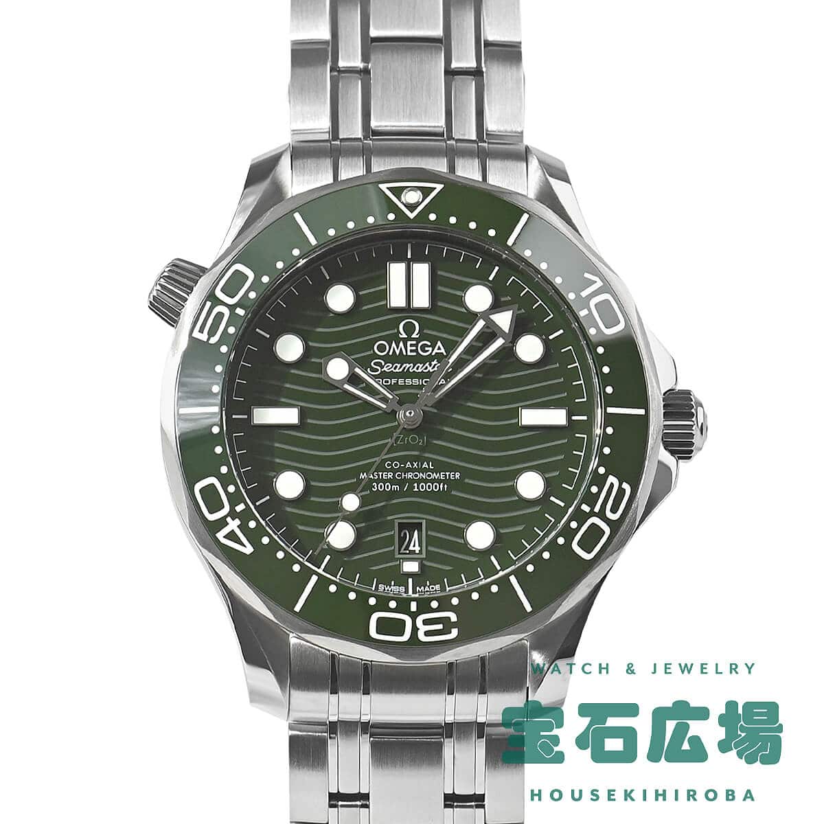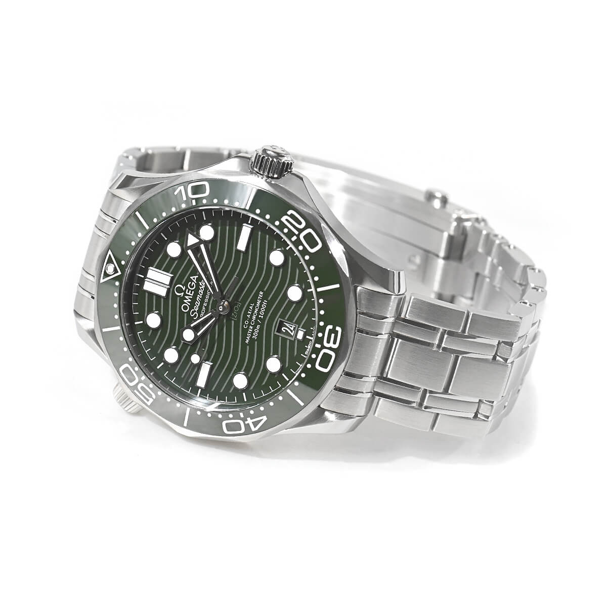 1993年に発表された【シーマスター ダイバー300M】が25周年を迎えた2018年にフルモデルチェンジを果たしました。こちらは2022年に追加されたグリーン文字盤モデル。文字盤とダイビングベゼルには耐久性に優れたセラミックを採用し、ベゼルのスケール部分には白さと耐久性向上の為に新たにホワイトエナメルを採用。また、ダイアルもポリッシュ仕上げのグリーンセラミック製で、レーザーエングレービングによる波模様と6時位置の日付表示が特徴です。