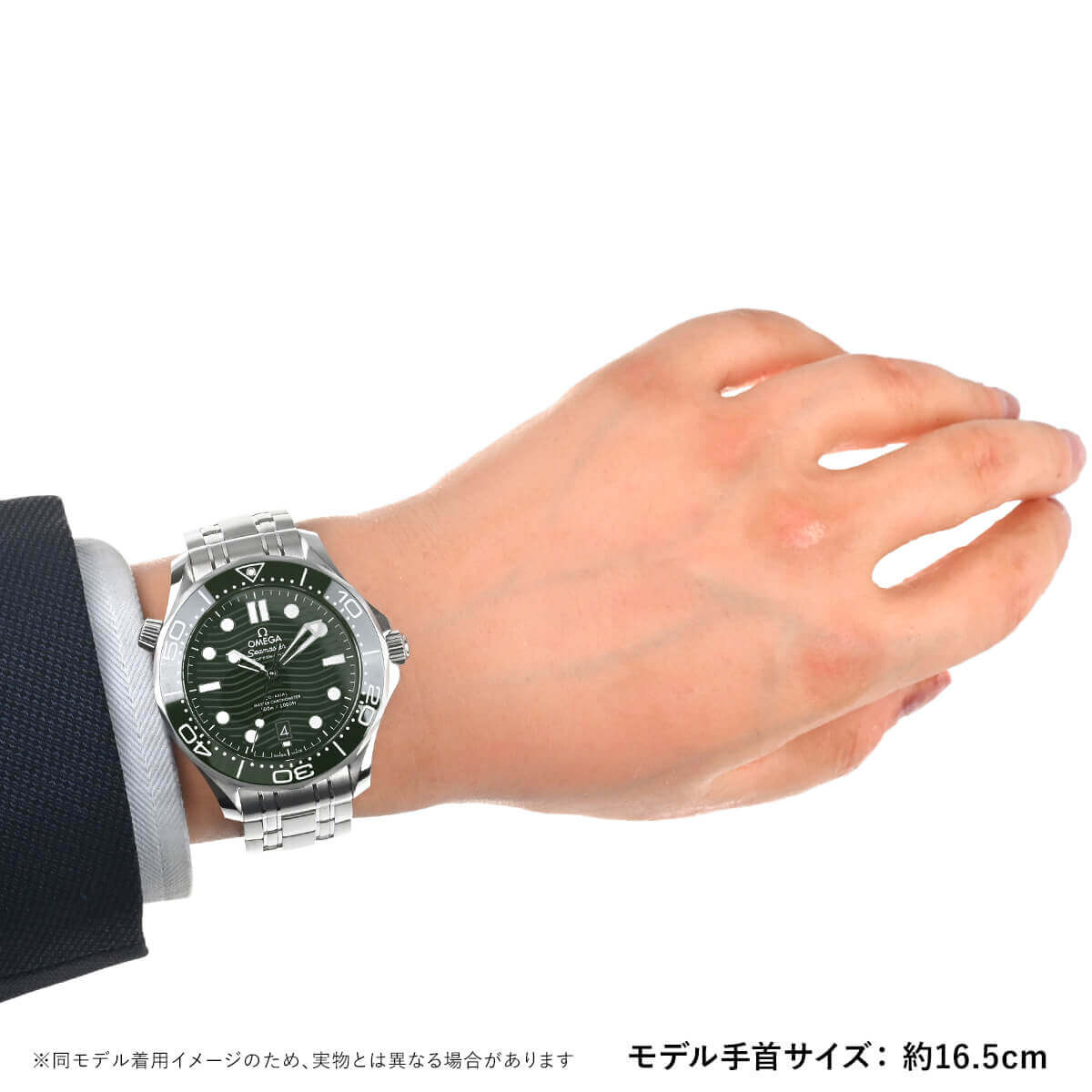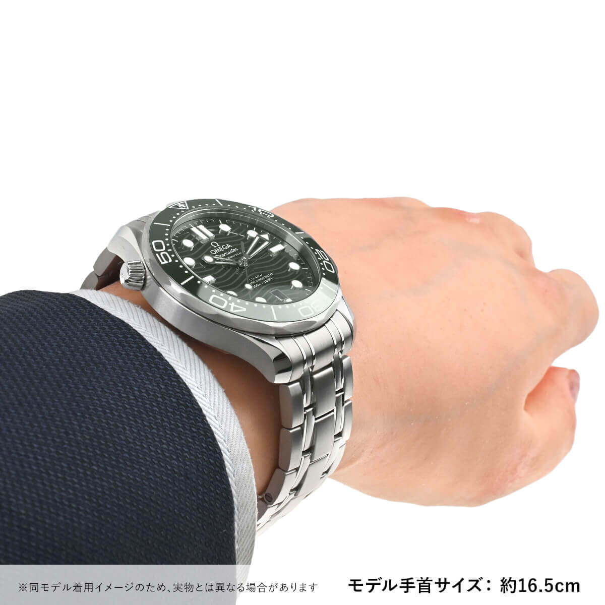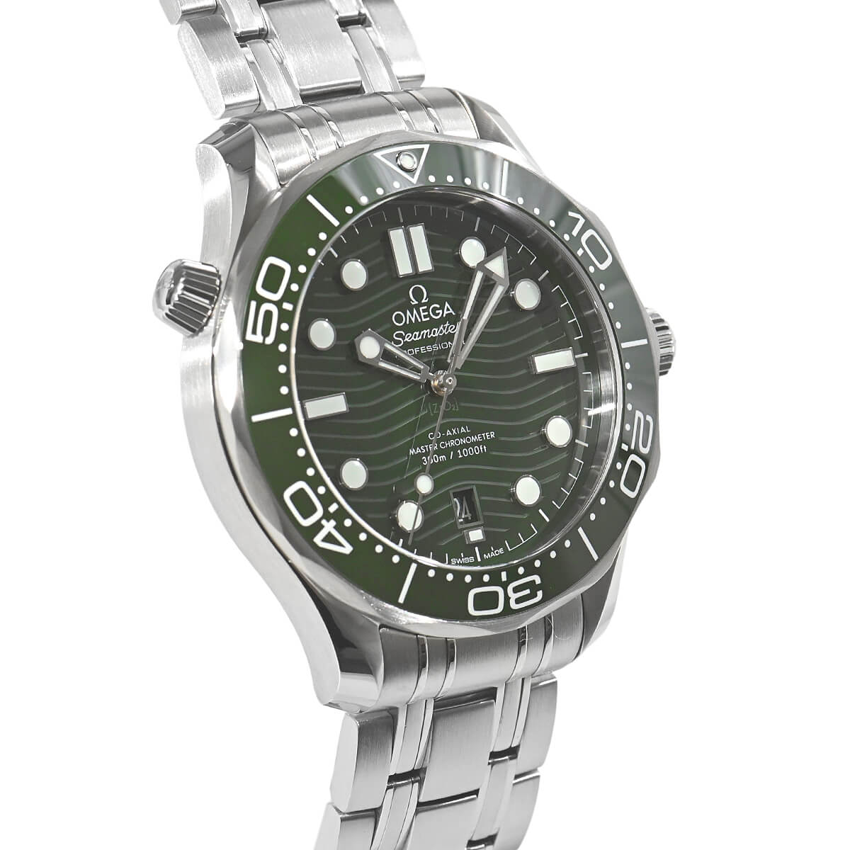1993年に発表された【シーマスター ダイバー300M】が25周年を迎えた2018年にフルモデルチェンジを果たしました。こちらは2022年に追加されたグリーン文字盤モデル。文字盤とダイビングベゼルには耐久性に優れたセラミックを採用し、ベゼルのスケール部分には白さと耐久性向上の為に新たにホワイトエナメルを採用。また、ダイアルもポリッシュ仕上げのグリーンセラミック製で、レーザーエングレービングによる波模様と6時位置の日付表示が特徴です。