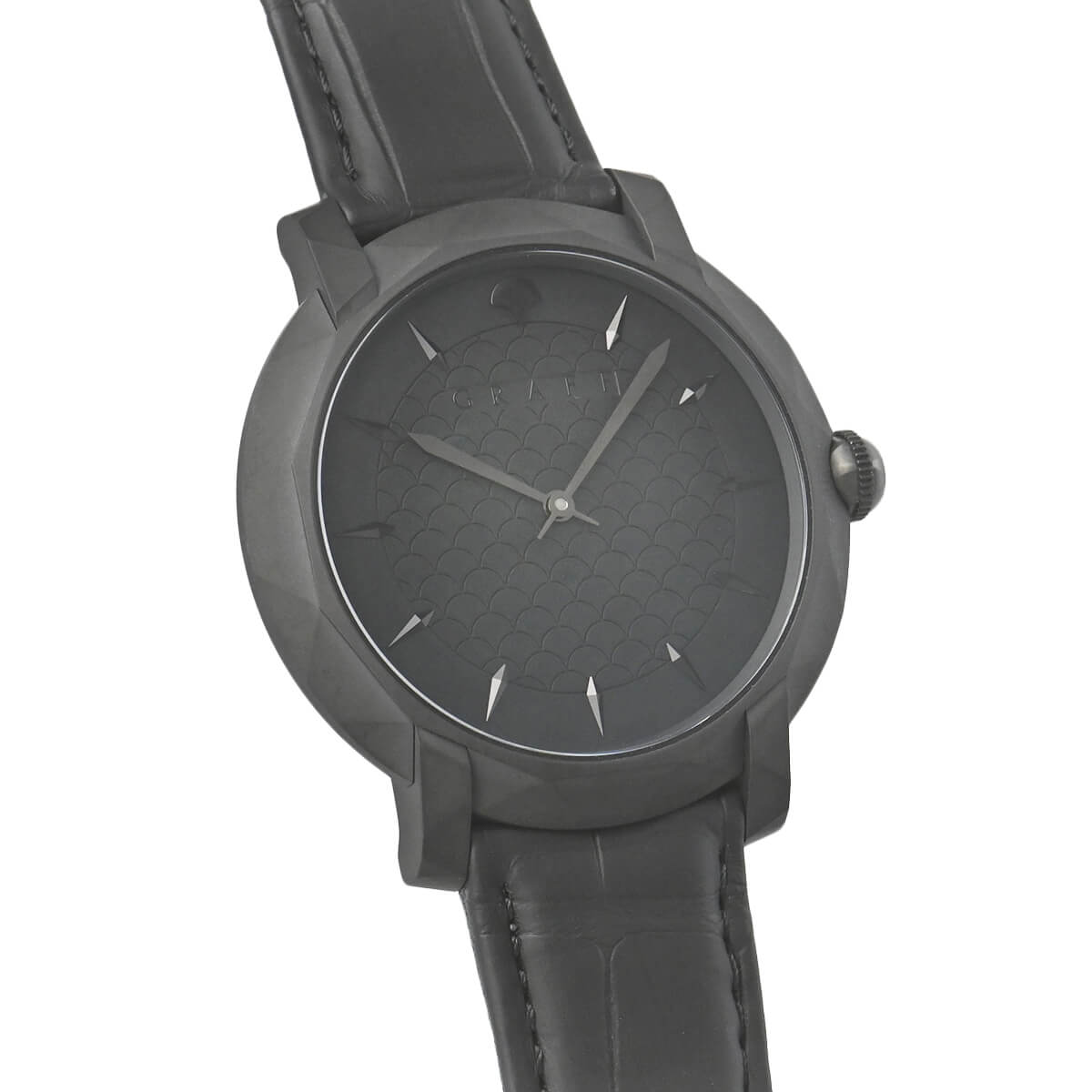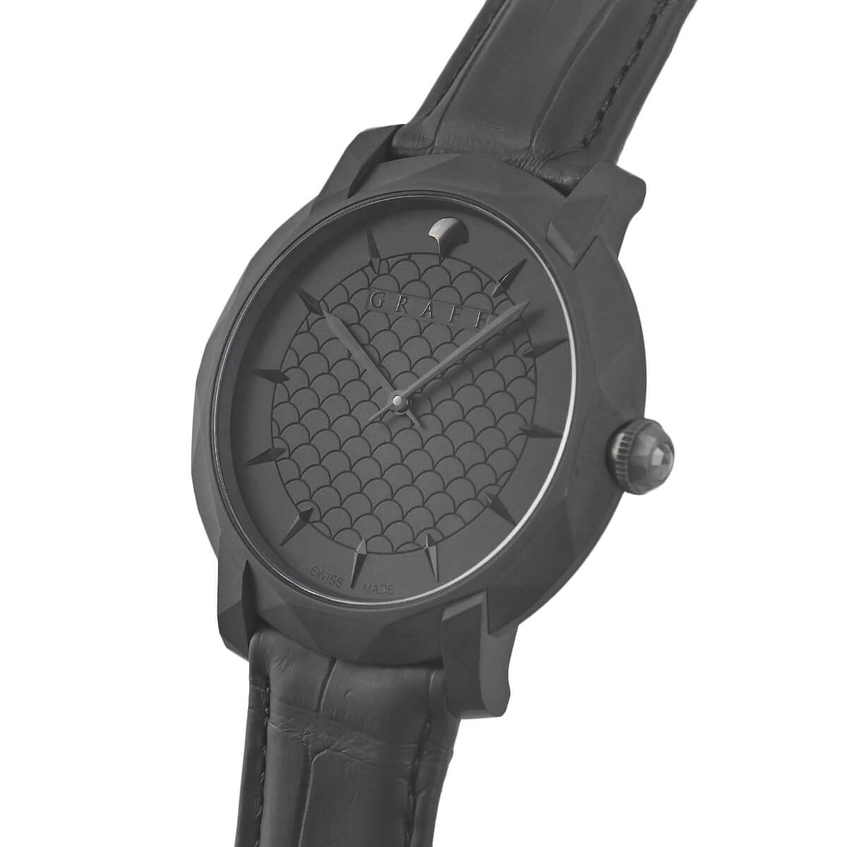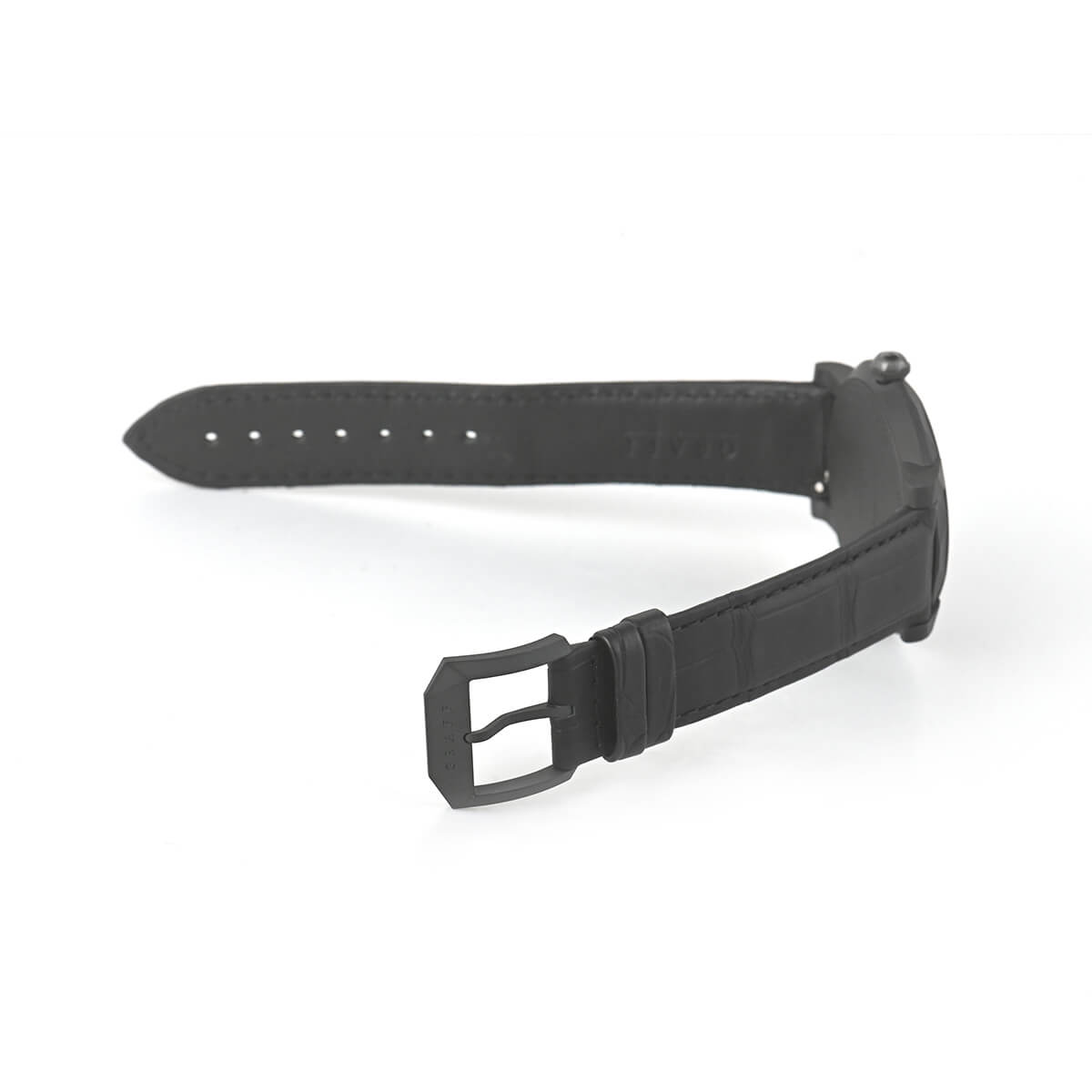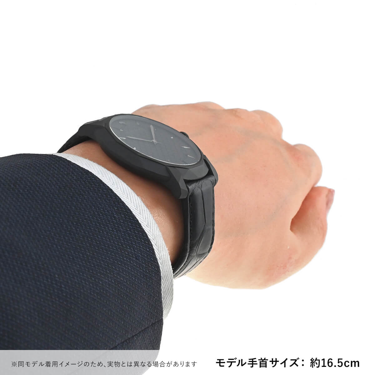 厚さ7mmの薄いチタン製ケースは、DLCコーティングを施され、クールな印象を与える一本です。