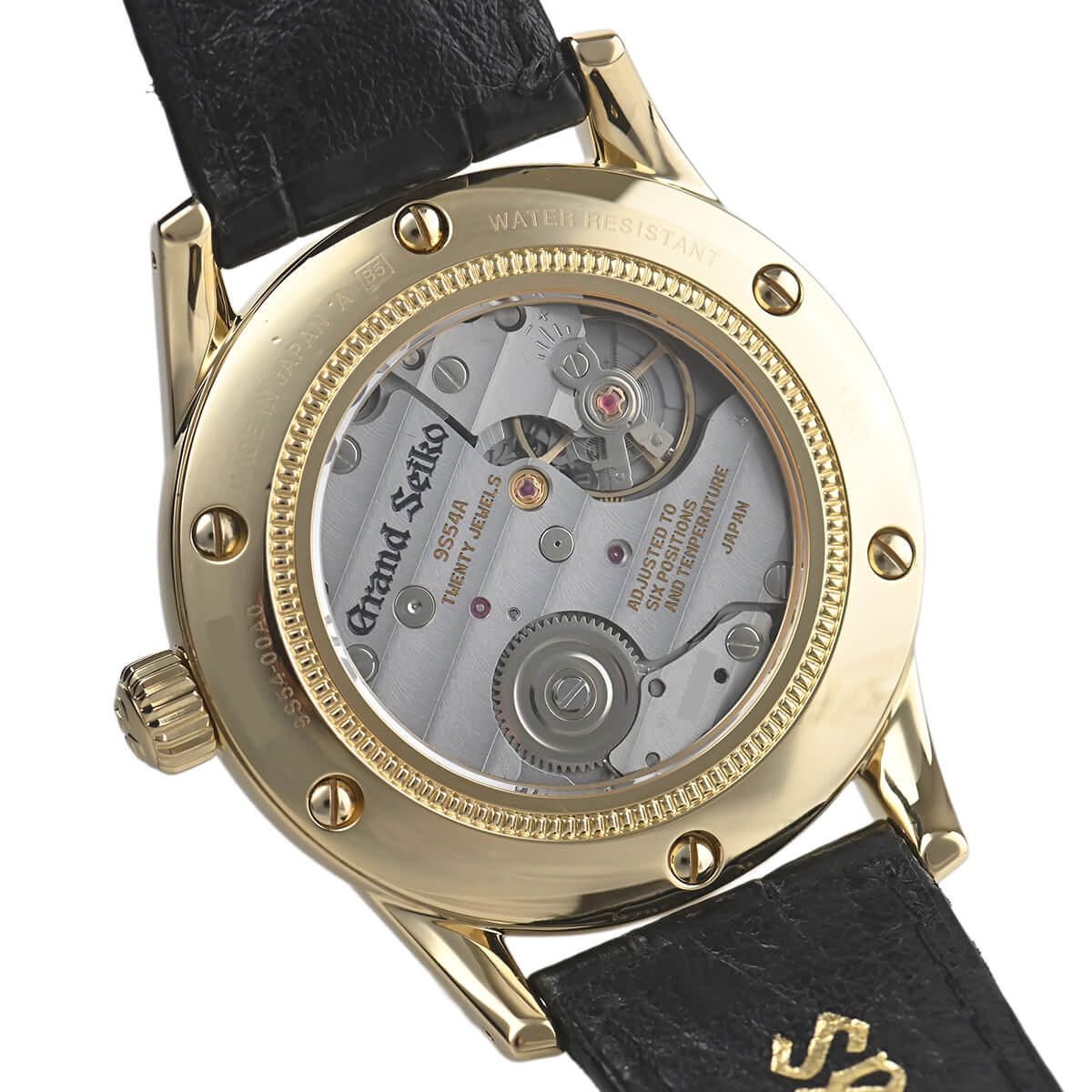 手巻式9Sメカニカルムーブメントを搭載した、18Kイエローゴールド製のマスターショップ限定モデル「SBGW008」。セイコーらしいクラシカルなフォルムをボックス型サファイアガラスで再現し、裏蓋はムーブメントの美しさをご堪能いただけるようシースルーバック仕様となっています。