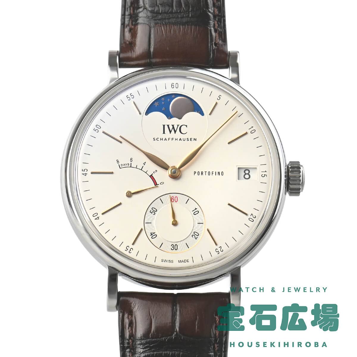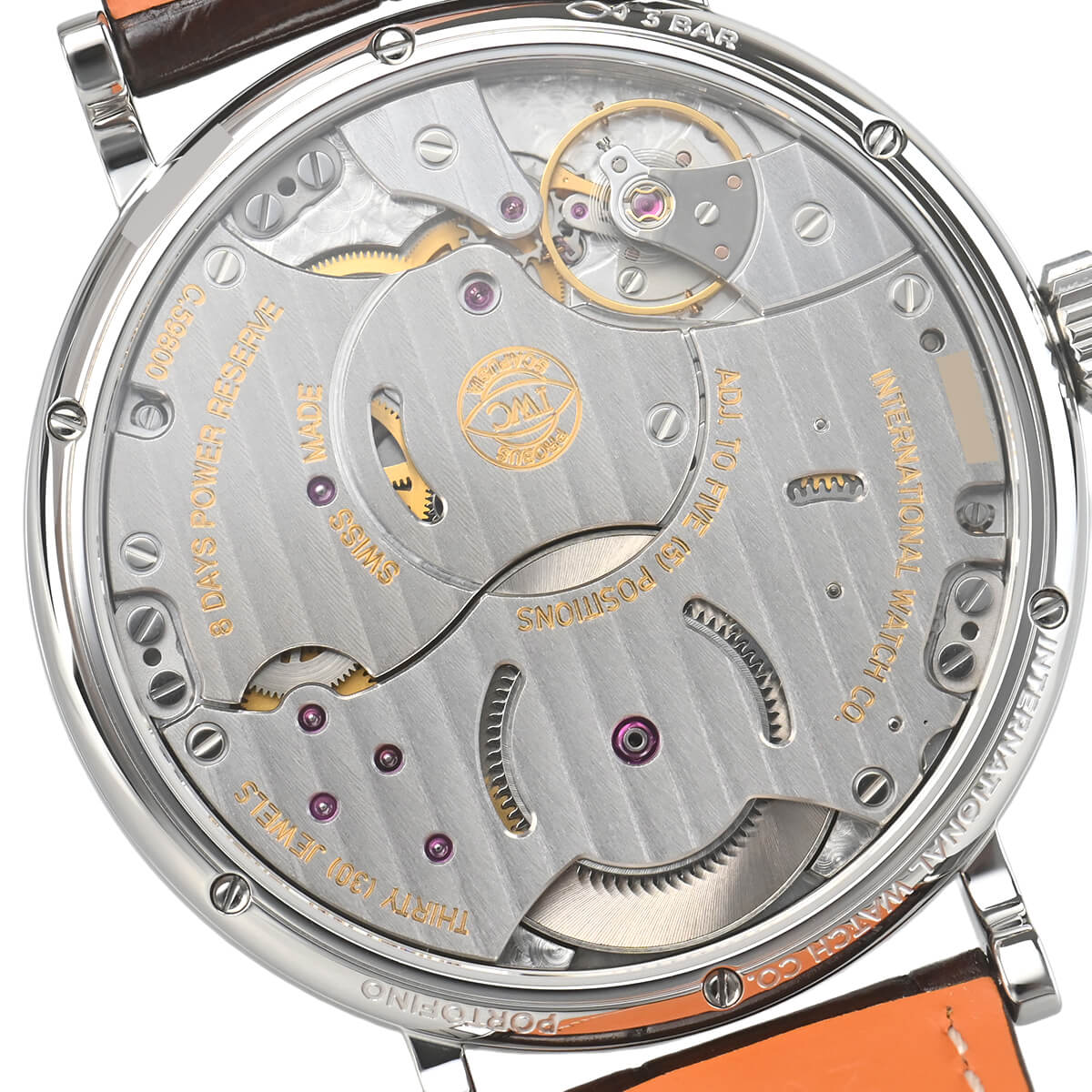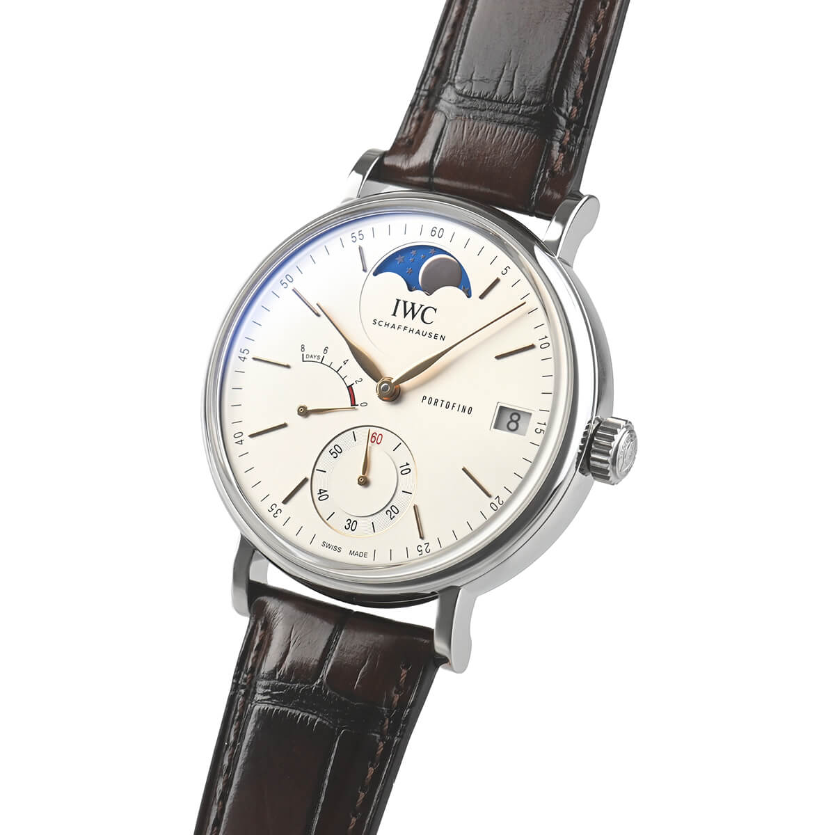 【ポートフィノ ハンドワインド ムーンフェイズ 】は、ムーブメントに手巻き式、8日間パワーリザーブのCal.59000をベースに新たにムーンフェイズモジュールを組み込んだCal.59800を搭載します。12時位置のムーンフェイズは実際の月の形と一日分の差異が生じるまでに577.5年もの年月が必要な驚異的な精度を誇ります。