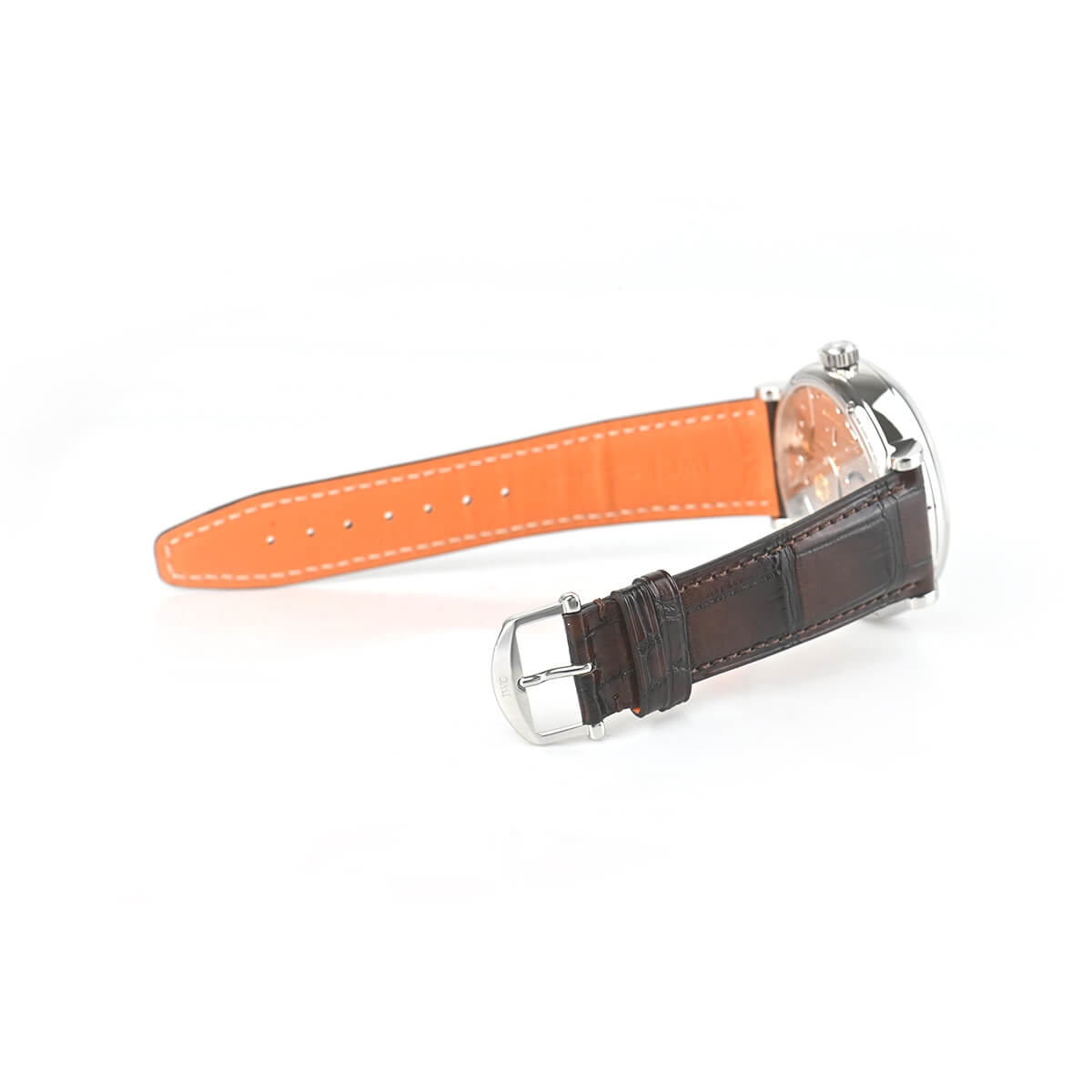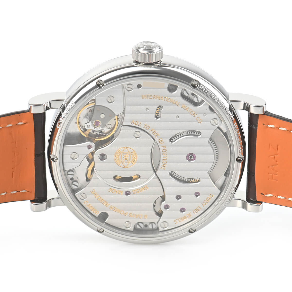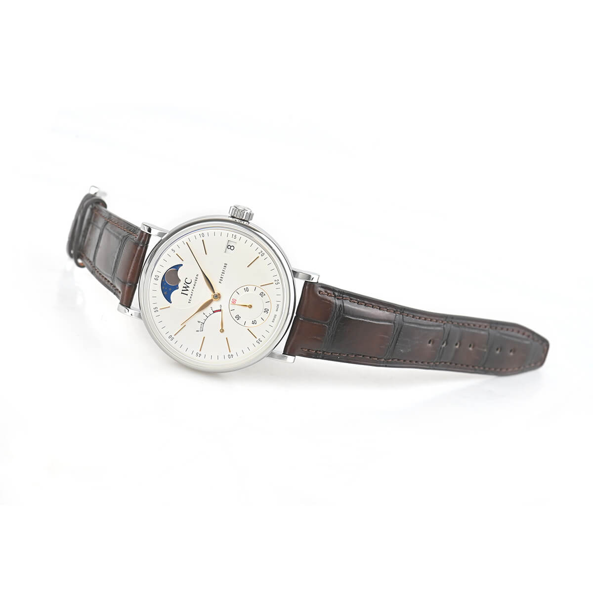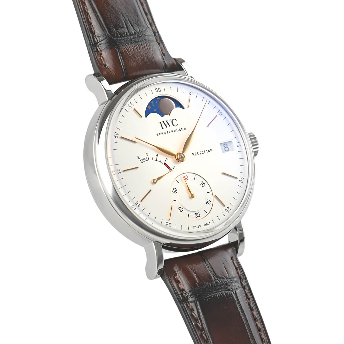 【ポートフィノ ハンドワインド ムーンフェイズ 】は、ムーブメントに手巻き式、8日間パワーリザーブのCal.59000をベースに新たにムーンフェイズモジュールを組み込んだCal.59800を搭載します。12時位置のムーンフェイズは実際の月の形と一日分の差異が生じるまでに577.5年もの年月が必要な驚異的な精度を誇ります。