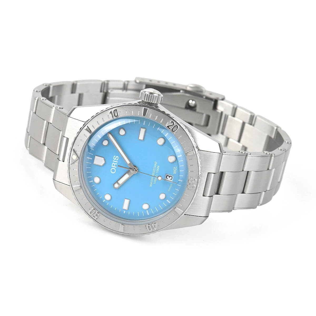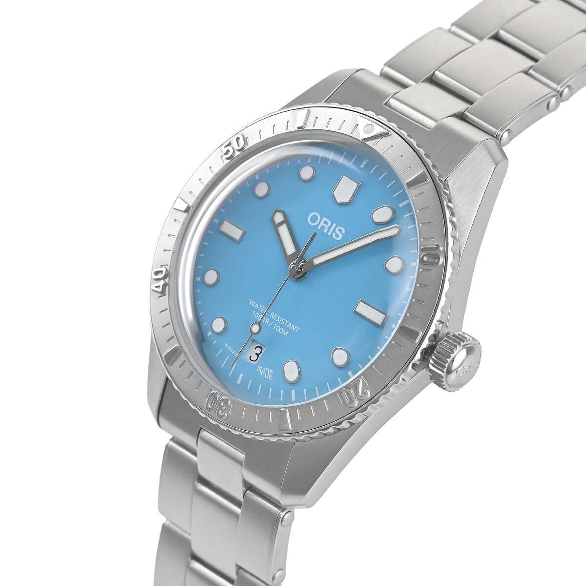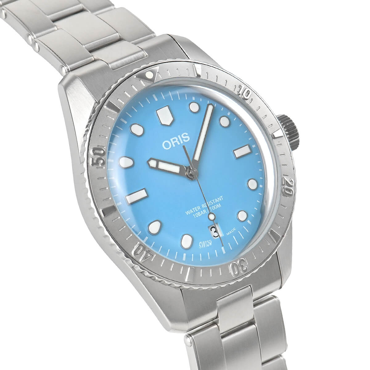 1965年に誕生したオリスのダイバーウォッチは、クロムメッキ仕上げの真鍮ケースにプレキシガラス風防を合わせ、防水性能は10気圧を誇りました。こちらは、オリジナルのデザインと趣はそのままに現代風のアレンジが加えられ、ステンレスケースにドーム型無反射コーティングサファイアクリスタルガラスを採用した「ダイバーズ65」にポップなダイヤルを合わせた「ダイバーズ65 コットンキャンディ」。