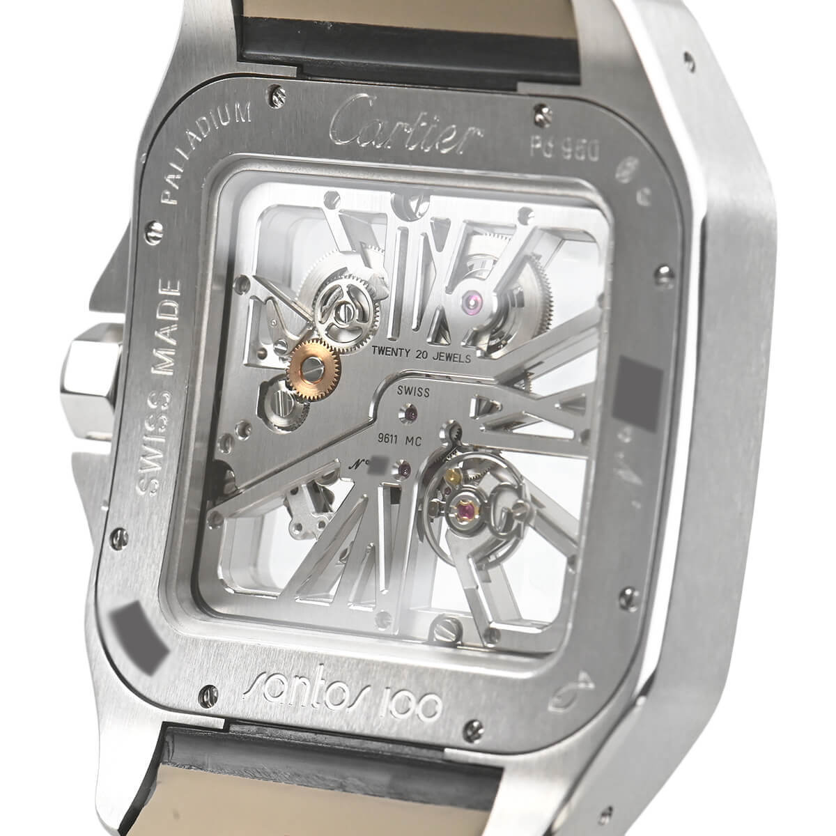 サントス誕生100周年を記念して販売された「サントス100」。こちらはケース素材にパラジウムを採用したスケルトンモデルです。