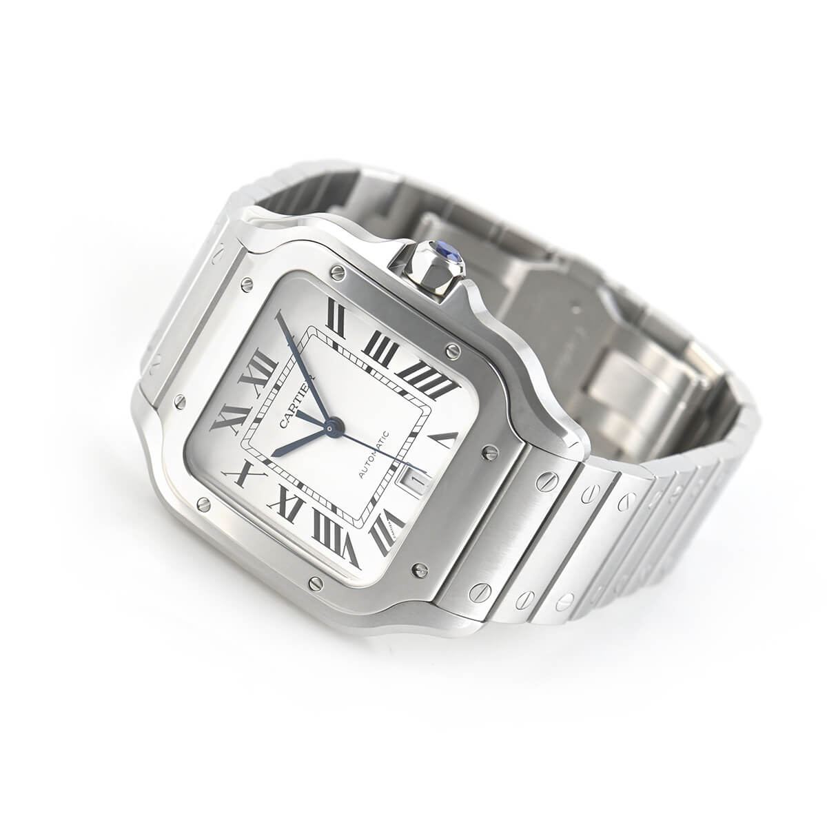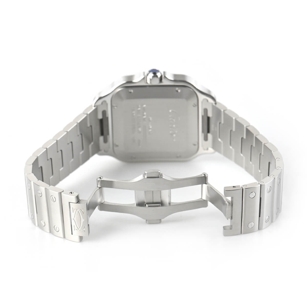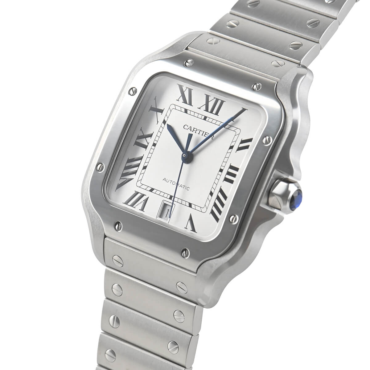 文字盤のローマインデックスとその内側に描かれた四角のレイルウェイ分目盛はカルティエウォッチを特徴づけ、またケースとブレスレットにはサントスウォッチ特有のビスモチーフが施されます。