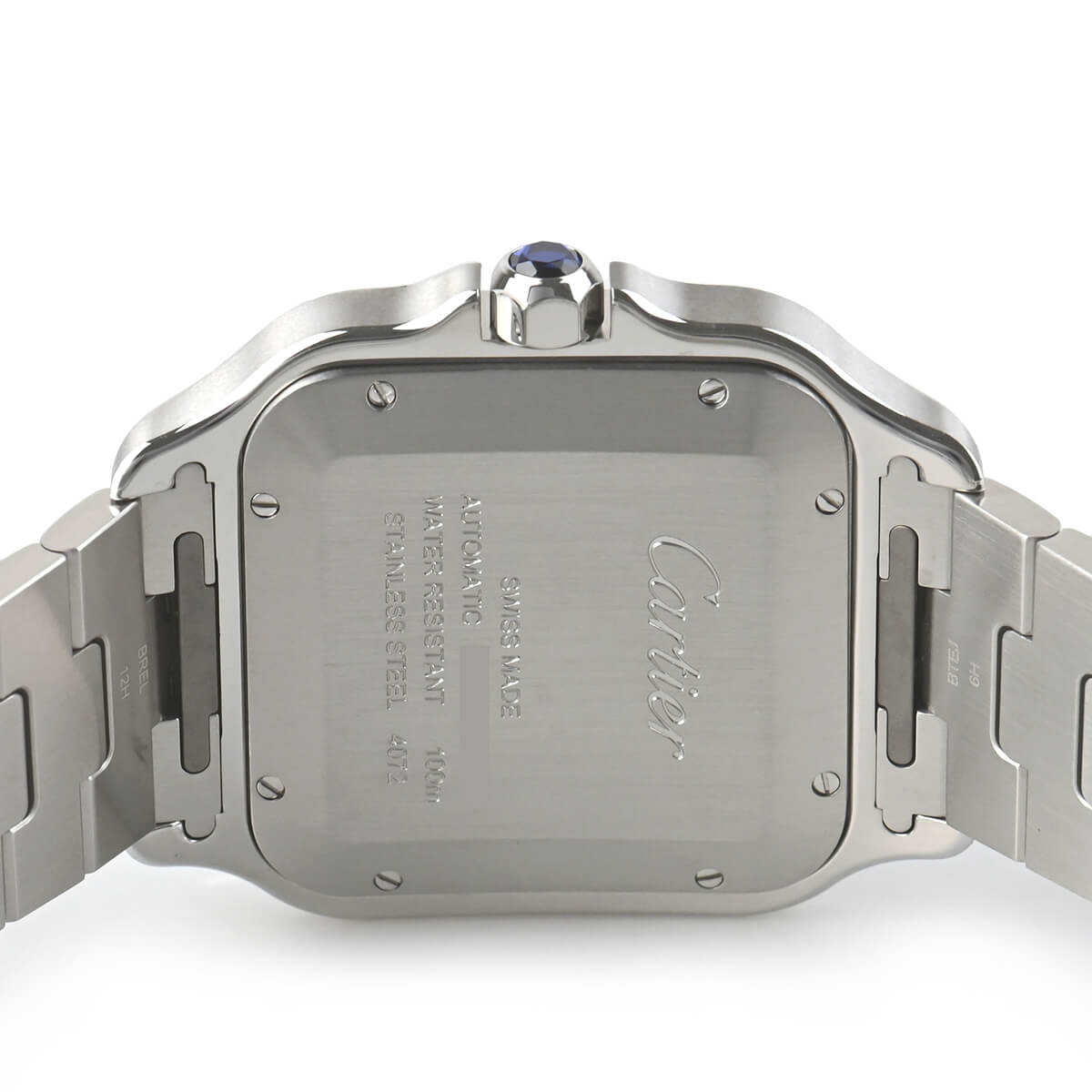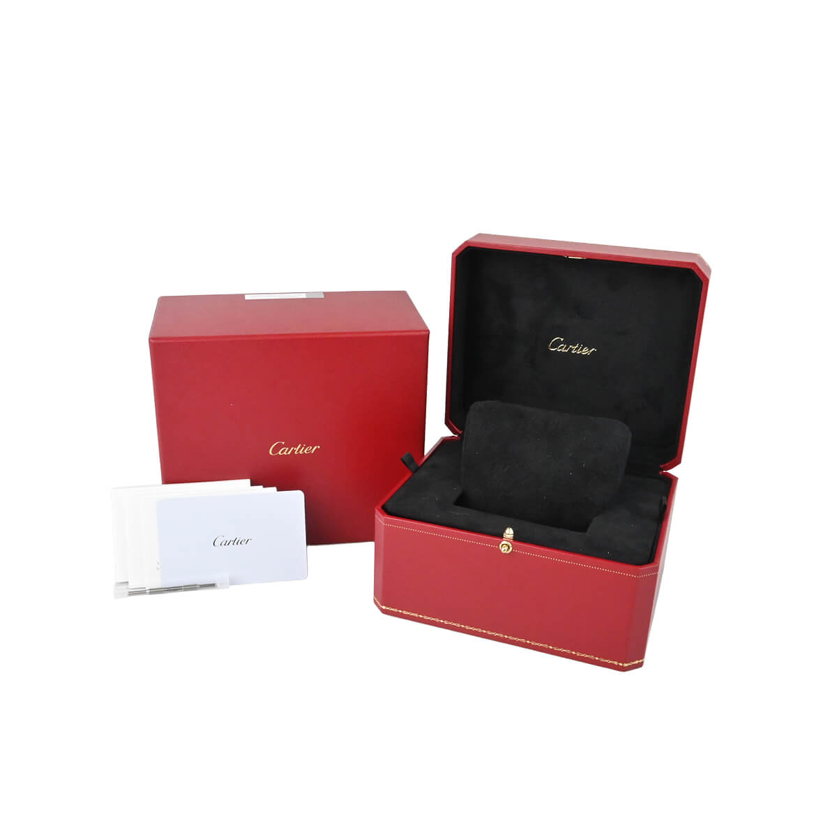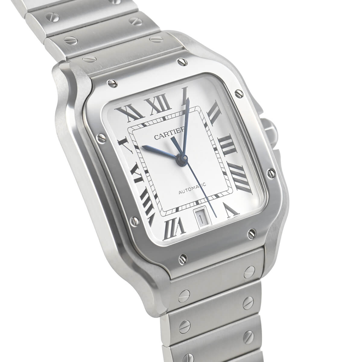 文字盤のローマインデックスとその内側に描かれた四角のレイルウェイ分目盛はカルティエウォッチを特徴づけ、またケースとブレスレットにはサントスウォッチ特有のビスモチーフが施されます。