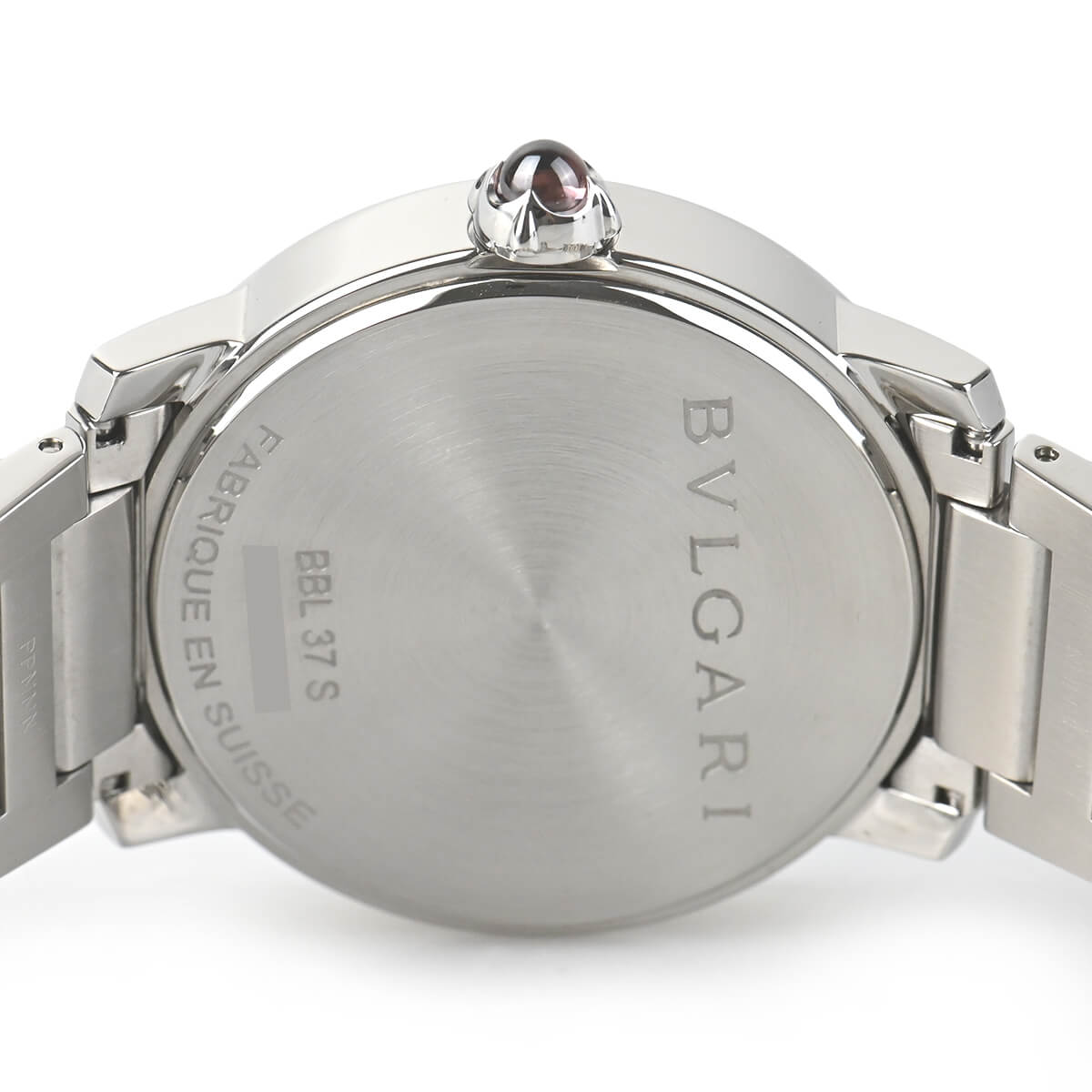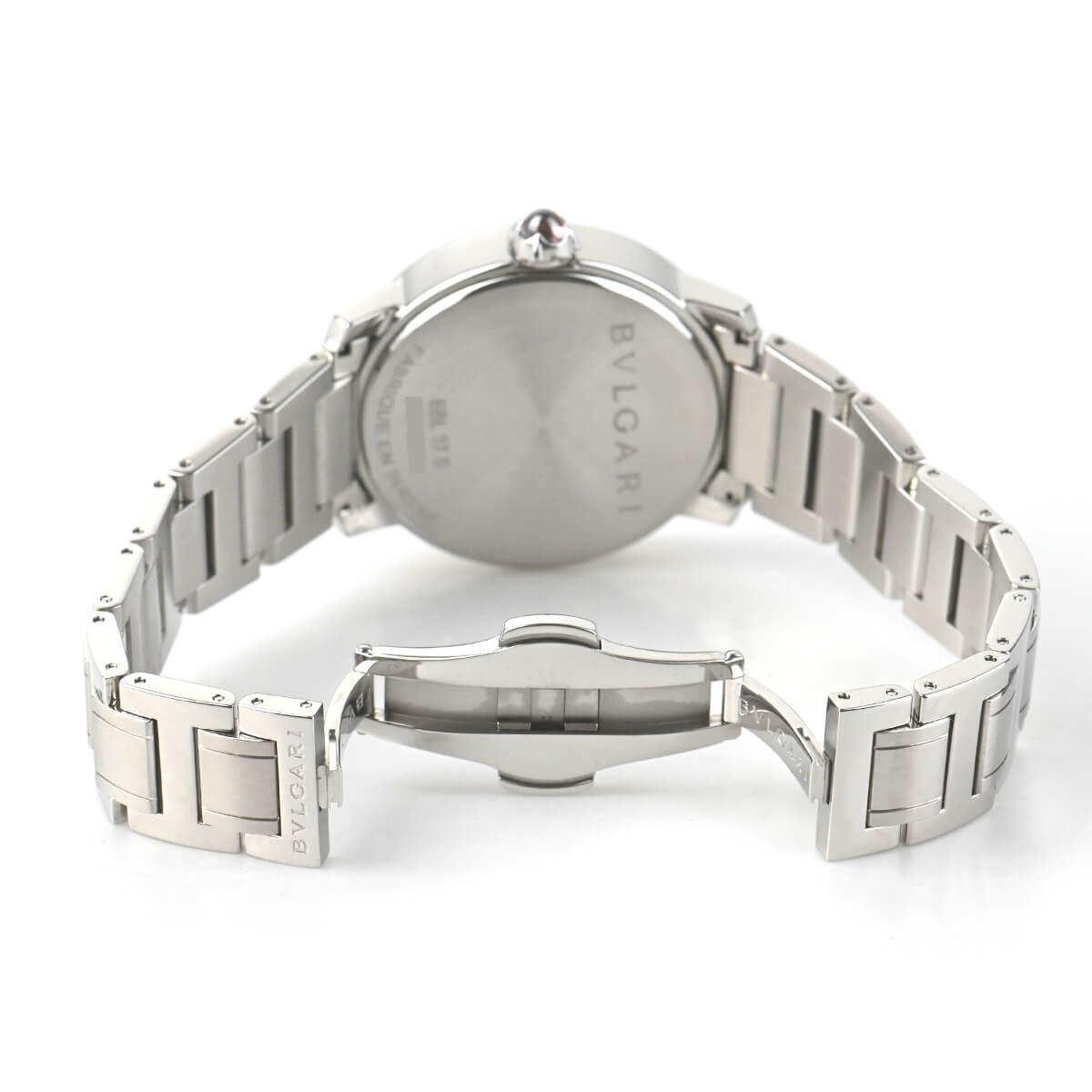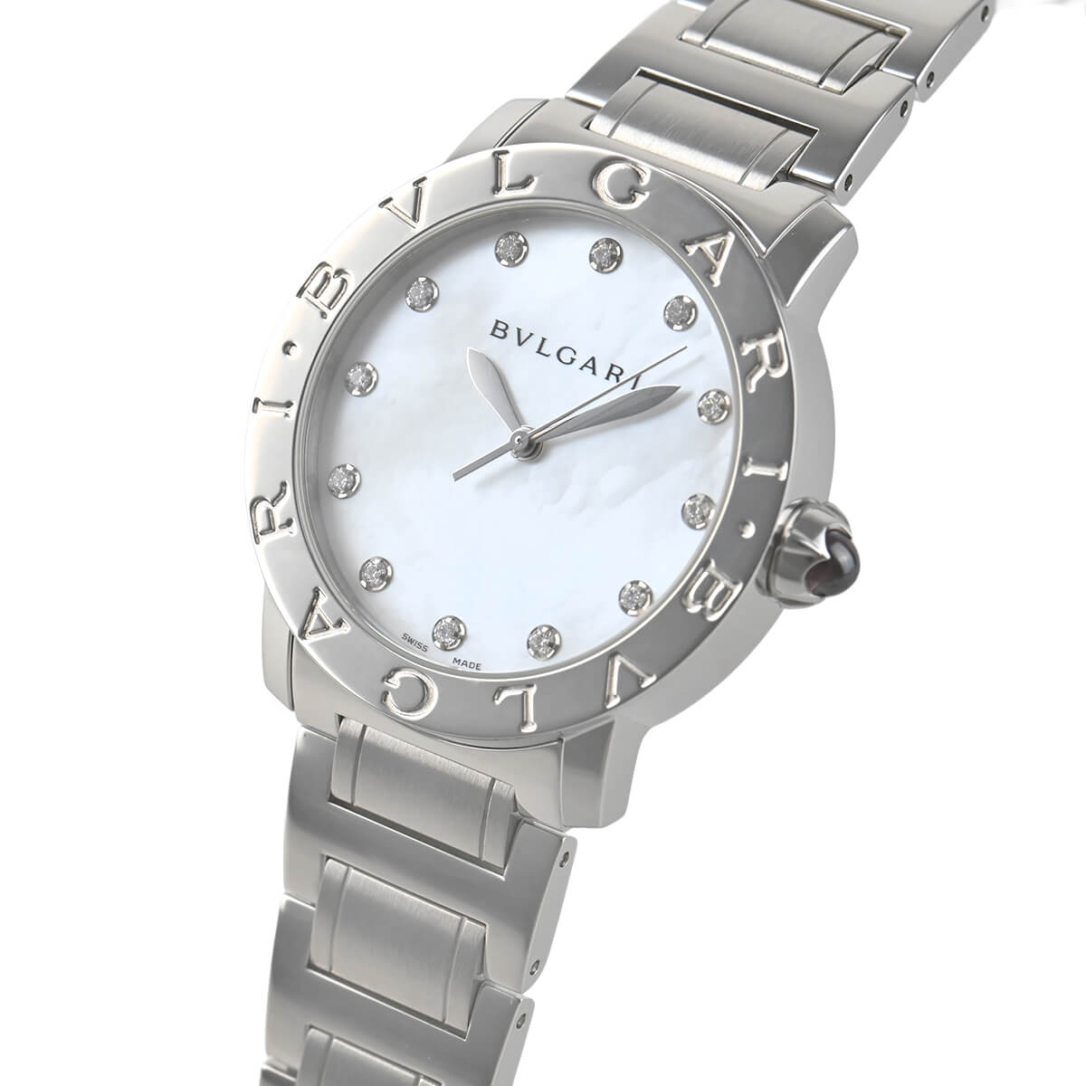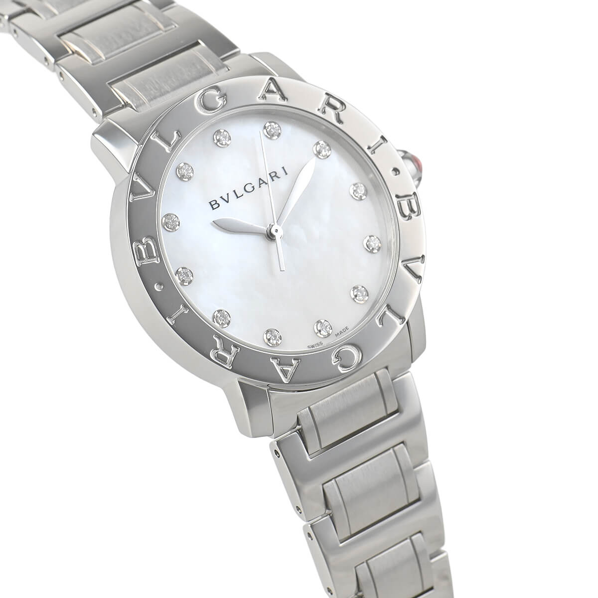 こちらは37mmケースのステンレスのブルガリ・ブルガリとなり、ホワイト・マザーオブパールダイアルには12ポイントのダイヤセッティングが施されています。