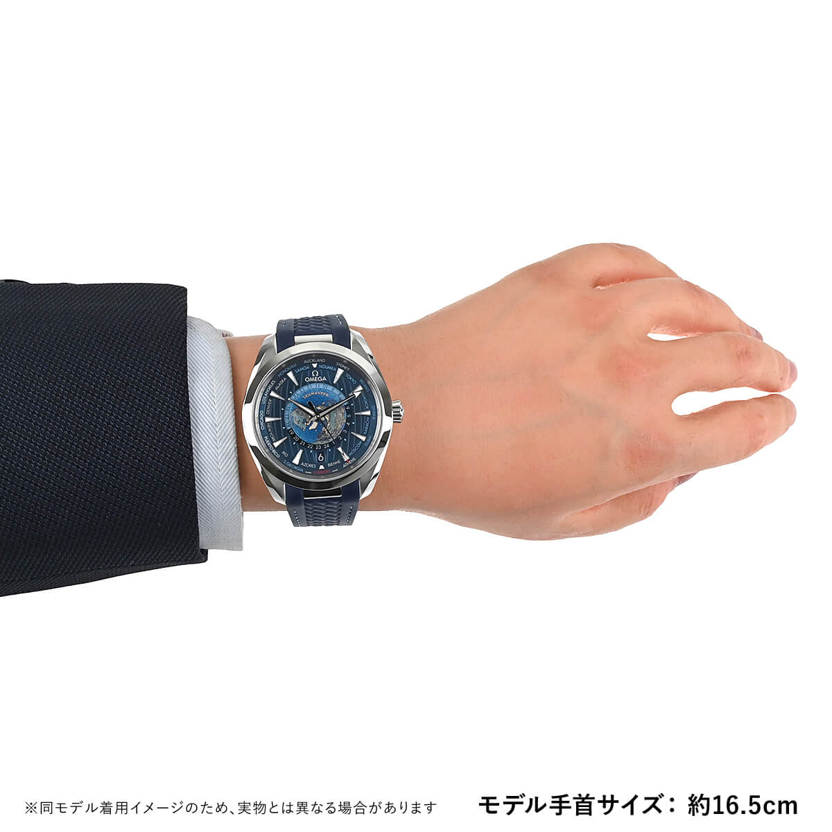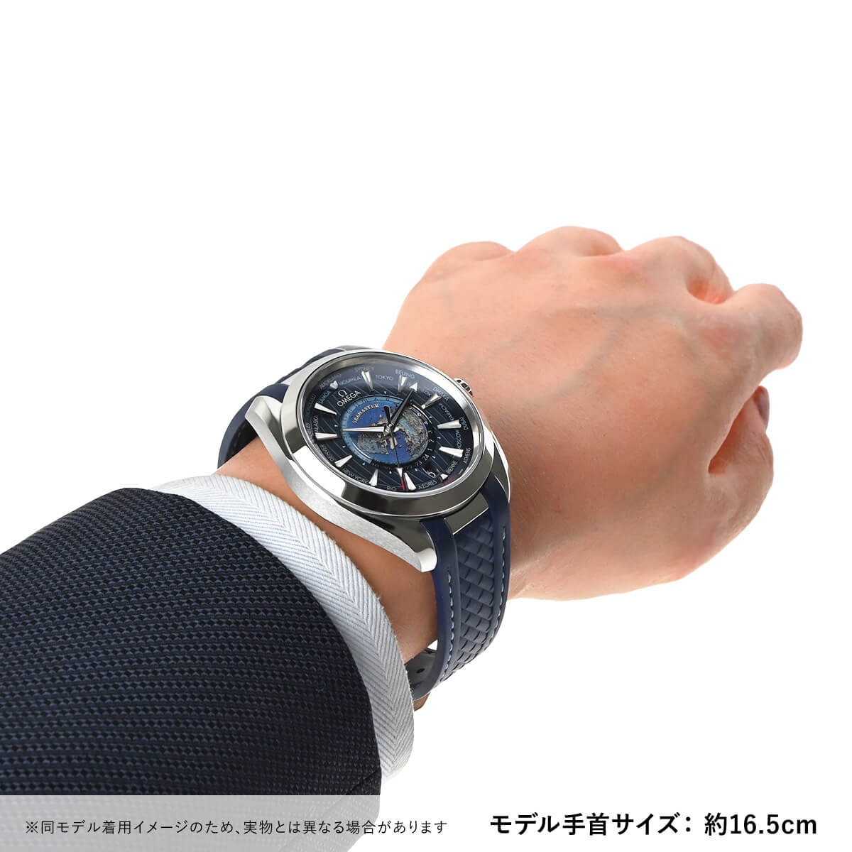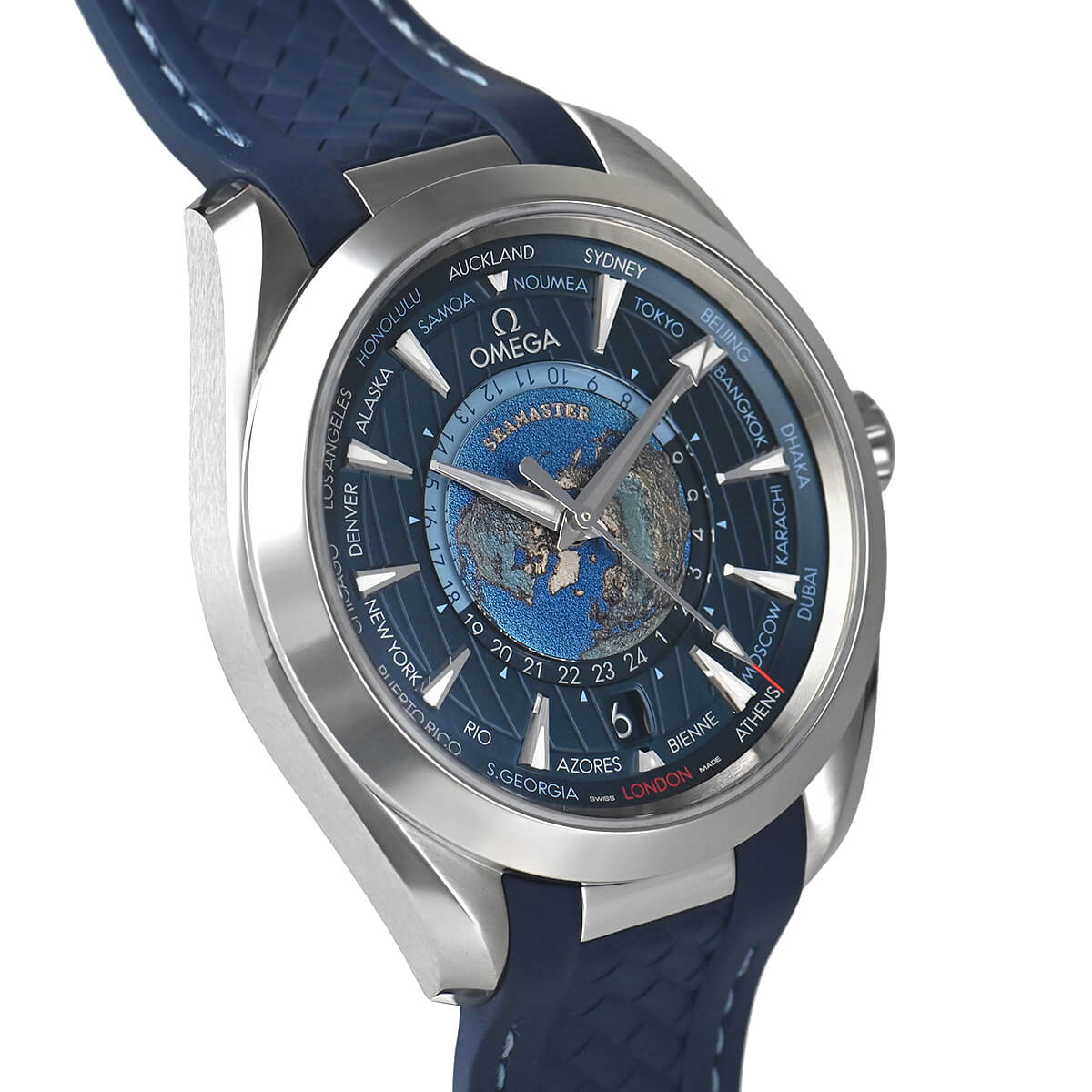 シーマスター アクアテラへ追加された、43mmのワールドタイマー「220.12.43.22.03.001」。ダイヤル中央の地球は、レーザーで削り青い海を作り、大陸を立体的に残しています。