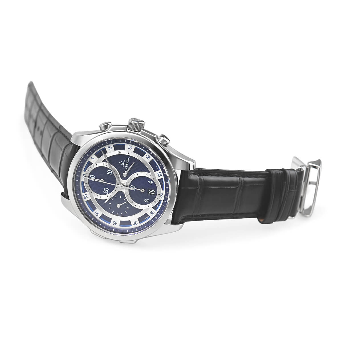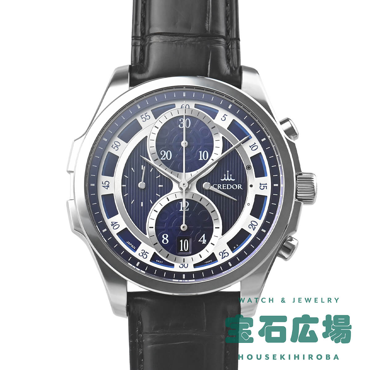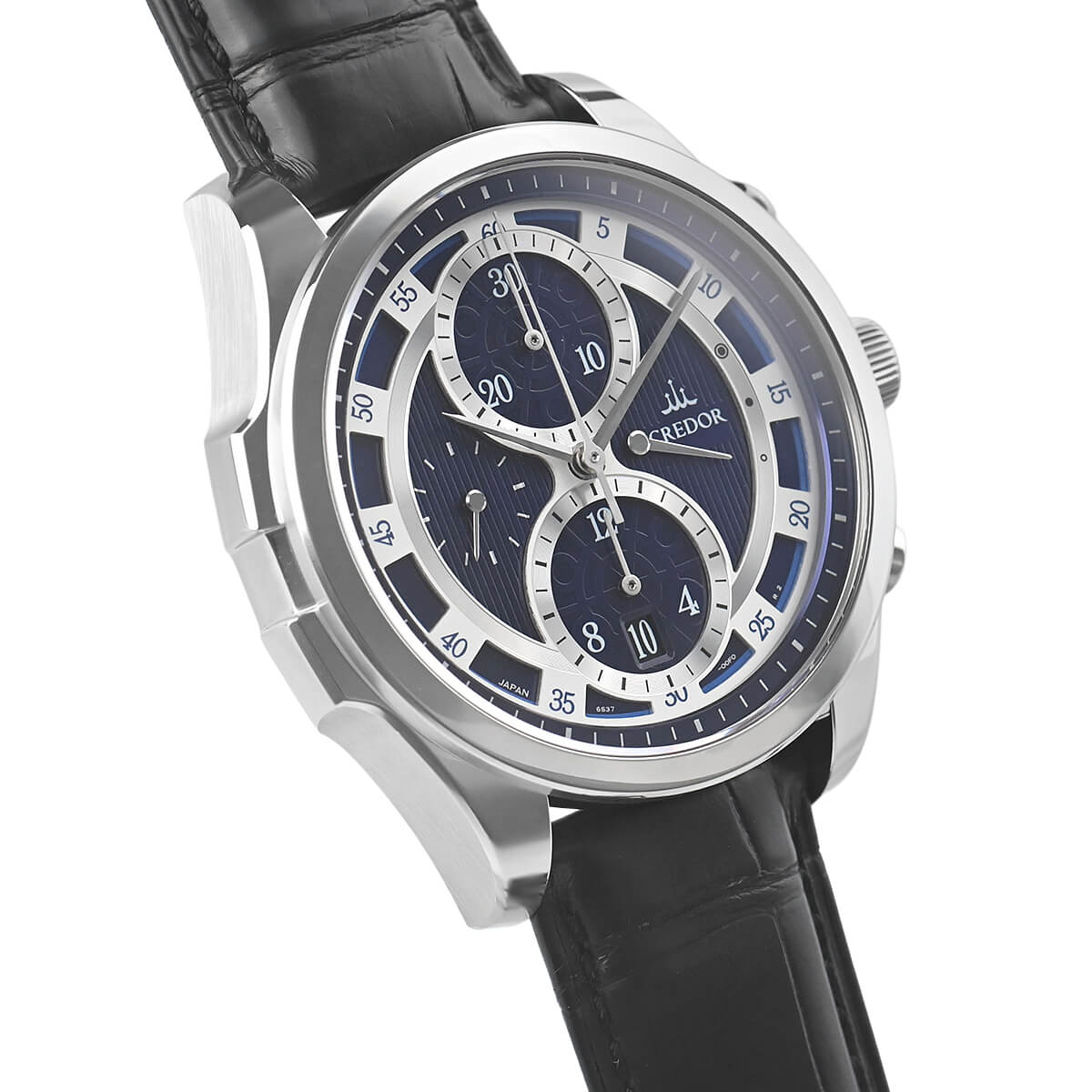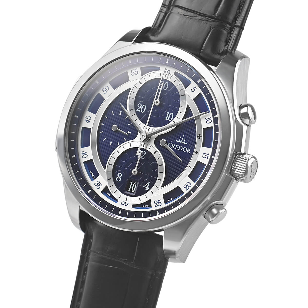 スペイン語で「記号:しるし」の意味の名を持つ「クレドール シグノ」。こちらはブルー文字盤に個性的なダイヤルデザインの「GCBK979」です。
