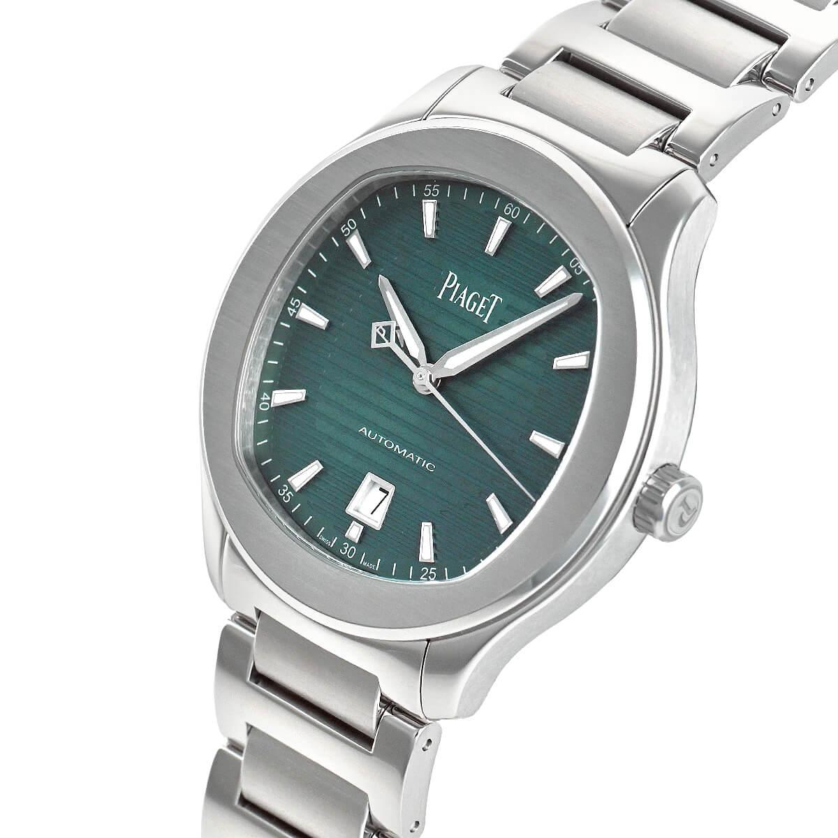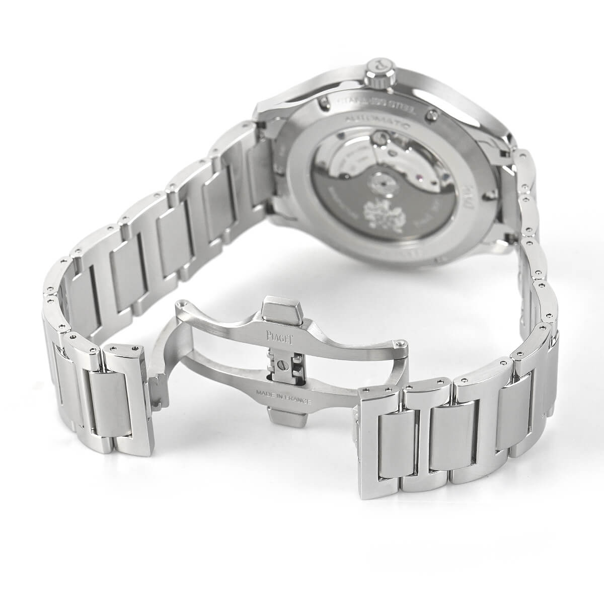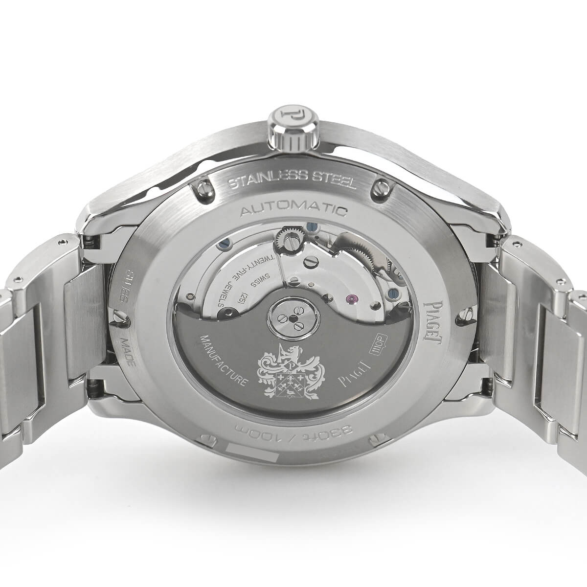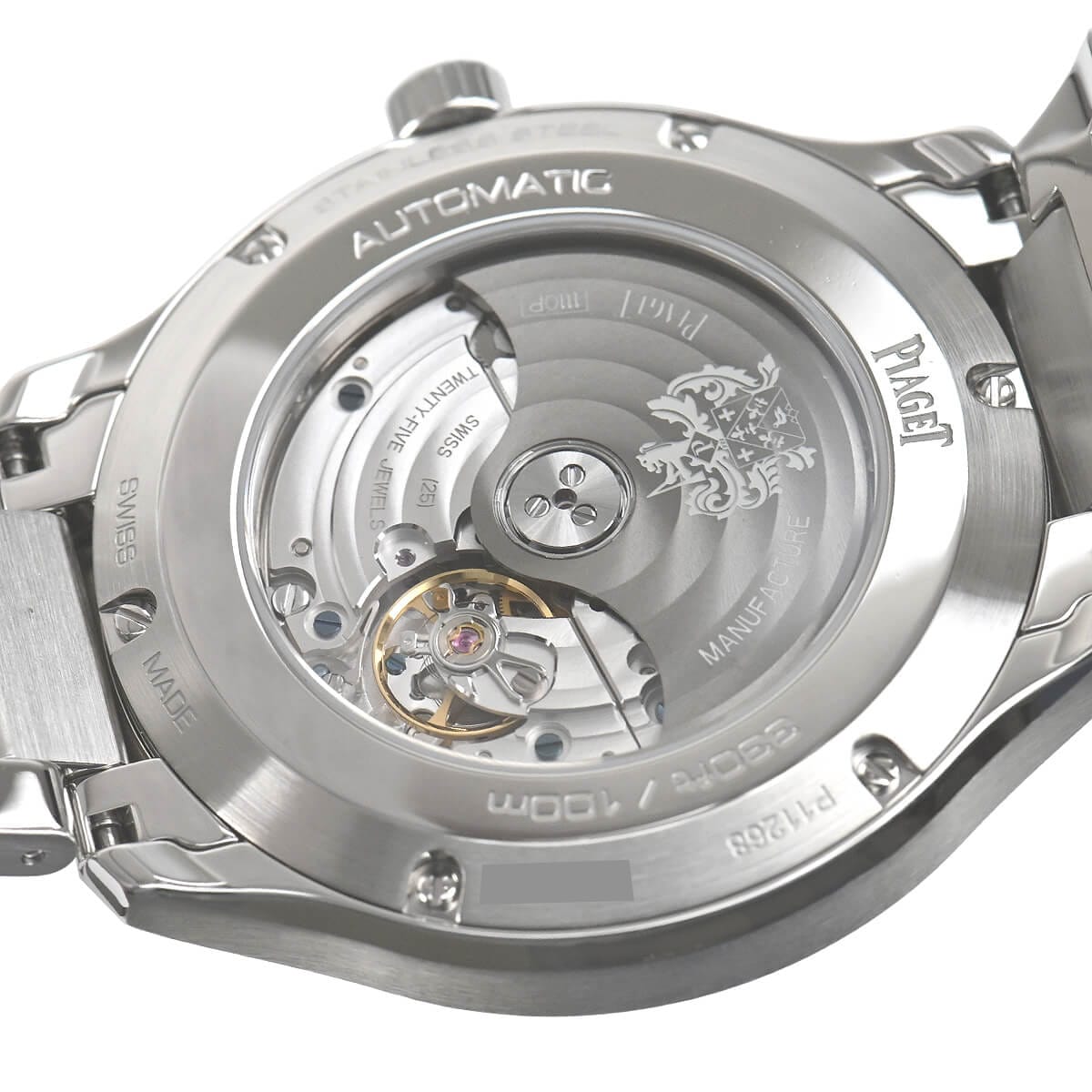 シースルーバックからは、新しく開発された1110Pピアジェ自社製極薄自動巻ムーブメントが鑑賞できます。ピアジェの紋章が刻印されたチャコールグレーのローターも見ものです。