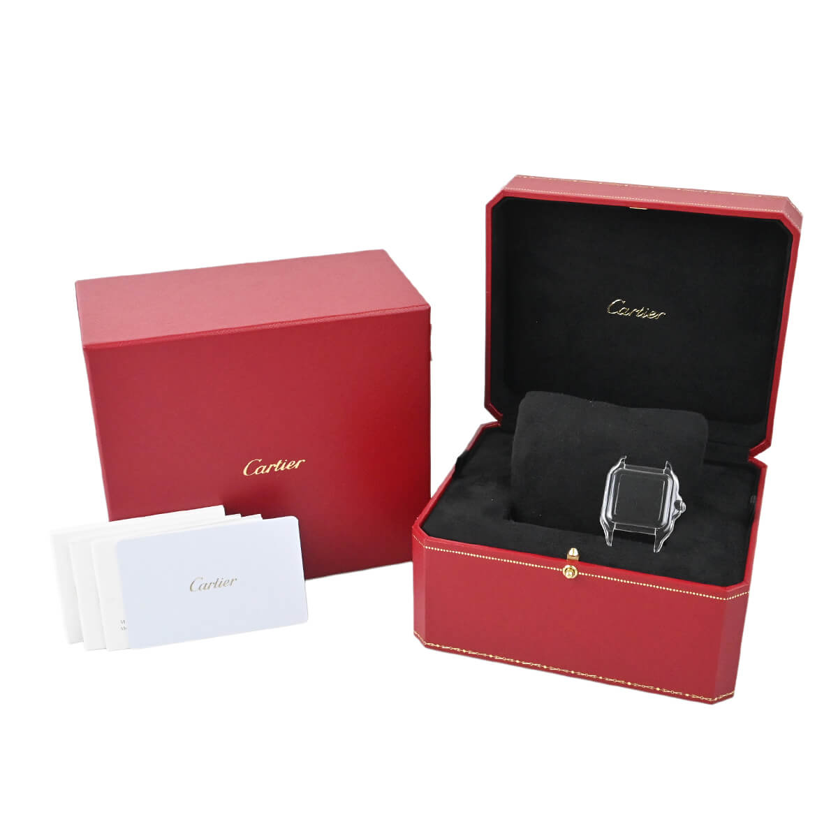 文字盤は内側にレイルロードを設けたローマインデックスで、美しく仕上げられたブルースチール針との組み合わせもカルティエらしく絶妙なバランスを保っています。