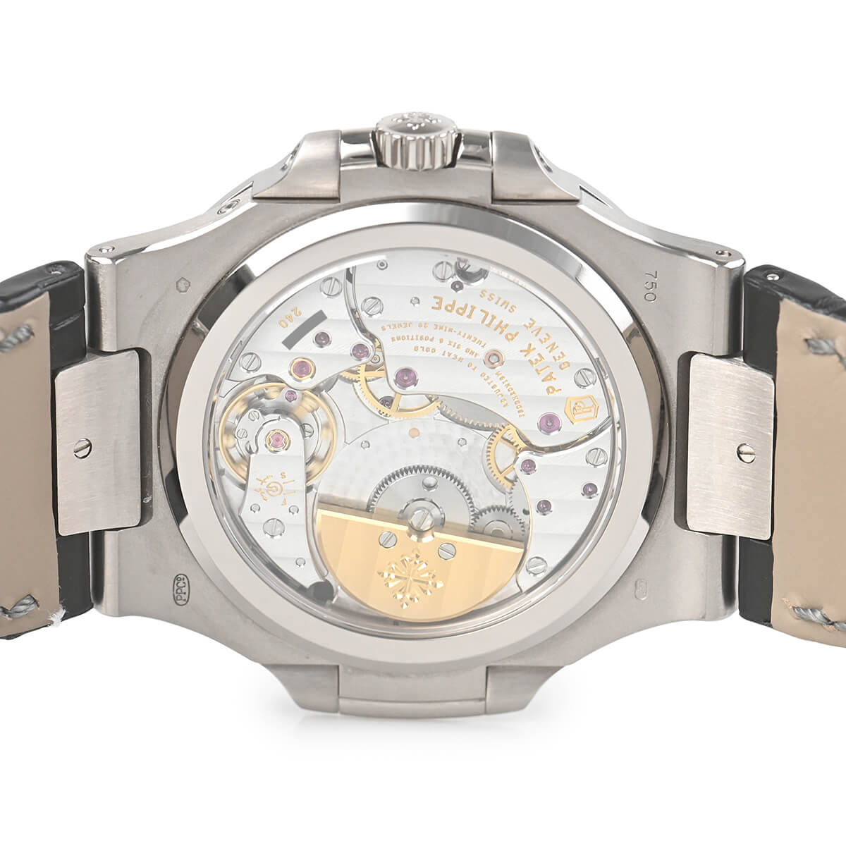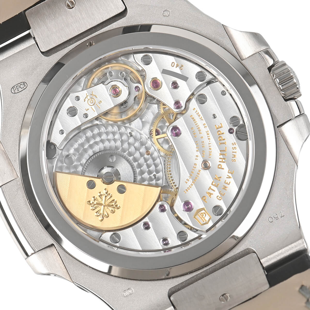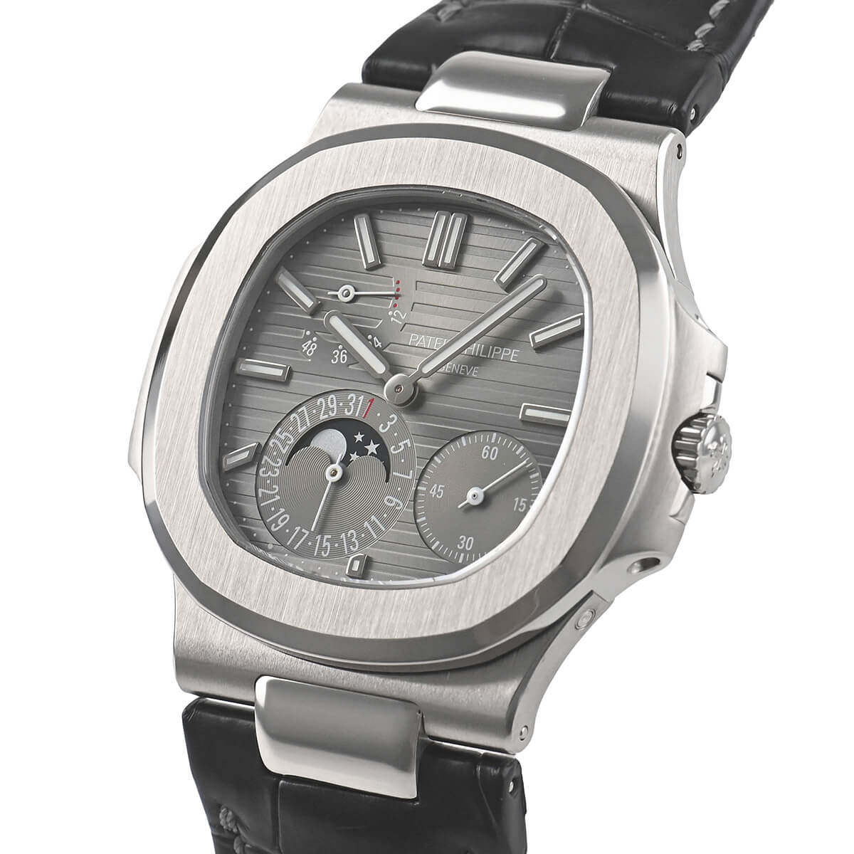 ノーチラスのプチコンプリケーションモデル「5712」。文字盤にはムーンフェイズのほかにパワーリザーブインジケーターや日付表示と、さまざまな機能が搭載されています。ムーブメントはキャリバー240が搭載され、その特徴であるマイクロローターにより、驚異的な薄さを実現。
