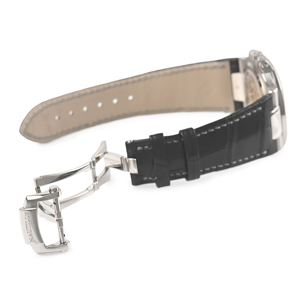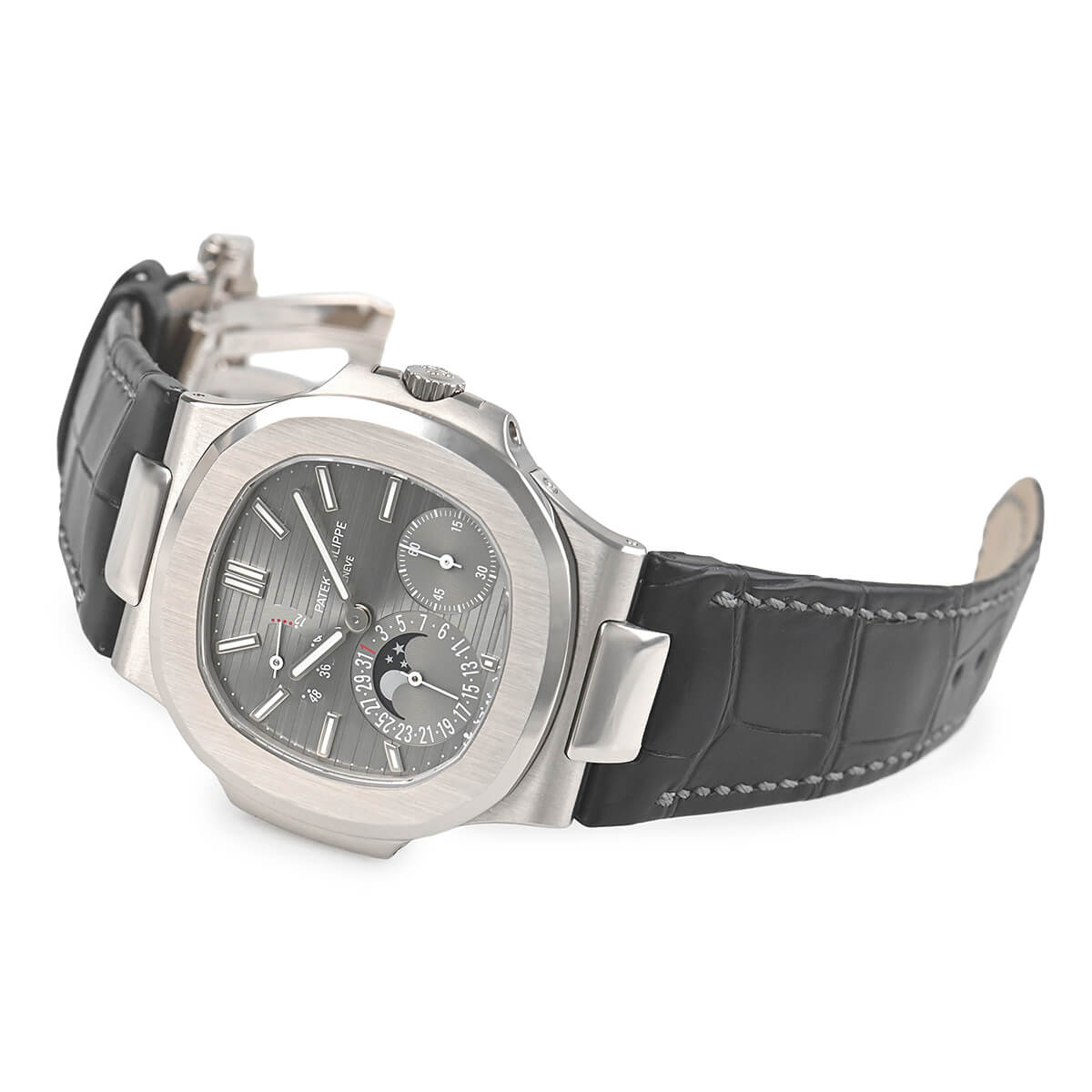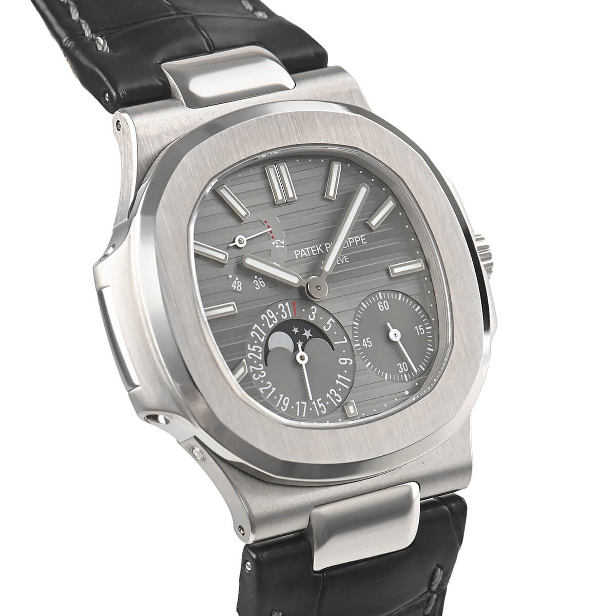ノーチラスのプチコンプリケーションモデル「5712」。文字盤にはムーンフェイズのほかにパワーリザーブインジケーターや日付表示と、さまざまな機能が搭載されています。ムーブメントはキャリバー240が搭載され、その特徴であるマイクロローターにより、驚異的な薄さを実現。