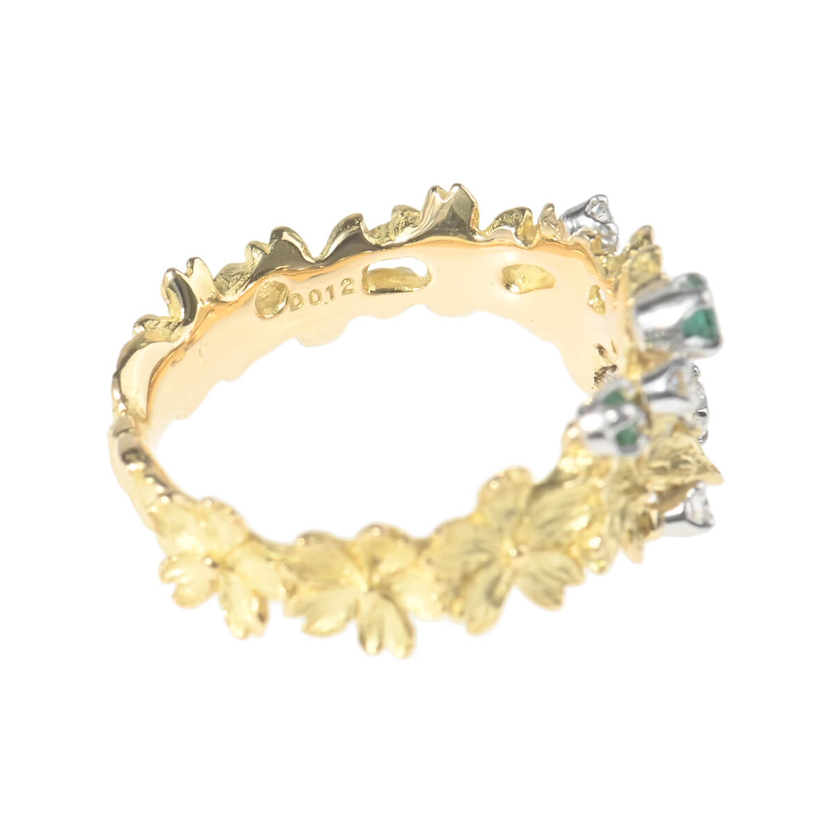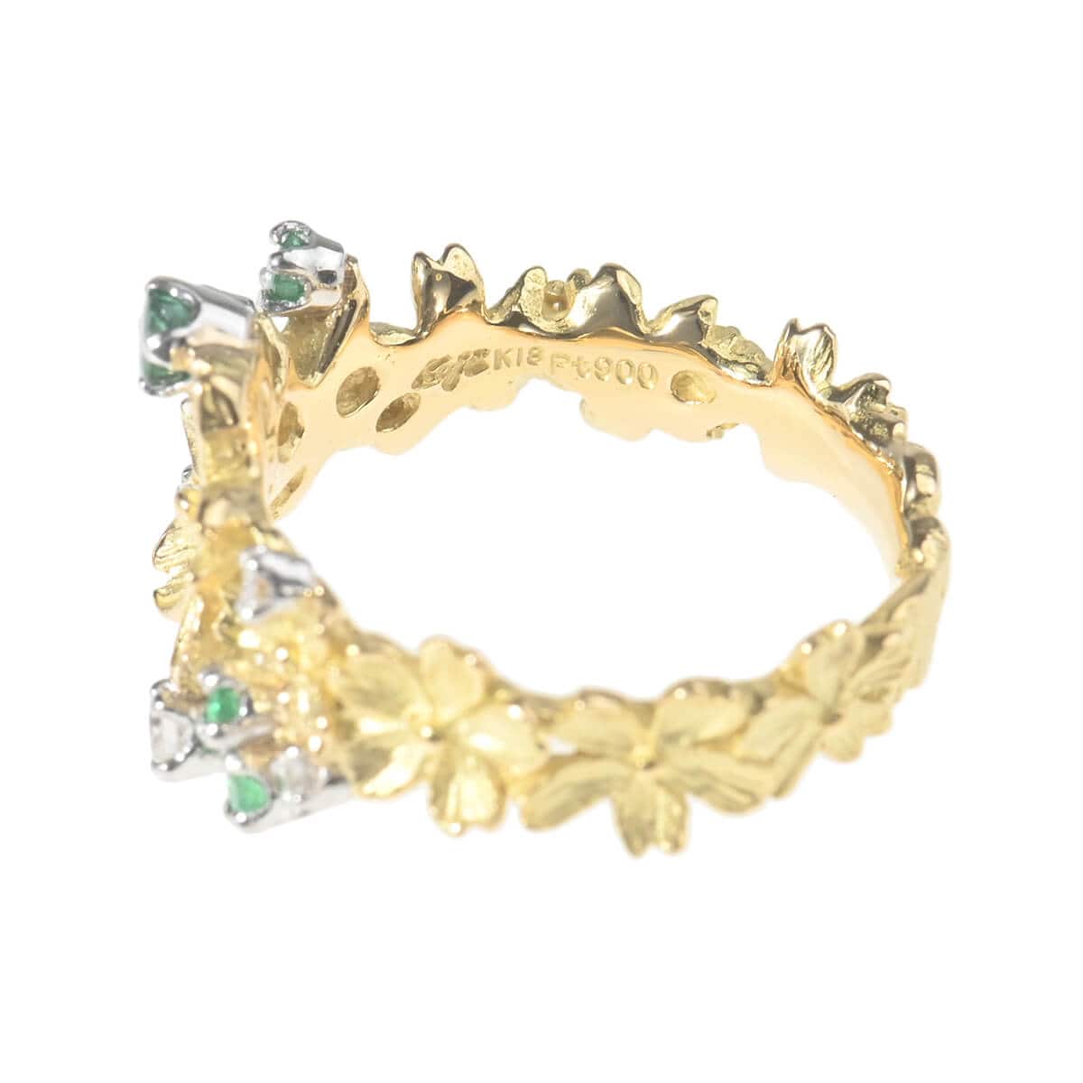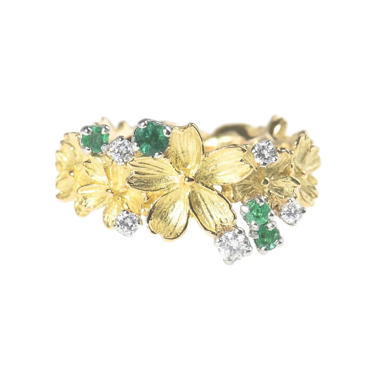 日本伝統の技を駆使し、超絶技巧を極めた色鮮やかなジュエリーをつくり出す、『岩倉 康二(イワクラ コウジ)』。美術館にも認められるアート作品としてのジュエリーデザインをつくり上げてきた、日本が世界に誇るジュエリーデザイナーのひとりです。花びらのしなりや薄さまで、なんとも繊細に表現されたお花が目を惹くリング。繊細なお花のモチーフをサイズがグラデーションになるよう連ねたリングに、朝露のように瑞々しく煌めくダイヤモンドと、印象的なコントラストを魅せる美しいエメラルドが散りばめられています。デザイナーズジュエリーらしい彫金の技術を生かした質感や、芸術的なフォルム、繊細なつくりが何よりも魅力の個性あふれる美しい本格ジュエリーです。