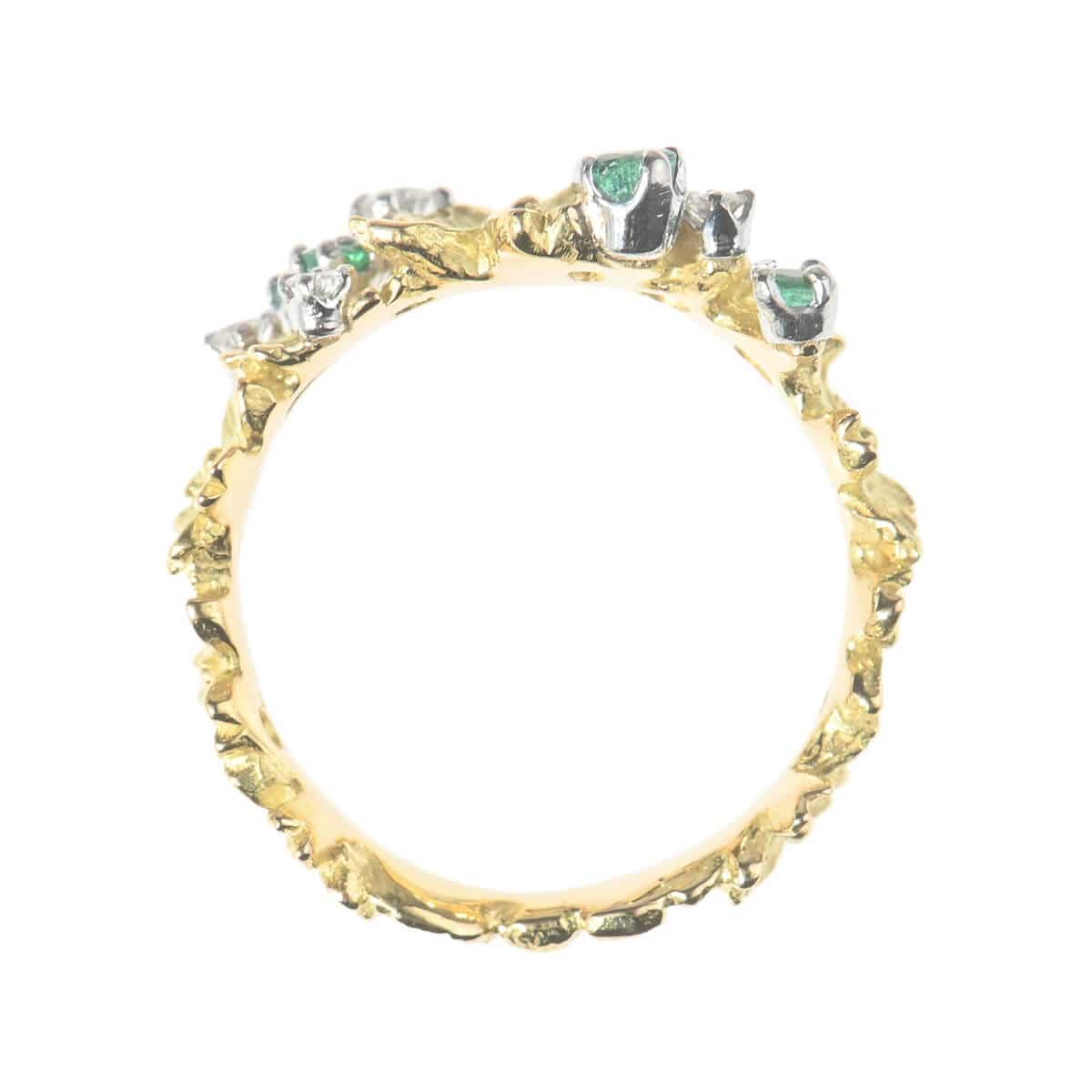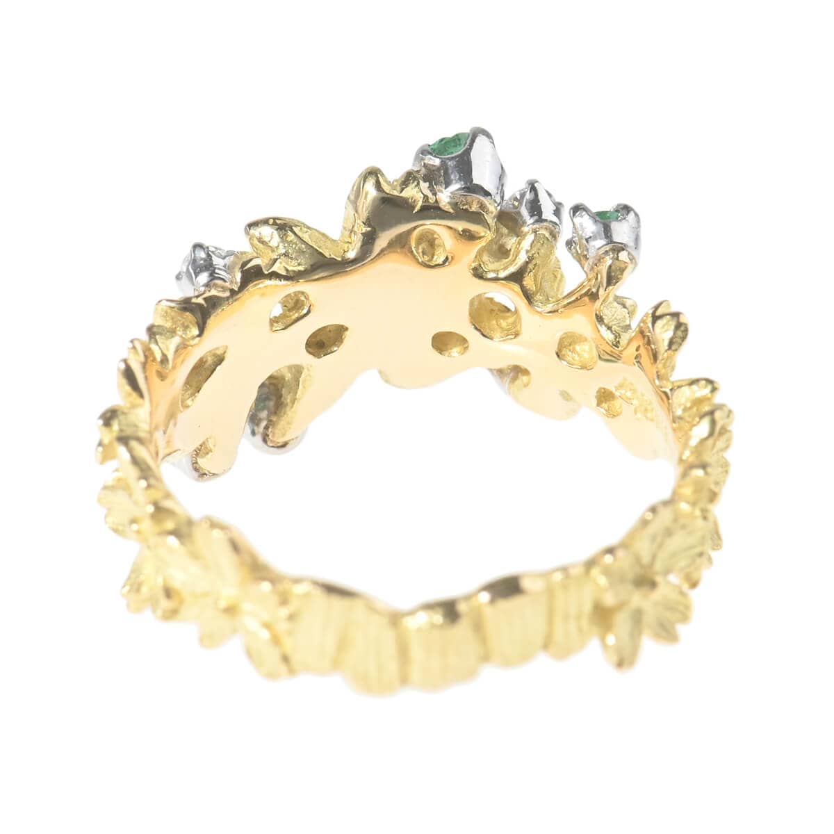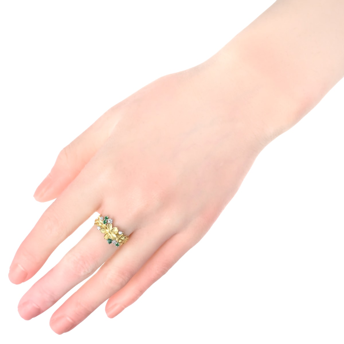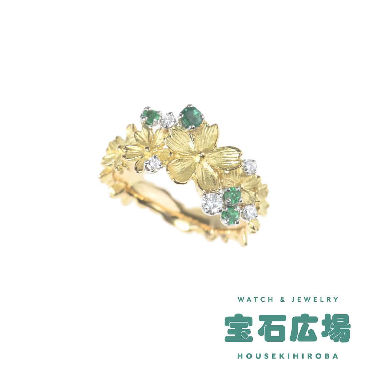 日本伝統の技を駆使し、超絶技巧を極めた色鮮やかなジュエリーをつくり出す、『岩倉 康二(イワクラ コウジ)』。美術館にも認められるアート作品としてのジュエリーデザインをつくり上げてきた、日本が世界に誇るジュエリーデザイナーのひとりです。花びらのしなりや薄さまで、なんとも繊細に表現されたお花が目を惹くリング。繊細なお花のモチーフをサイズがグラデーションになるよう連ねたリングに、朝露のように瑞々しく煌めくダイヤモンドと、印象的なコントラストを魅せる美しいエメラルドが散りばめられています。デザイナーズジュエリーらしい彫金の技術を生かした質感や、芸術的なフォルム、繊細なつくりが何よりも魅力の個性あふれる美しい本格ジュエリーです。