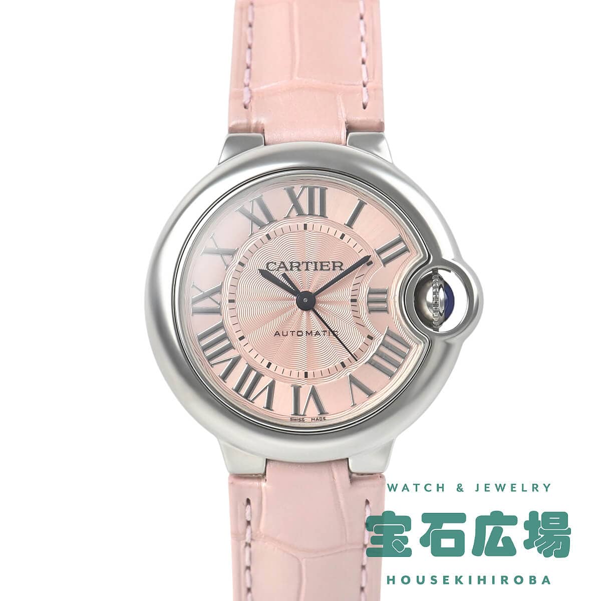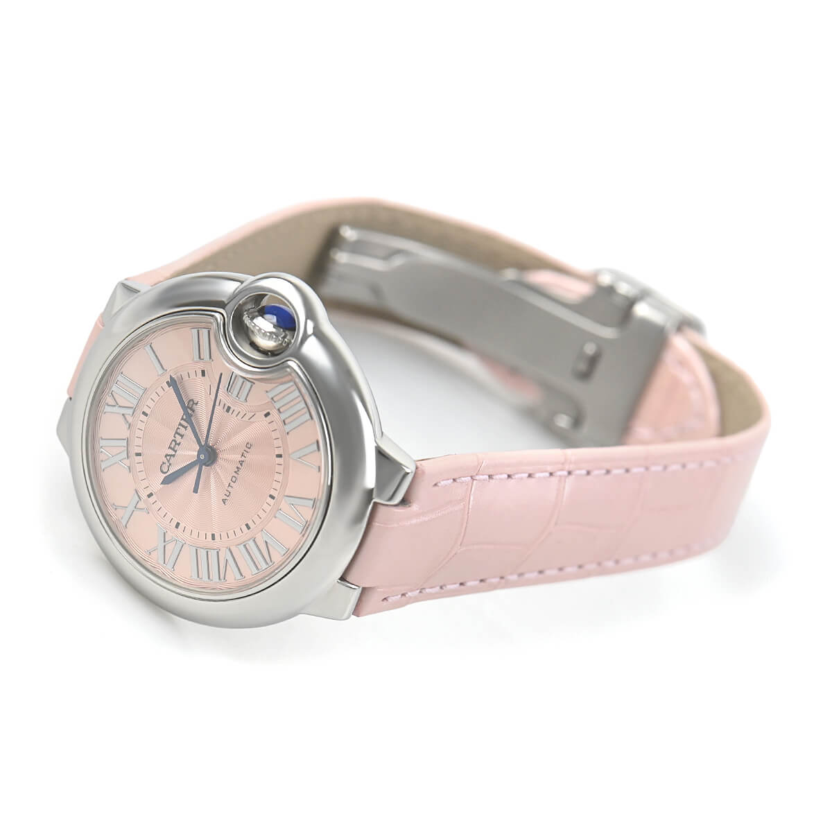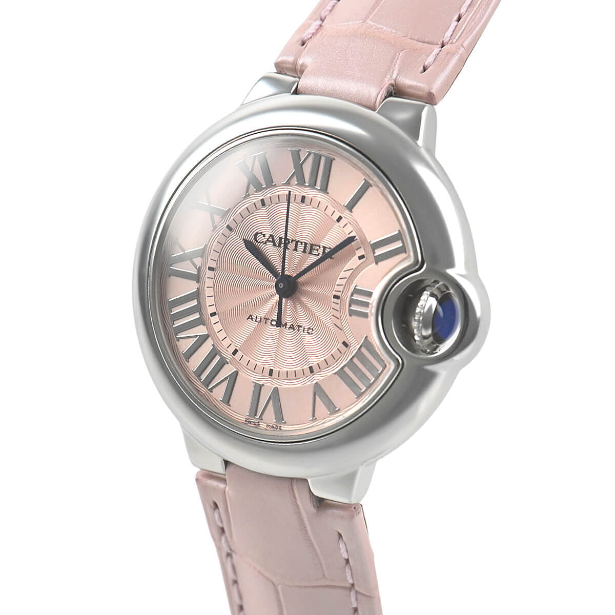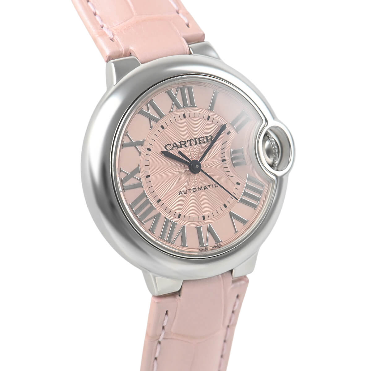 こちらは33mm径のオートマチックモデルで、ピンクダイヤルが可愛らしい一本。