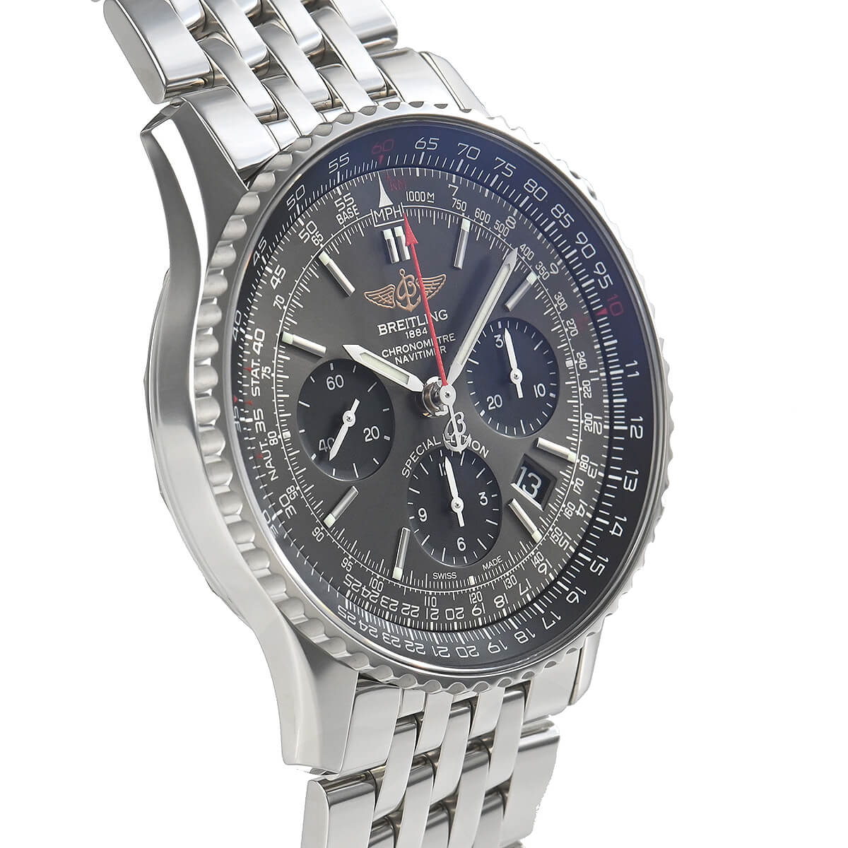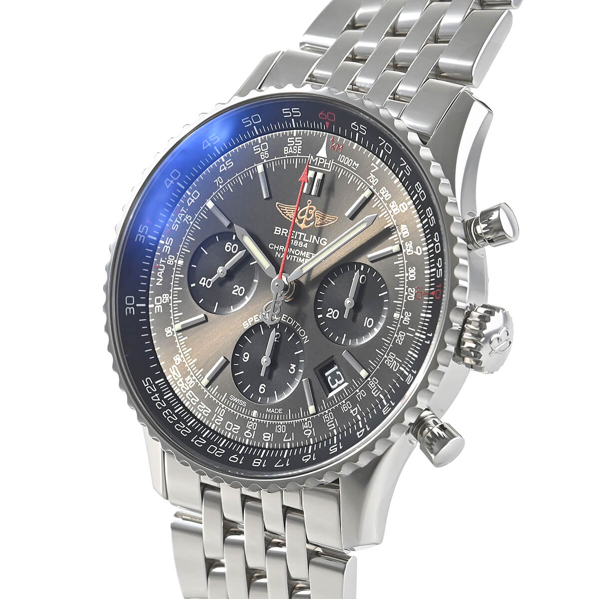 自社開発ムーブメントの「キャリバー01」を搭載したブライトリングの看板モデル「ナビタイマー」。今回入荷したのは、サンバースト仕上げのダークグレー文字盤にブラックのインダイアルを配した特別仕様のモデルで「ナビタイマー01リミテッド ストラトスグレイ」です。