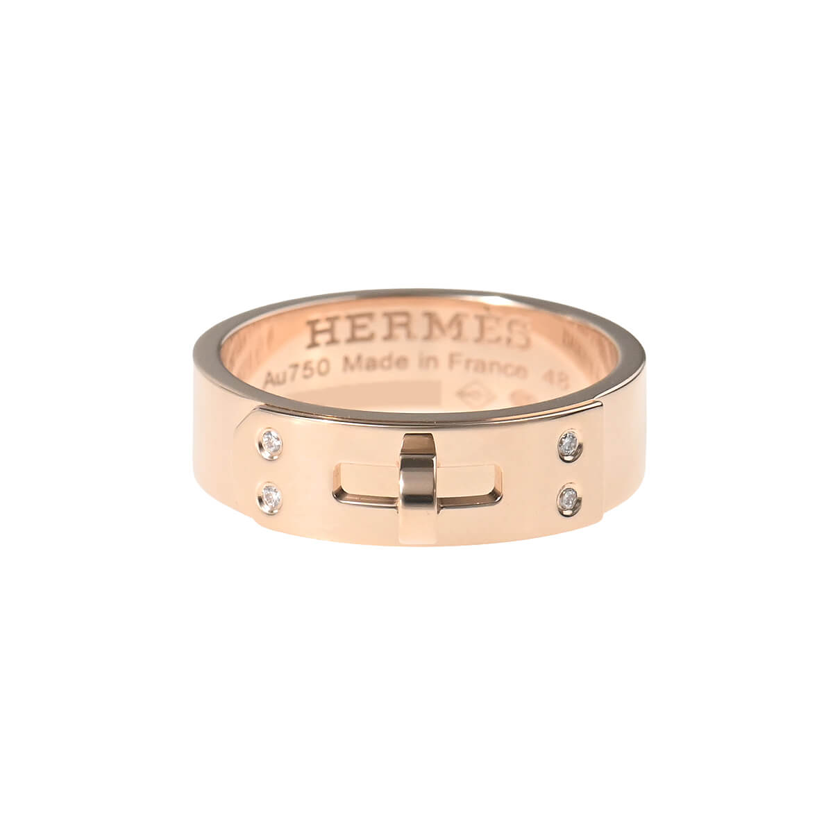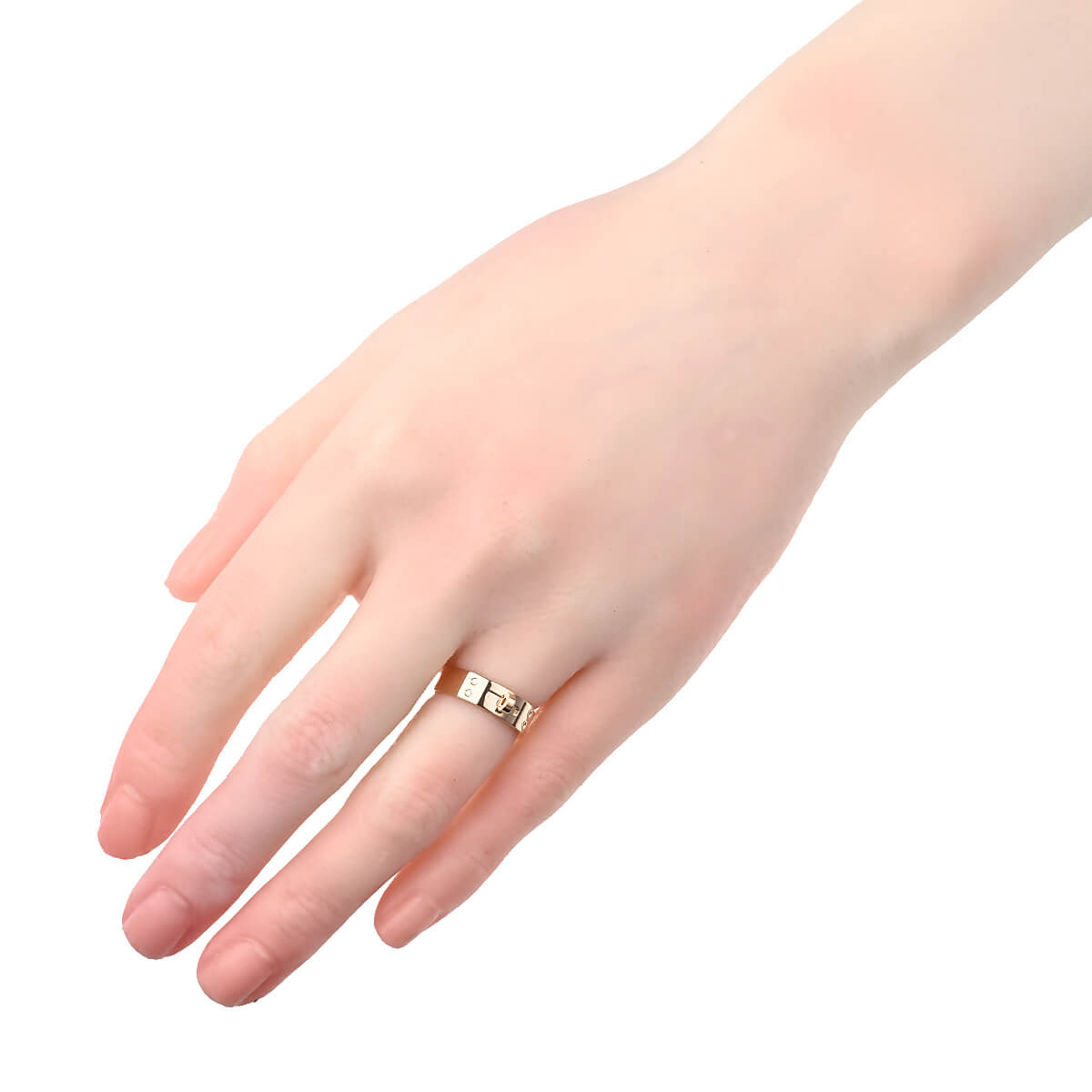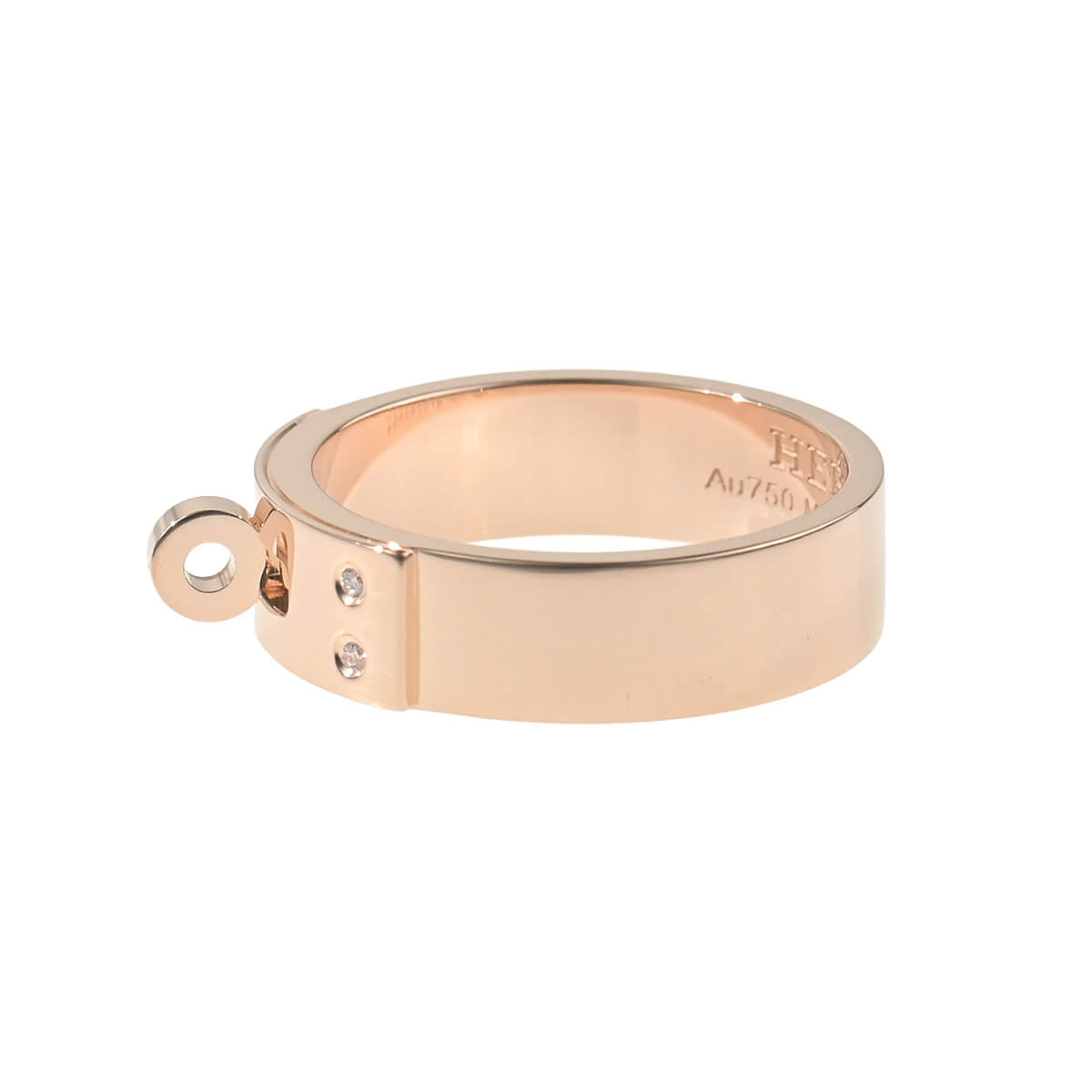 1837年、パリでティエリ・エルメスが高級馬具の製造工房として創業し、職人によるものづくりとそれに関わるすべての人を大切にするという価値観を守り続けている、歴史ある世界的ブランド『HERMES(エルメス)』。1930年代にエルメス家の一員ロベール・デュマの手によって誕生した、のちの1956年に「ケリー」と命名され、世界でもっとも有名なバッグのひとつになる「ケリー」バッグの、まさにそれ自体がジュエリーのような留め金である“トゥレ・クラスプ”や、鍵を収納するレザーケースは、さまざまなジュエリーに昇華しています。その“トゥレ・クラスプ”がデザインされた、PMサイズのピンクゴールド製リング。モチーフの四隅には小さいながらもきらめくダイヤモンドがデザインされ、リングに美しいアクセントを添えています。洗練されたエルメスならではのお洒落な雰囲気を楽しめる、アイコニックなジュエリーです。