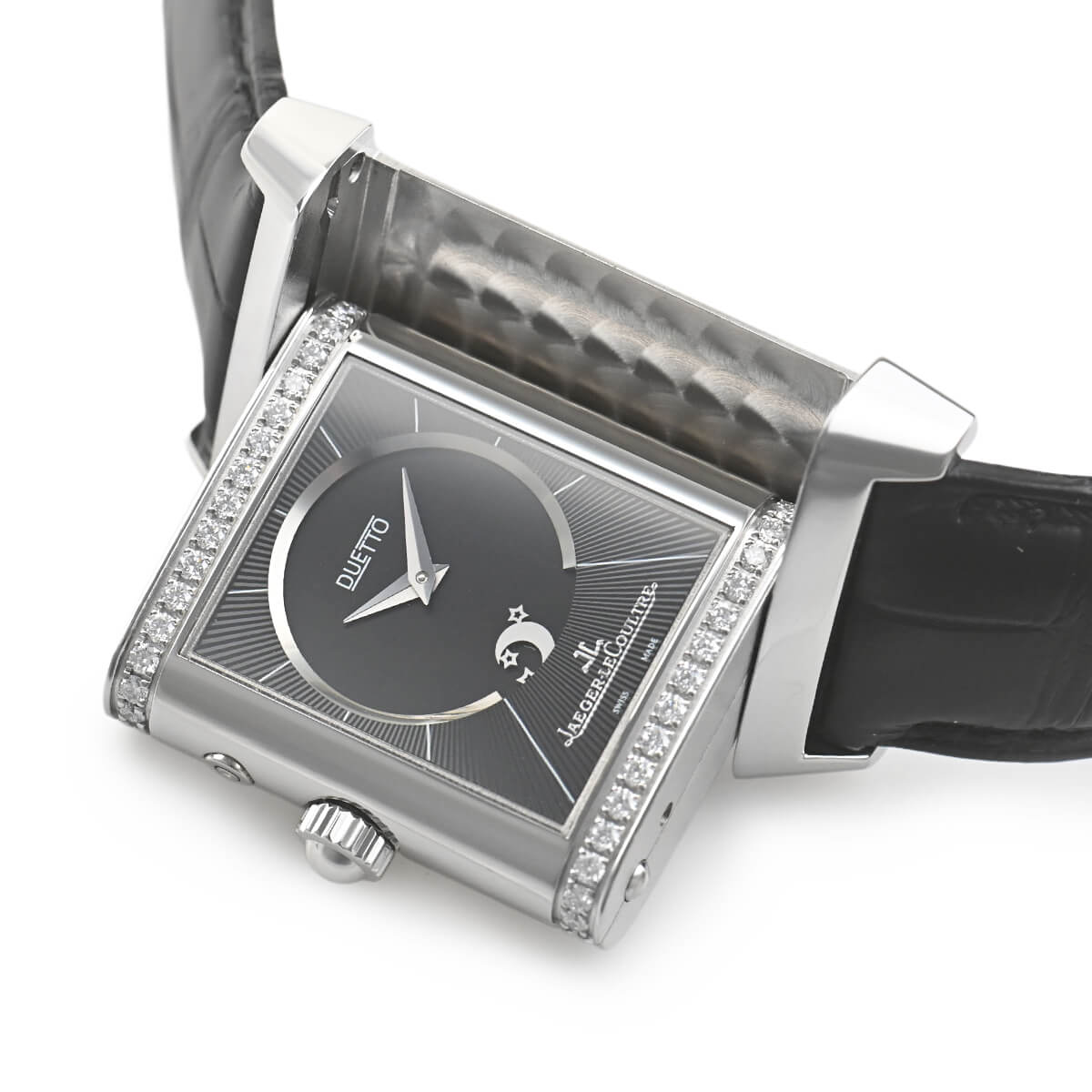 レベルソの反転ケースを活かして表と裏でホームタイムとローカルタイムの2つの異なる時間帯が表示可能な「レベルソ デュエット デュオ」。表・裏を同じタイムゾーンにすることも可能ですので、TPOに合わせて二つのダイヤルの雰囲気を楽しめます。