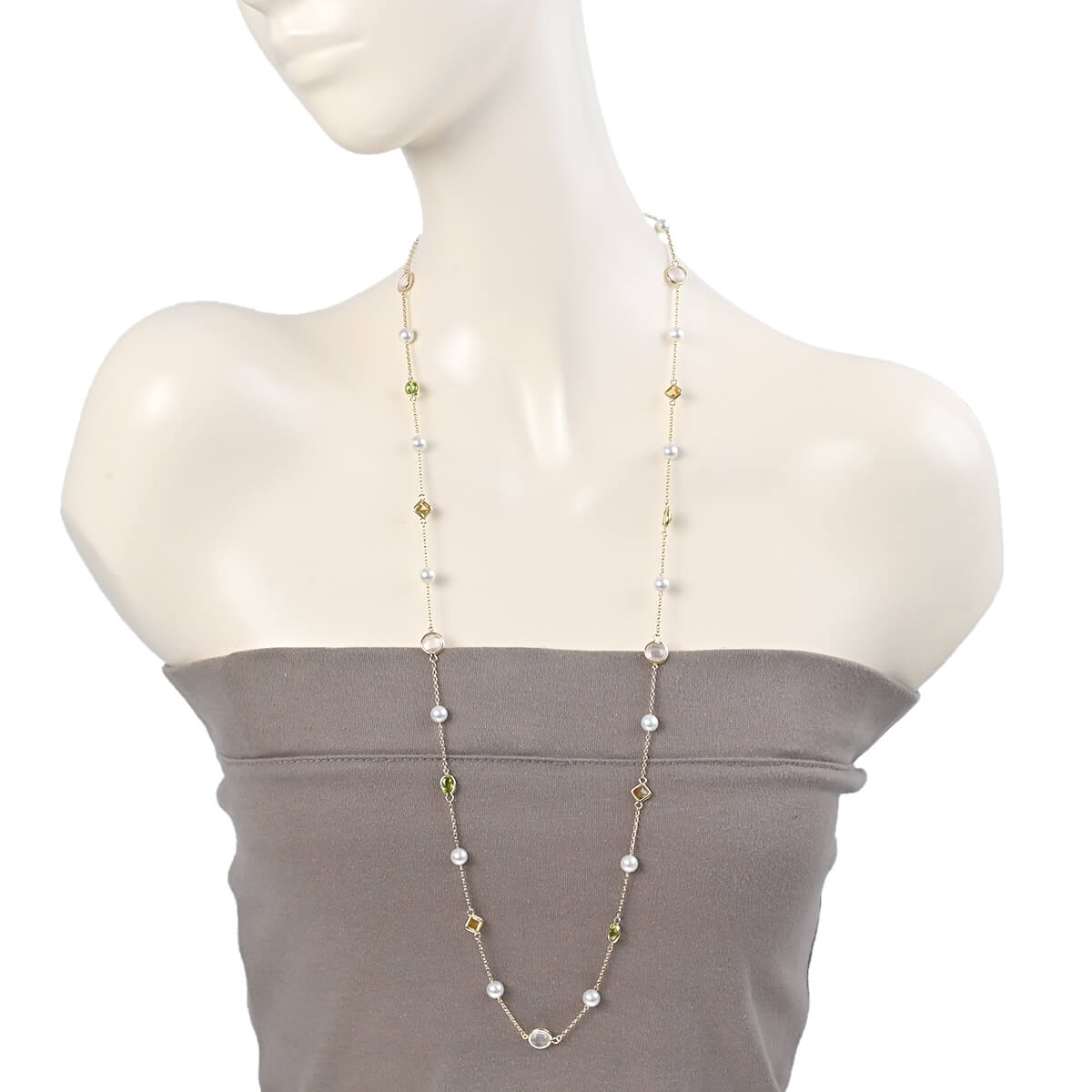 1893年に世界で初めて真珠の養殖に成功し、真珠に生涯を捧げ、「Pearl King(真珠王)」とまで呼ばれ歴史にその名を刻んだ「御木本幸吉」が、“世界中の女性を真珠で飾りたい”と夢を抱いて創業した『MIKIMOTO(ミキモト)』。以来、養殖真珠のオリジネーターとして120年以上も真珠の魅力と向き合い、“真珠と言えばMIKIMOTO”と言われるほどに誰もが知る、日本を代表する世界のジュエラーとなりました。ミキモトが厳選した優しく柔らかな光を放つパールとゴールドで包み込まれたトパーズ、ペリドット、ローズクオーツと、色鮮やかなセミプレシャスストーンが繊細なチェーンにステーションセッティングされた、イエローゴールド製ロングチェーンネックレスです。多面のファセットが施された透明感あふれる美しいセミプレシャスストーンと、クリーンで品格ある美しさをもつパールがあいまって、優し気で、エレガントな存在感を放ちます。そのままロングネックレスとして、また2重に巻いて2連のネックレスとしてはもちろん、後ろに長く垂らして大きく開いた背中を美しく飾ることも。自分だけの個性を楽しみながら、スタイリングに華やかな彩りを添えてくれる美しいファインジュエリーです。