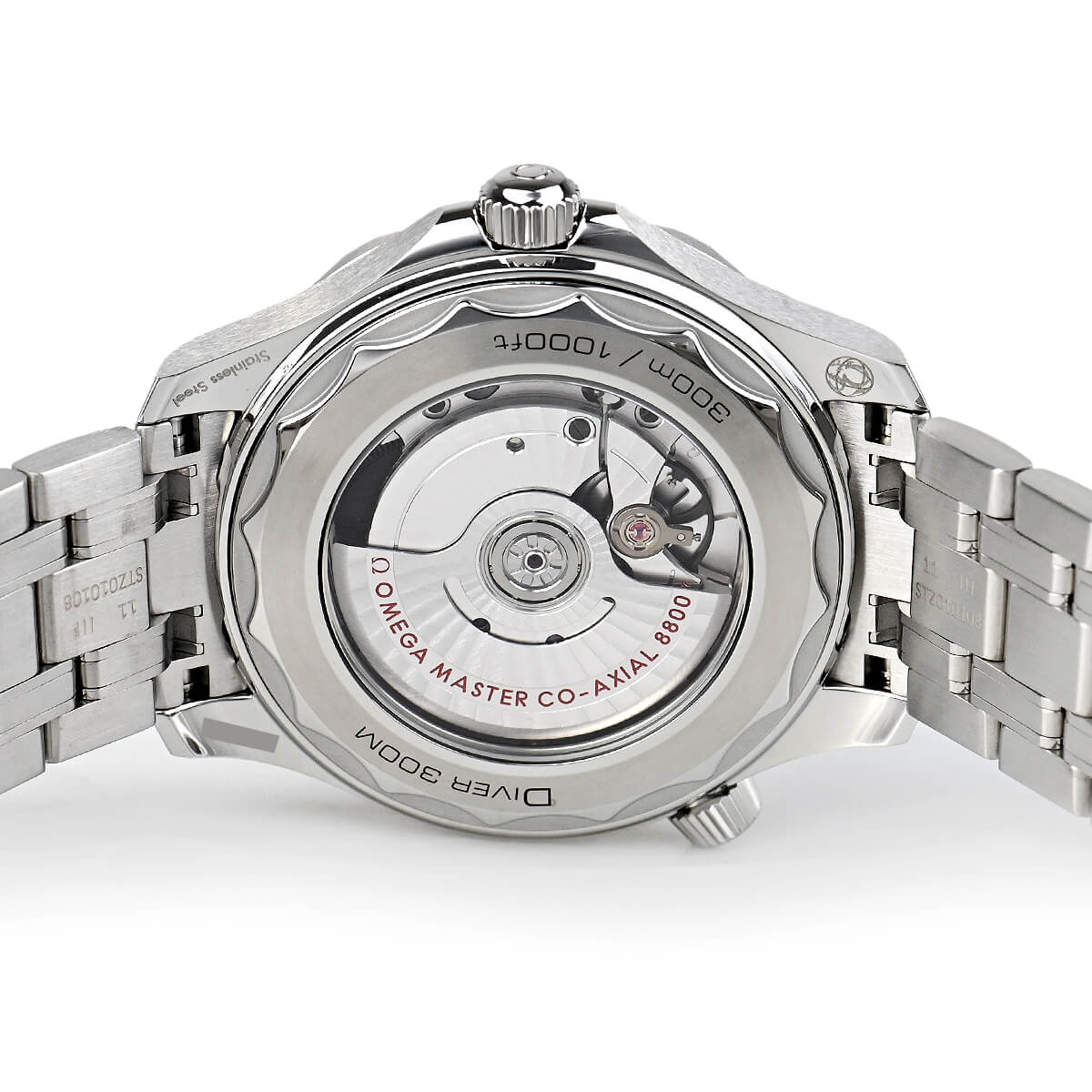 シースルーバックから覗く美しいムーブメントにはスイス連邦計量・認定局(METAS)が認定したマスタークロノメーターのキャリバー8800を搭載します。