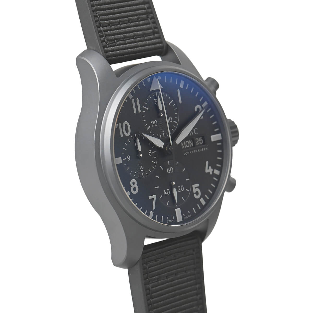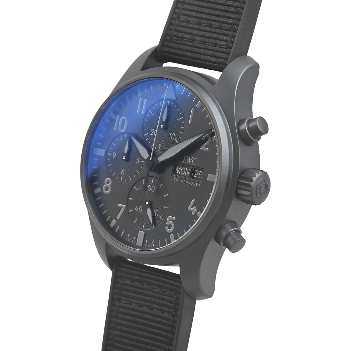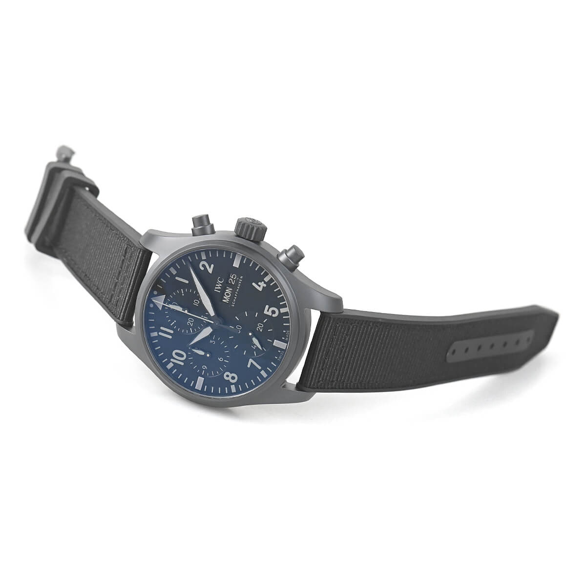 【パイロットウォッチ クロノグラフ41 トップガン セラタニウム】は、ケース、リューズ、プッシュボタンにIWCが自社開発したセラタニウムを使用したモデル。セラタニウムはIWCが5年もの歳月を掛けて開発した新素材となり、チタニウムと同程度の軽さと堅牢性を持ち、更にセラミックと同様の硬度と耐傷性を備えます。